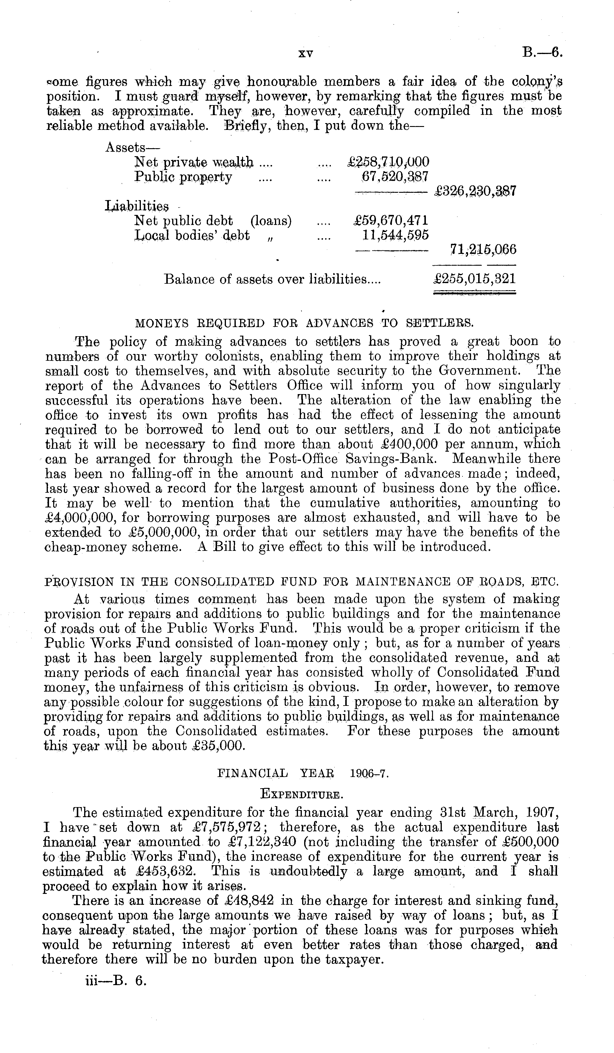 some figures which may give honourable members a fair idea of the colony's position. I must guard myself, however, by remarking that the figures must be taken as approximate. They are, however, carefully compiled in the most reliable method available. Briefly, then, I put down the— Assets— Net private wealth .... .... £258,710,000 Public property .... .... 67,520,387 — £326,230,387 Liabilities Net public debt (loans) .... £59,670,471 Local bodies' debt „ .... 11,544,595 71,215,066 Balance of assets over liabilities.... £255,015,321 MONEYS REQUIRED FOR ADVANCES TO SETTLERS. The policy of making advances to settlers has proved a great boon to numbers of our worthy colonists, enabling them to improve their holdings at small cost to themselves, and with absolute security to the Government. The report of the Advances to Settlers Office will inform you of how singularly successful its operations have been. The alteration of the law enabling the office to invest its own profits has had the effect of lessening the amount required to be borrowed to lend out to our settlers, and I do not anticipate that it will be necessary to find more than about £400,000 per annum, which can be arranged for through the Post-Office Sayings-Bank. Meanwhile there has been no falling-off in the amount and number of advances made; indeed, last year showed a record for the largest amount of business done by the office. It may be well to mention that the cumulative authorities, amounting to £4,000,000, for borrowing purposes are almost exhausted, and will have to be extended to £5,000,000, in order that our settlers may have the benefits of the cheap-money scheme. A Bill to give effect to this will be introduced. PROVISION IN THE CONSOLIDATED FUND FOR MAINTENANCE OF ROADS, ETC. At various times comment has been made upon the system of making provision for repairs and additions to public buildings and for the maintenance of roads out of the Public Works Fund. This would be a proper criticism if the Public Works Fund consisted of loan-money only ; but, as for a number of years past it has been largely supplemented from the consolidated revenue, and at many periods of each financial year has consisted wholly of Consolidated Fund money, the unfairness of this criticism is obvious. In order, however, to remove any possible colour for suggestions of the kind, I propose to make an alteration by providing for repairs and additions to public buildings, as well as for maintenance of roads, upon the Consolidated estimates. For these purposes the amount this year will be about £35,000. FINANCIAL YEAR 1906-7. Expenditure. The estimated expenditure for the financial year ending 31st March, 1907, I have set down at £7,575,972; therefore, as the actual expenditure last financial year amounted to £7,122,340 (not including the transfer of £500,000 to the Public Works Fund), the increase of expenditure for the current year is estimated at £453,632. This is undoubtedly a large amount, and I shall proceed to explain how it arises. There is an increase of £-18,842 in the charge for interest and sinking fund, consequent upon the large amounts we have raised by way of loans; but, as I have already stated, the major portion of these loans was for purposes which would be returning interest at even better rates than those charged, and therefore there will be no burden upon the taxpayer.