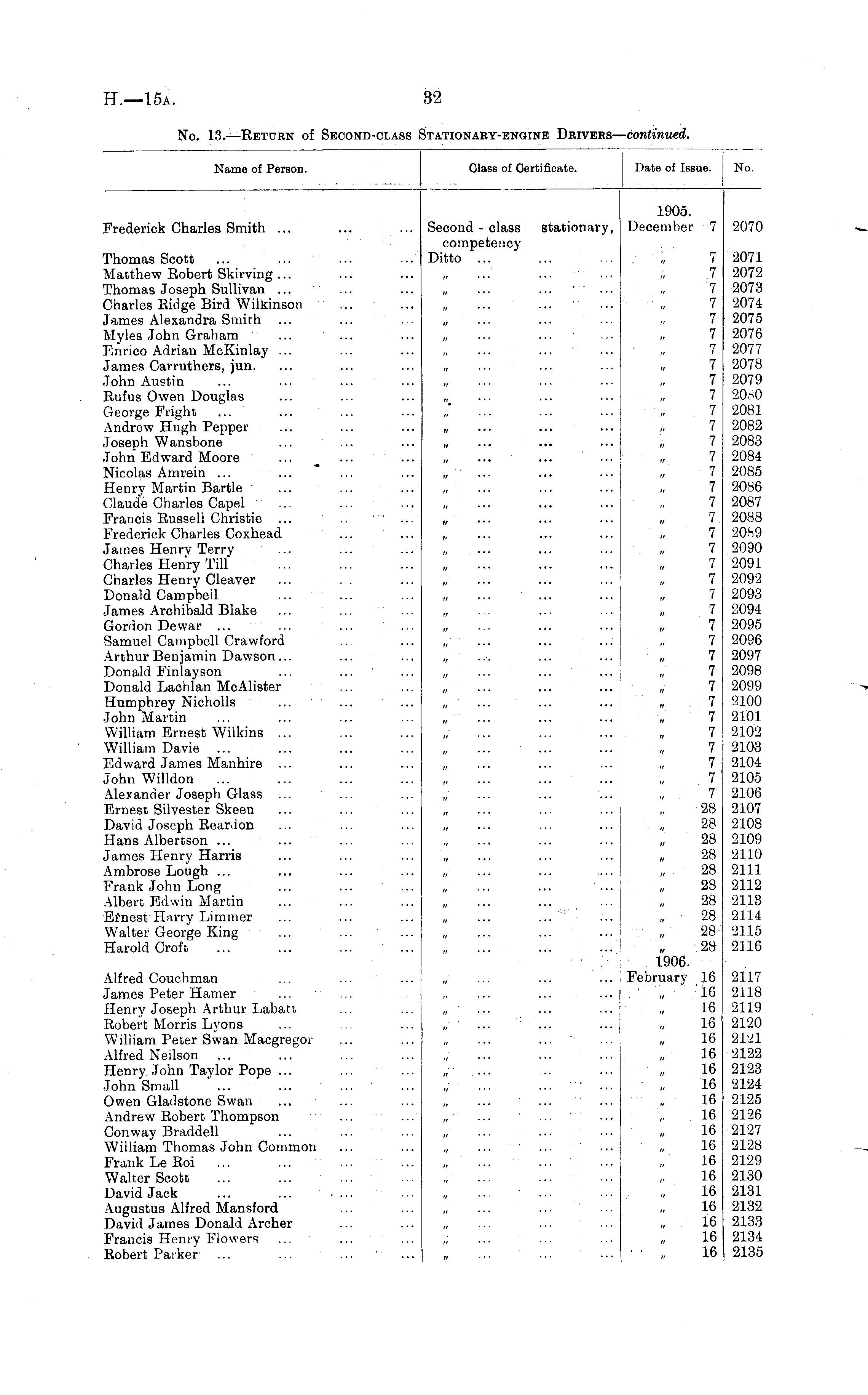 Name of Person. Class of Certificate. Date of Issue. No. Frederick Charles Smith ... Second - class competency Ditto ... stationary, 1905. December 7 2070 Thomas Scott Matthew Robert Skirving ... Thomas Joseph Sullivan ... Charles Ridge Bird Wilkinson James Alexandra Smith Myles John Graham Enrico Adrian McKinlay ... James Carruthers, jun. John Austin Rufus Owen Douglas George Fright Andrew Hugh Pepper Joseph Wansbone John Ed ward Moore Nicolas Amrein ... Henry Martin Bartle Claude Charles Capel Francis Russell Christie ... Frederick Charles Coxhead James Henry Terry Charles Henry Till Charles Henry Cleaver Donald Campbell James Archibald Blake Gordon Dewar Samuel Campbell Crawford Arthur Benjamin Dawson... Donald Finlayson Donald Lachlan McAlister Humphrey Nicholls John Martin William Ernest Wilkins ... William Davie Edward James Manhire John Willdon Alexander Joseph Glass ... Ernest Silvester Skeen David Joseph Rear.ion Hans Albertson ... James Henry Harris Ambrose Lough ... Frank John Long Albert Edwin Martin Efnest Harry Limmer Walter George King Harold Croft it • • • it it i. •.. \i 7 7 '7 7 7 7 7 7 7 7 7 7 7 7 7 7 7 7 7 7 7 7 7 7 7 7 7 7 7 7 7 7 7 7 7 7 28 28 28 28 28 28 28 28 28 28 1906. 2071 2072 2073 2074 2075 2076 2077 2078 2079 2081 2082 2083 2084 2085 2086 2087 2088 20H9 2090 2091 2092 2093 2094 2095 2096 2097 2098 2099 2100 2101 2102 2103 2104 2105 2106 2107 2108 2109 2110 2111 2112 2113 2114 2115 2116 n • • ■ Alfred Couchman James Peter Hamer Henry Joseph Arthur Labatt Robert Morris Lyons William Pecer Swan Macgregor Alfred Neilson Henry John Taylor Pope ... John Small Owen Gladstone Swan Andrew Robert Thompson Con way Braddell William Thomas John Common Frank Le Roi Walter Scott David Jack Augustus Alfred Mansford David James Donald Archer Francis Henry Flowers Robert Parker February 16 16 16 16 16 16 16 16 16 16 16 16 16 16 16 16 16 16 16 2117 2118 2119 2120 21-21 2122 2123 2124 2125 2126 2127 2128 2129 2130 2131 2132 2133 2134 2135