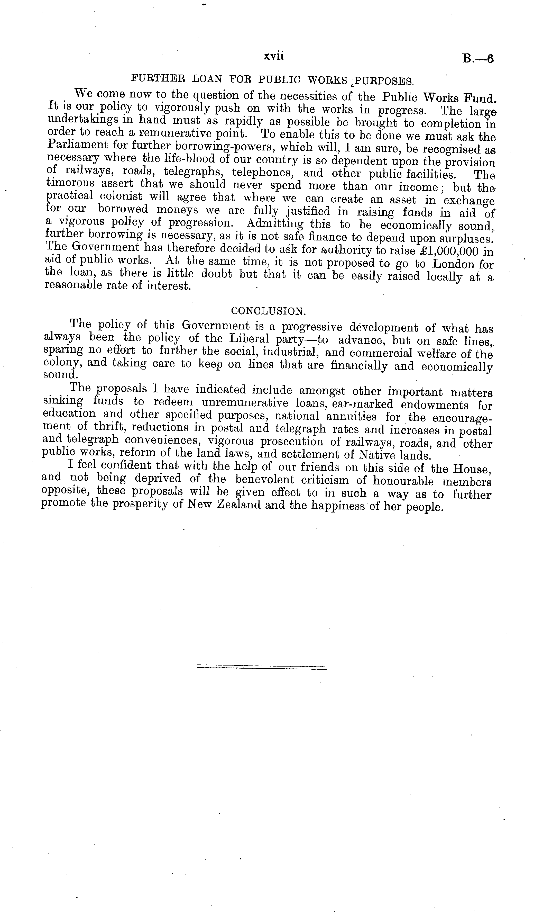 FURTHER LOAN FOR PUBLIC WORKS JPDEPOSES. We come now to the question of the necessities of the Public Works Fund. It is our policy to vigorously push on with the works in progress. The large undertakings in hand must as rapidly as possible be brought to completion in order to reach a remunerative point. To enable this to be done we must ask the Parliament for further borrowing-powers, which will, I am sure, be recognised as necessary where the life-blood of our country is so dependent upon the provision of railways, roads, telegraphs, telephones, and other public facilities. The timorous assert that we should never spend more than our income; but the practical colonist will agree that where we can create an asset in 'exchange for our borrowed moneys we are fully justified in raising funds in aid of a vigorous policy of progression. Admitting this to be economically sound further borrowing is necessary, as it is not safe finance to depend upon surpluses' The Government has therefore decided to ask for authority to raise £1,000,000 in aid of public works. At the same time, it is not proposed to go to London for the loan, as there is little doubt but that it can be easily raised locally at a reasonable rate of interest. CONCLUSION. The policy of this Government is a progressive development of what has always been the policy of the Liberal party—to advance, but on safe lines, sparing no effort to further the social, industrial, and commercial welfare of the colony, and taking care to keep on lines that are financially and economically sound. J The proposals I have indicated include amongst other important matters sinking funds to redeem unremunerative loans, ear-marked endowments for education and other specified purposes, national annuities for the encouragement of thrift, reductions in postal and telegraph rates and increases in postal and telegraph conveniences, vigorous prosecution of railways, roads, and other public works, reform of the land laws, and settlement of Native lands. I feel confident that with the help of our friends on this side of the House, and not being deprived of the benevolent criticism of honourable members opposite, these proposals will be given effect to in such a way as to further promote the prosperity of New Zealand and the happiness of her people.