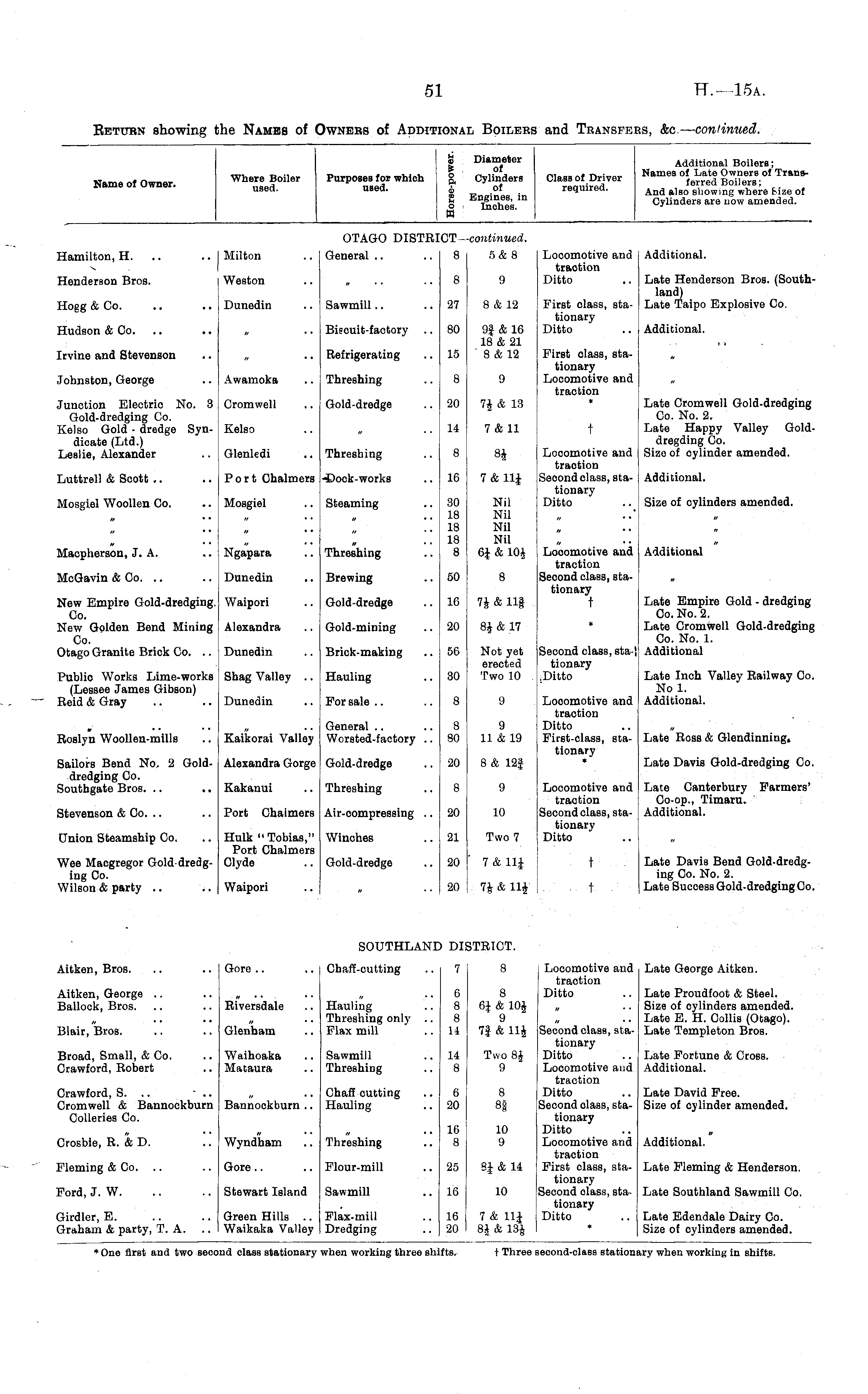 Name of Owner. Where Boiler used. Purposes for which used. v Diameter * of 2 Cylinders 4 of £ Engines, in _2 Inches. M Class of Driver required. Additional Boilers; Names of Late Owners of Transferred Boilers; And also showing where Hze of Cylinders are now amended. OTAGO distr: :ct■continued. Hamilton, H. Milton General 8 5& 8 Locomotive and Additional. traotion Ditto .. Late Henderson Bros. (Southland) First olass, sta- Late Taipo Explosive Co. tionary Ditto .. Additional. Henderson Bros. Weston 8 9 Hogg & Co. Dunedin Sawmill 27 8 & 12 Hudson & Co. Biscuit-factory 80 9f <fe 16 18 & 21 8& 12 Irvine and Stevenson Refrigerating 15 First olass, stationary Locomotive and traotion * Late Cromwell Gold-dredging Co. No. 2. t Late Happy Valley Golddregding Co. Locomotive and Sizo of cylinder amended. traotion Seoond class, sta- Additional. tionary Ditto .. Size of cylinders amended. Johnston, George Awamoka Threshing 8 9 Junction Electric No. 3 Gold-dredging Co. Kelso Gold - dredge Syndicate (Ltd.) Leslie, Alexander Cromwell Gold-dredge 20 74 & 13 Kelso 14 7& 11 Glenledi Threshing 8 84 Luttrell & Scott Port Chalmers -Dock-works 16 7&Hi Mosgiel Woollen Co. Mosgiel Steaming 30 18 18 18 8 Nil Nil Nil Nil 6J & 104 Maopherson, J. A. MoGavin & Co. .. New Empire Gold-dredging. Co. New Golden Bend Mining Co. Otago Granite Brick Co. .. Ngapara Dunedin Waipori Alexandra Dunedin Threshing Brewing Gold-dredge Gold-mining Brick-making 50 16 20 56 8 n & hi 84 & 17 Not yet erected Two 10 Locomotive and Additional traction Second class, sta- „ tionary t Late Empire Gold - dredging Co. No. 2. Late Cromwell Gold-dredging Co. No. 1. Second class, sta-! Additional tionary Ditto Late Inch Valley Railway Co. No 1. Looomotive and Additional. traotion Ditto First-class, sta- Late Ross & Glendinning. tionary * Late Davis Gold-dredging Co. Public Works Lime-works (Lessee James Gibson) Reid & Gray Shag Valley .. Hauling 30 Dunedin For sale 8 9 Roslyn Woollen-mills Kaikorai Valley General Worsted-factory .. 8 80 9 11 &19 Sailors Bend No. 2 Golddredging Co. Southgate Bros. Alexandra Gorge Gold-dredge 20 8 & 12} Kakanui Threshing 8 9 Locomotive and Late Canterbury Farmers' traction Co-op., Timaru. .Second olass, sta- Additional, tionary Ditto Stevenson & Co. Port Chalmers Air-compressing .. 20 10 Union Steamship Co. Hulk "Tobias," Port Chalmers Clyde Winches Gold-dredge 21 20 Two 7 t Late Davis Bend Gold-dredg-ing Co. No. 2. t Late Success Gold-dredging Co. Wee Macgregor Gold dredging Co. Wilson & party Waipori 20 7 Alii 7J & 114 Gore SOUTHLAN1 ) DIS STRICT. Aitken, Bros. Chaff-cutting 7 8 Locomotive and Late George Aitken. traction Ditto .. Late Proudfoot & Steel. .. Size of cylinders amended. .. Late E. H. Collis (Otago). Second class, sta- Late Templeton Bros. tionary Ditto .. Late Fortune & Cross. Locomotive and Additional. traction Ditto .. Late David Free. Second olass, sta- Size of cylinder amended. tionary Ditto Locomotive and Additional. traotion First class, sta- Late Fleming & Henderson. tionary Second class, sta- Late Southland Sawmill Co. tionary Ditto .. Late Edendale Dairy Co. Size of cylinders amended. Aitken, George Ballock, Bros. Riversdale Hauling Threshing only Flax mill 6 8 8 14 8 6£ & 104 9 7} & 114 Blair, Bros. Glenham Broad, Small, & Co. Crawford, Robert Waihoaka Mataura Sawmill Threshing 14 8 Two 8J 9 Crawford, S. .. Cromwell & Bannockburn Colleries Co. Bannookburn .. Chaff cutting Hauling 6 20 8 88 Crosbie, R. & D. Wyndham Threshing 16 8 10 9 Fleming & Co. Gore Flour-mill 25 8J& 14 Ford, J. W. Stewart Island Sawmill 16 10 Girdler, E. Graham & party, T. A. Green Hills .. Waikaka Valley Flax-mill Dredging 16 20 7& 11J 84 & 18J