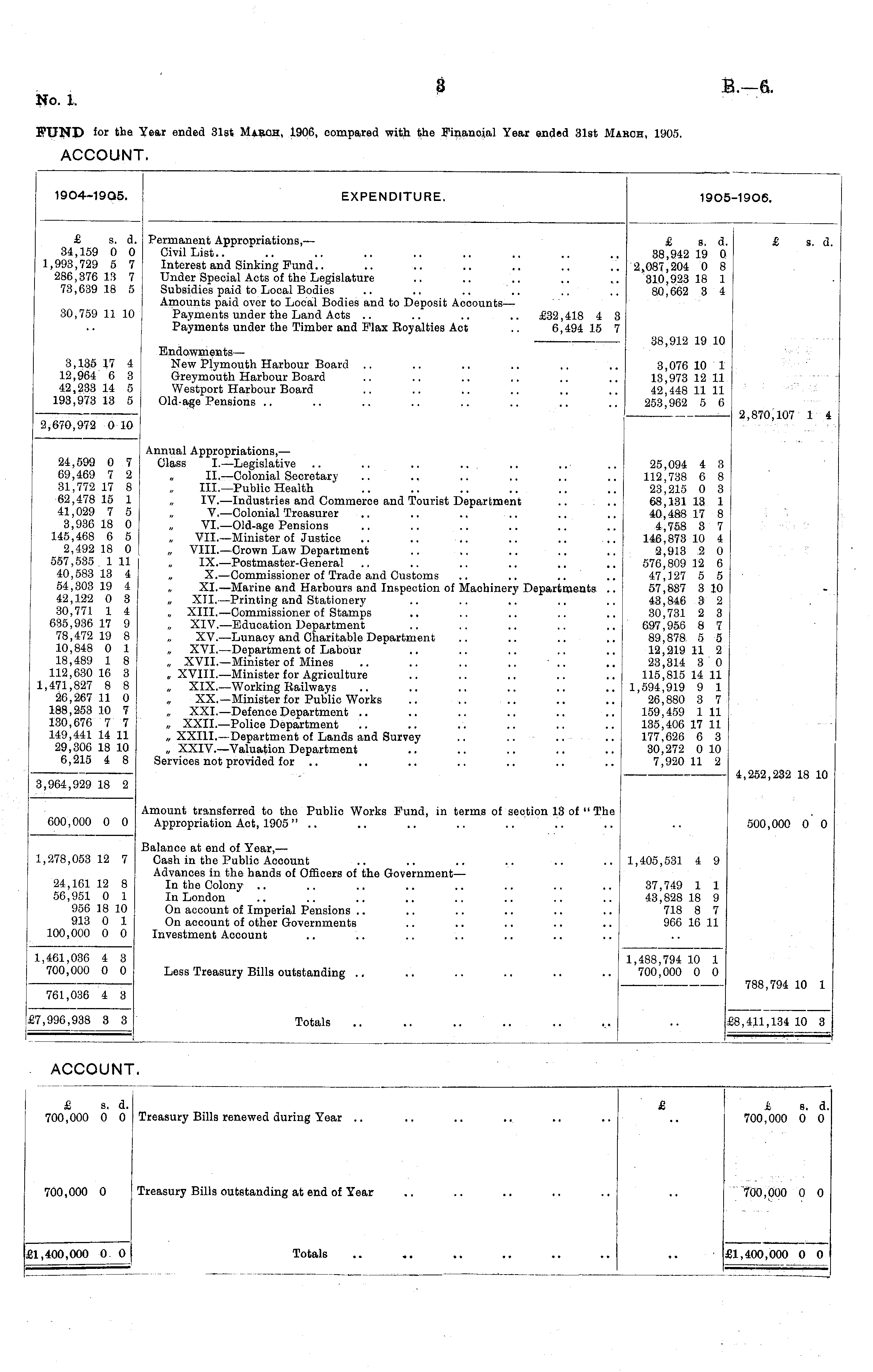 OUN 1904-1905. EXPENDITURE. 1905-1906. £ s. d. 34,159 0 0 1,993,729 5 7 286,376 13 7 73,639 18 5 Permanent Appropriations,— Civil List Interest and Sinking Fund.. Under Special Acts of the Legislature Subsidies paid to Local Bodies Amounts paid over to Local Bodies and to Deposit Accounts— Payments under the Land Acts .. .. .. .. £32,418 4 3 Payments under the Timber and Flax Royalties Act .. 6,494 15 7 £ s. d. 38,942 19 0 2,087,204 0 8 310,923 18 1 80,662 3 4 I £ s. d. 30,759 11 10 38,912 19 10 3,135 17 4 12,964 6 3 42,233 14 5 193,973 13 5 Endowments— New Plymouth Harbour Board Greymouth Harbour Board Westport Harbour Board Old-age Pensions 3,076 10 1 13,973 12 11 42,448 11 11 253,962 5 6 2,870,107 1 4 2,670,972 0 10 24,599 0 7 69,469 7 2 31,772 17 8 62,478 15 1 41,029 7 5 3,936 18 0 145,468 6 5 2,492 18 0 557,535 1 11 40,583 13 4 54,303 19 4 42,122 0 3 30,771 1 4 635,936 17 9 78,472 19 8 10,848 0 1 18,489 1 8 112,630 16 3 1,471,827 8 8 26,267 11 0 188,253 10 7 130,676 7 7 149,441 14 11 29,306 18 10 6,215 4 8 Annual Appropriations,— Class I.—Legislative II. —Colonial Secretary III.—Public Health IV.—Industries and Commeroe and Tourist Department .. .. V. —Colonial Treasurer VI.—Old-age Pensions VII.—Minister of Justice „ VIII.—Crown Law Department IX.—Postmaster-General X.—Commissioner of Trade and Customs XI.—Marine and Harbours and Inspection of Machinery Departments .. XII. —Printing and Stationery XIII.—Commissioner of Stamps XIV.—Education Department XV.—Lunacy and Charitable Department XVI.—Department of Labour „ XVII.—Minister of Mines „ XVIII.—Minister for Agriculture XIX.—Working Railways XX.—Minister for Public Works XXI.—Defence Department .. „ XXII.—Police Department „ XXIII.—Department of Lands and Survey „ XXIV.—Valuation Department Services not provided for .. 25,094 4 3 112,738 6 8 23,215 0 3 68,131 13 1 40,488 17 8 4,758 3 7 146,873 10 4 2,913 2 0 576,809 12 6 47,127 5 5 57,837 3 10 43,846 3 2 30,731 2 3 697,956 8 7 89,878 5 5 12,219 11 2 23,314 3 0 115,815 14 11 1,594,919 9 1 26,880 3 7 159,459 1 11 135,406 17 11 177,626 6 3 30,272 0 10 7,920 11 2 4,252,232 18 10 3,964,929 18 2 Amount transferred to the Public Works Fund, in termB of section 13 of " The Appropriation Act, 1905 " .. 500,000 0 0 600,000 0 0 1,278,053 12 7 24,161 12 8 56,951 0 1 956 18 10 913 0 1 100,000 0 0 Balance at end of Year, — Cash in the Public Account Advances in the hands of Officers of the Government — In the Colony In London On account of Imperial Pensions On account of other Governments Investment Account 1,405,531 4 9 37,749 1 1 43,828 18 9 718 8 7 966 16 11 1,461,036 4 3 700,000 0 0 Less Treasury Bills outstanding 1,488,794 10 1 700,000 0 0 788,794 10 1 761,036 4 3 Totals i £8,411,134 10 3 [£7,996,938 3 3 ACCOUNT, £ s. d. 700,000 0 0 Treasury Bills renewed during Year .. £ jfc s. d. 700,000 0 0 700,000 0 Treasury Bills outstanding at end of Year 700,000 0 0 Totals £1,400,000 0 0 SI,400,000 0 0