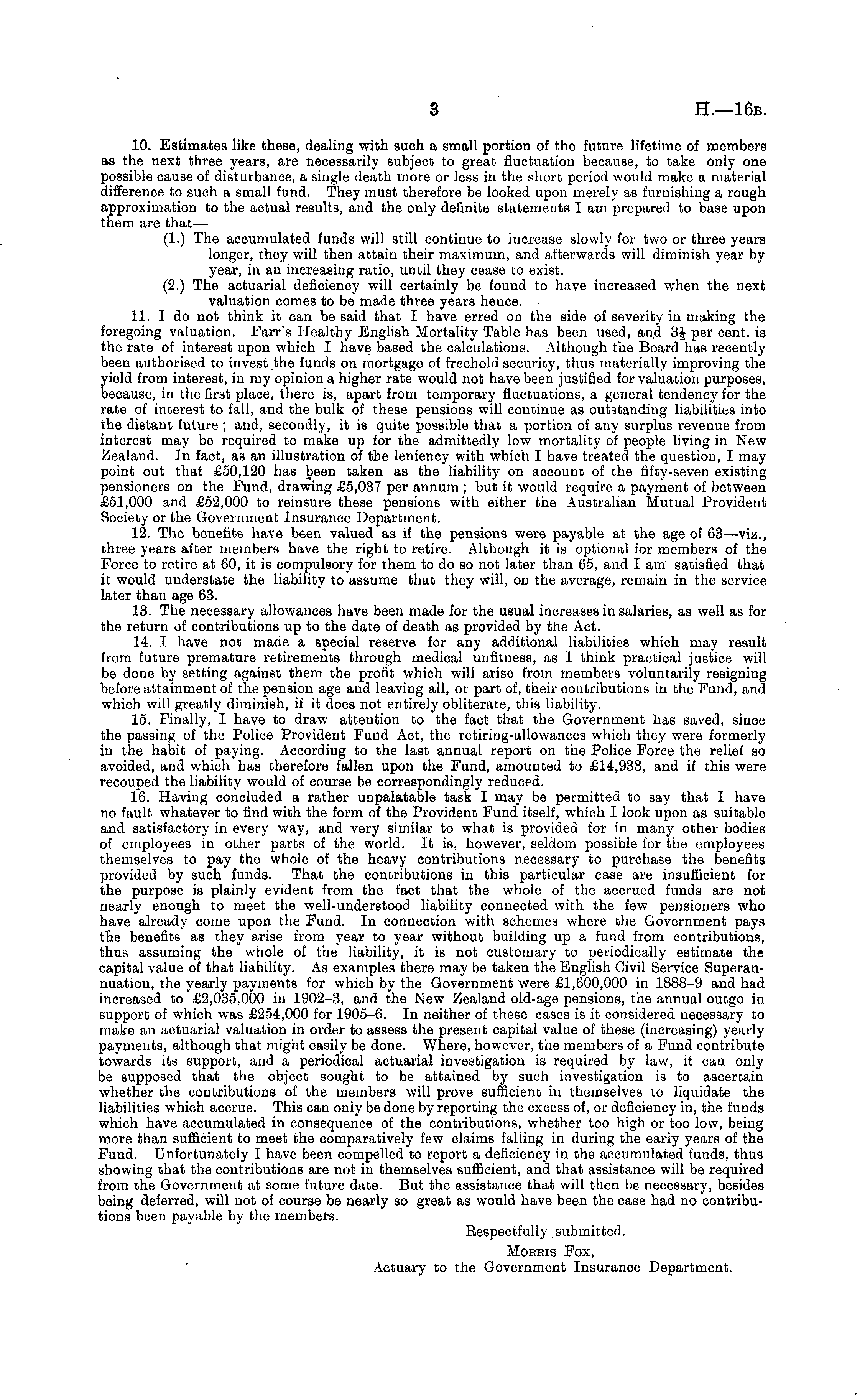 10. Estimates like these, dealing with such a small portion of the future lifetime of members as the next three years, are necessarily subject to great fluctuation because, to take only one possible cause of disturbance, a single death more or less in the short period would make a material difference to such a small fund. They must therefore be looked upon merely as furnishing a rough approximation to the actual results, and the only definite statements I am prepared to base upon them are that— (1.) The accumulated funds will still continue to increase slowly for two or three years longer, they will then attain their maximum, and afterwards will diminish year by year, in an increasing ratio, until they cease to exist. (2.) The actuarial deficiency will certainly be found to have increased when the next valuation comes to be made three years hence. 11. I do not think it can be said that I have erred on the side of severity in making the foregoing valuation. Farr's Healthy English Mortality Table has been used, and 3% per cent, is the rate of interest upon which I have based the calculations. Although the Board has recently been authorised to invest the funds on mortgage of freehold security, thus materially improving the yield from interest, in my opinion a higher rate would not have been justified for valuation purposes, because, in the first place, there is, apart from temporary fluctuations, a general tendency for the rate of interest to fall, and the bulk of these pensions will continue as outstanding liabilities into the distant future ; and, secondly, it is quite possible that a portion of any surplus revenue from interest may be required to make up for the admittedly low mortality of people living in New Zealand. In fact, as an illustration of the leniency with which I have treated the question, I may point out that £50,120 has been taken as the liability on account of the fifty-seven existing pensioners on the Fund, drawing £5,037 per annum ; but it would require a payment of between £51,000 and £52,000 to reinsure these pensions with either the Australian Mutual Provident Society or the Government Insurance Department. 12. The benefits have been valued as if the pensions were payable at the age of 63—viz., three years after members have the right to retire. Although it is optional for members of the Force to retire at 60, it is compulsory for them to do so not later than 65, and I am satisfied that it would understate the liability to assume that they will, on the average, remain in the service later than age 63. 13. The necessary allowances have been made for the usual increases in salaries, as well as for the return of contributions up to the date of death as provided by the Act. 14. I have not made a special reserve for any additional liabilities which may result from future premature retirements through medical unfitness, as I think practical justice will be done by setting against them the profit which will arise from members voluntarily resigning before attainment of the pension age and leaving all, or part of, their contributions in the Fund, and which will greatly diminish, if it does not entirely obliterate, this liability. 15. Finally, I have to draw attention to the fact that the Government has saved, since the passing of the Police Provident Fund Act, the retiring-allowances which they were formerly in the habit of paying. According to the last annual report on the Police Force the relief so avoided, and which has therefore fallen upon the Fund, amounted to £14,933, and if this were recouped the liability would of course be correspondingly reduced. 16. Having concluded a rather unpalatable task I may be permitted to say that I have no fault whatever to find with the form of the Provident Fund itself, which I look upon as suitable and satisfactory in every way, and very similar to what is provided for in many other bodies of employees in other parts of the world. It is, however, seldom possible for the employees themselves to pay the whole of the heavy contributions necessary to purchase the benefits provided by such funds. That the contributions in this particular case are insufficient for the purpose is plainly evident from the fact that the whole of the accrued funds are not nearly enough to meet the well-understood liability connected with the few pensioners who have already come upon the Fund. In connection with schemes where the Government pays the benefits as they arise from year to year without building up a fund from contributions, thus assuming the whole of the liability, it is not customary to periodically estimate the capital value of that liability. As examples there may be taken the English Civil Service Superannuation, the yearly payments for which by the Government were £1,600,000 in 1888-9 and had increased to £2,035,000 in 1902-3, and the New Zealand old-age pensions, the annual outgo in support of which was £254,000 for 1905-6. In neither of these cases is it considered necessary to make an actuarial valuation in order to assess the present capital value of these (increasing) yearly payments, although that might easily be done. Where, however, the members of a Fund contribute towards its support, and a periodical actuarial investigation is required by law, it can only be supposed that the object sought to be attained by such investigation is to ascertain whether the contributions of the members will prove sufficient in themselves to liquidate the liabilities which accrue. This can only be done by reporting the excess of, or deficiency in, the funds which have accumulated in consequence of the contributions, whether too high or too low, being more than sufficient to meet the comparatively few claims falling in during the early years of the Fund. Unfortunately I have been compelled to report a deficiency in the accumulated funds, thus showing that the contributions are not in themselves sufficient, and that assistance will be required from 