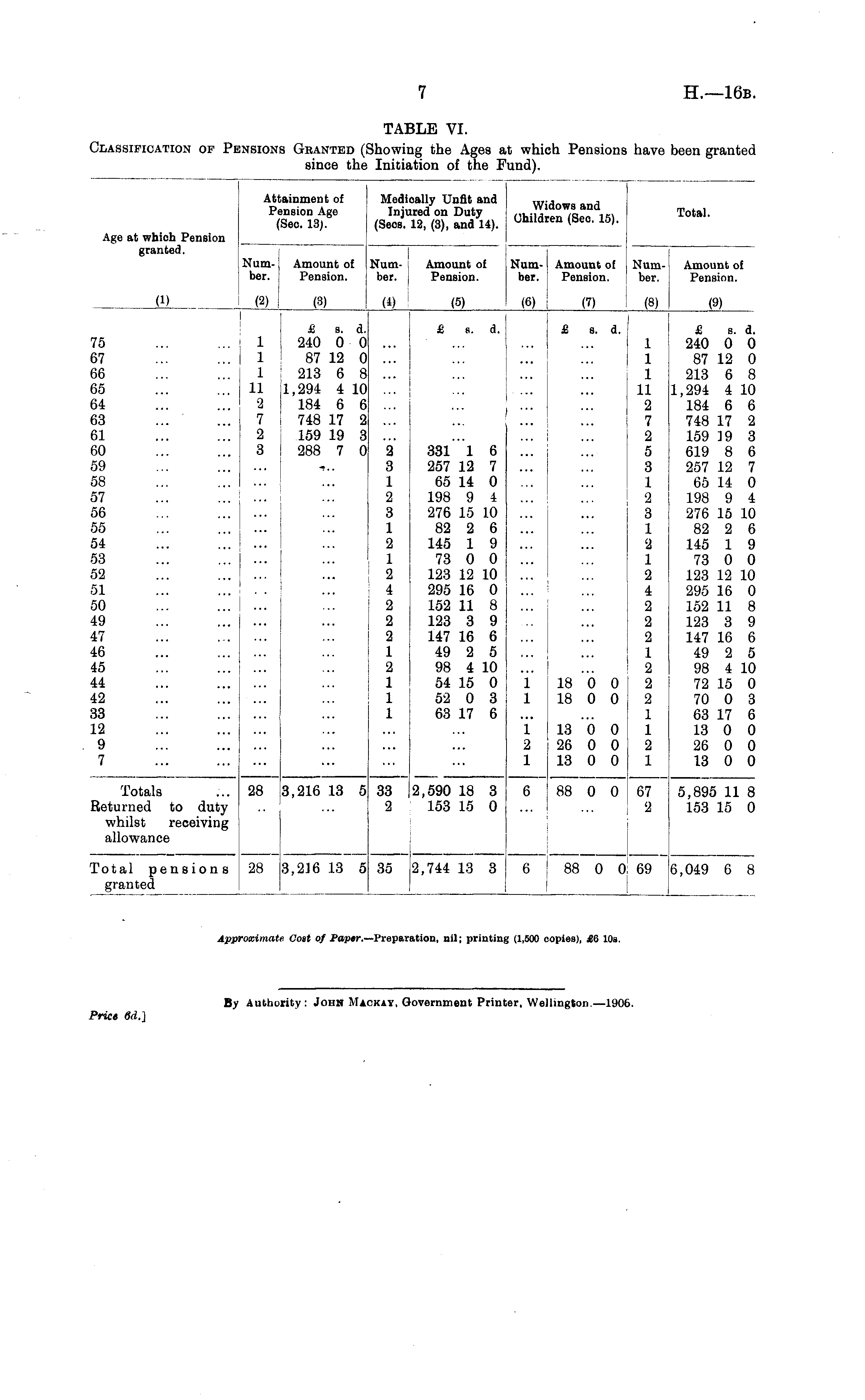 TABLE VI. Classification of Pensions Granted (Showing the Ages at which Pensions have been granted since the Initiation of the Fund).