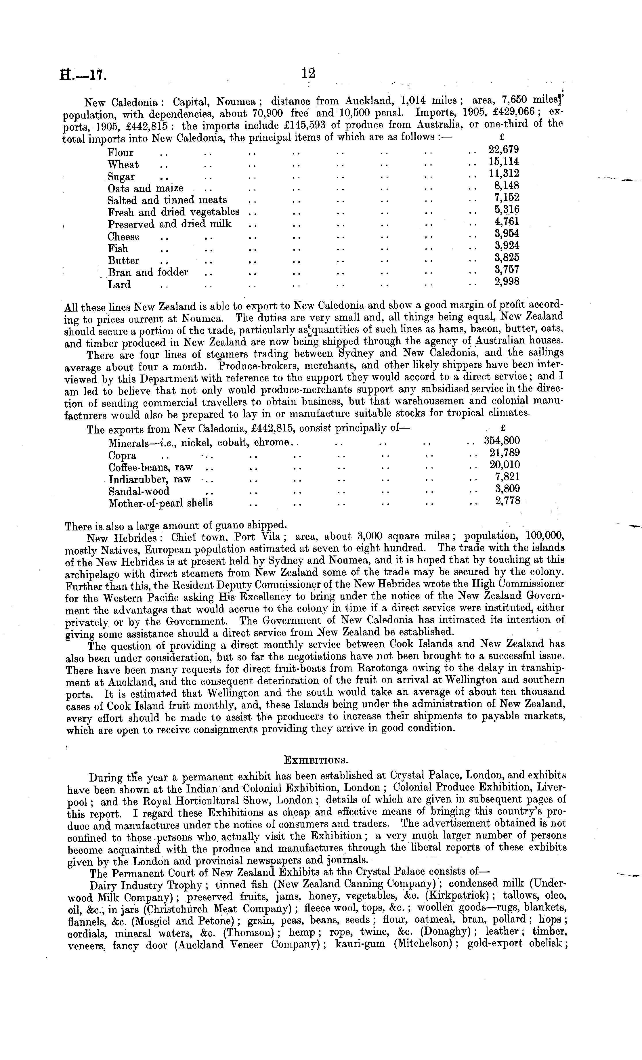New Caledonia : Capital, Noumea ; distance from Auckland, 1,014 miles ; area, 7,650 milesV population, with dependencies, about 70,900 free and 10,500 penal. Imports, 1905, £429,066 ; exports, 1905, £442,815 : the imports include £145,593 of produce from Australia, or one-third of the total imports into New Caledonia, the principal items of which are as follows : — £ Flour 22,679 Wheat •• •• 15 > 114 Sugar 11,312 Oats and maize .. .. . • • • • • • • • • 8,148 Salted and tinned meats .. .. .. .. . • 7,152 Fresh and dried vegetables .. .. .. . • • • 5,316 Preserved and dried milk .. .. . • • • • • • • 4,761 Cheese .. .. .. •• •• •• - • ■• 3,954 Fish 3,924 Butter 3,825 Bran and fodder .. .. .. • • • • • • • • 3,757 Lard 2 ,998 All these lines New Zealand is able to export to New Caledonia and show a good margin of profit according to prices current at Noumea. The duties are very small and, all things being equal, New Zealand should secure a portion of the trade, particularly of such lines as hams, bacon, butter, oats, and timber produced in New Zealand are now being shipped through the agency of Australian houses. There are four lines of steamers trading between Sydney and New Caledonia, and the sailings average about four a month. Produce-brokers, merchants, and other likely shippers have been interviewed by this Department with reference to the support they would accord to a direct service; and I am led to believe that not only would produce-merchants support any subsidised service in the direction of sending commercial travellers to obtain business, but that warehousemen and colonial manufacturers would also be prepared to lay in or manufacture suitable stocks for tropical climates. The exports from New Caledonia, £442,815, consist principally of— £ Minerals — i.e., nickel, cobalt, chrome.. .. .. .. • • 354,800 Copra .. 21,789 Coffee-beans, raw .. .. . • • • • • • • • ■ 20,010 Indiarubber, raw .. .. .. • • • • • • • ■ 7,821 Sandal-wood .. .. •• •■ •■ •• •• 3,809 Mother-of-pearl shells .. .. ■ • ■ • • • • • 2,778 There is also a large amount of guano shipped. New Hebrides : Chief town, Port Vila ; area, about 3,000 square miles ; population, 100,000, mostly Natives, European population estimated at seven to eight hundred. The trade with the islands of the New Hebrides is at present held by Sydney and Noumea, and it is hoped that by touching at this archipelago with direct steamers from New Zealand some of the trade may be secured by the colony. Further than this, the Resident Deputy Commissioner of the New Hebrides wrote the High Commissioner for the Western Pacific asking His Excellency to bring under the notice of the New Zealand Government the advantages that would accrue to the colony in time if a direct service were instituted, either privately or by the Government. The Government of New Caledonia has intimated its intention of giving some assistance should a direct service from New Zealand be established. The question of providing a direct monthly service between Cook Islands and New Zealand has also been under consideration, but so far the negotiations have not been brought to a successful issue. There have been many requests for direct fruit-boats from Rarotonga owing to the delay in transhipment at Auckland, and the consequent deterioration of the fruit on arrival at Wellington and southern ports. It is estimated that Wellington and the south would take an average of about ten thousand cases of Cook Island fruit monthly, and, these Islands being under the administration of New Zealand, every effort should be made to assist the producers to increase their shipments to payable markets, which are open to receive consignments providing they arrive in good condition. Exhibitions. During th"c year a permanent exhibit has been established at Crystal Palace, London, and exhibits have been shown at the Indian and Colonial Exhibition, London ; Colonial Produce Exhibition, Liverpool ; and the Royal Horticultural Show, London ; details of which are given in subsequent pages of this report. I regard these Exhibitions as cheap and effective means of bringing this country's produce and manufactures under the notice of consumers and traders. The advertisement obtained is not confined to those persons who. actually visit the Exhibition ; a very much larger number of persons become acquainted with the produce and manufactures through the liberal reports of these exhibits given by the London and provincial newspapers and journals. The Permanent Court of New Zealand Exhibits at the Crystal Palace consists of— Dairy Industry Trophy ; tinned fish (New Zealand Canning Company); condensed milk (Underwood Milk Company) ; preserved fruits, jams, honey, vegetables, &c. (Kirkpatrick) ; tallows, oleo, oil, &c, in jars (Christchurch Meat Company) ; fleece wool, tops, &c. ; woollen goods—rugs, blankets, flannels, &c. (Mosgiel and Petone); grain, peas, beans, seeds ; flour, oatmeal, bran, pollard ; hops ; cordials, mineral waters, &c. (Thomson) ; hemp; rope, twine, &c. (Donaghy) ; leather; timber, veneers, fancy door (Auckland Veneer Company) ; kauri-gum (Mitchelson) ; gold-export obelisk;