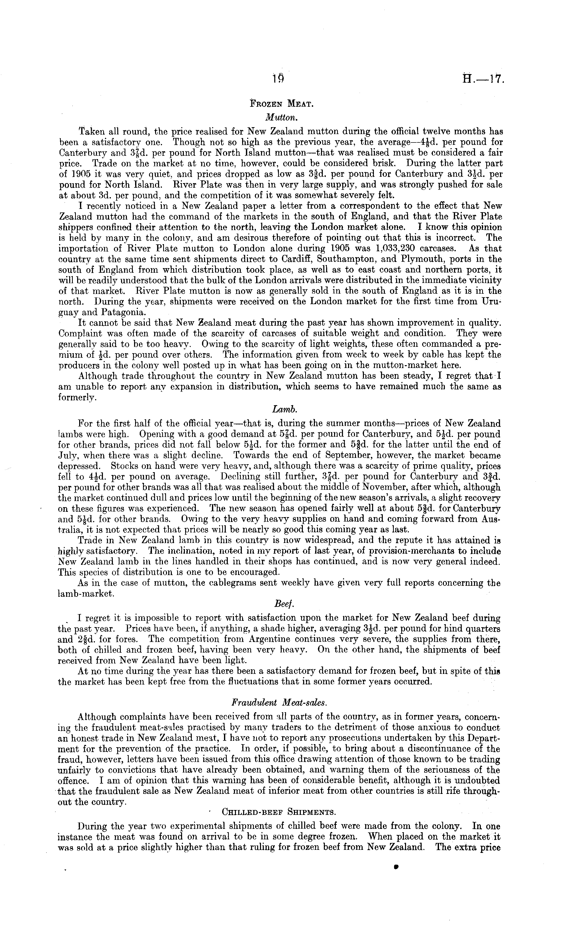 Frozen Meat. Mutton. Taken all round, the price realised for New Zealand mutton during the official twelve months has been a satisfactory one. Though not so high as the previous year, the average —4|d. per pound for Canterbury and 3§d. per pound for North Island mutton —that was realised must be considered a fair price. Trade on the market at no time, however, could be considered brisk. During the latter part of ]905 it was very quiet, and prices dropped as low as 3§d. per pound for Canterbury and 3|d. per pound for North Island. River Plate was then in very large supply, and was strongly pushed for sale at about 3d. per pound, and the competition of it was somewhat severely felt. I recently noticed in a New Zealand paper a letter from a correspondent to the effect that New Zealand mutton had the command of the markets in the south of England, and that the River Plate shippers confined their attention to the north, leaving the London market alone. I know this opinion is held by many in the colony, and am desirous therefore of pointing out that this is incorrect. The importation of River Plate mutton to London alone during 1905 was 1,033,230 carcases. As that country at the same time sent shipments direct to Cardiff, Southampton, and Plymouth, ports in the south of England from which distribution took place, as well as to east coast and northern ports, it will be readily understood that the bulk of the London arrivals were distributed in the immediate vicinity of that market. River Plate mutton is now as generally sold in the south of England as it is in the north. During the year, shipments were received on the London market for the first time from Uruguay and Patagonia. It cannot be said that New Zealand meat during the past year has shown improvement in quality. Complaint was often made of the scarcity of carcases of suitable weight and condition. They were generally said to be too heavy. Owing to the scarcity of light weights, these often commanded a premium of Jd. per pound over others. The information given from week to week by cable has kept the producers in the colony well posted up in what has been going on in the mutton-market here. Although trade throughout the country in New Zealand mutton has been steady, I regret that I am unable to report any expansion in distribution, which seems to have remained much the same as formerly. Lamb. For the first half of the official year—that is, during the summer months —prices of New Zealand lambs were high. Opening with a good demand at s|d. per pound for Canterbury, and 5Jd. per pound for other brands, prices did not fall below s|d. for the former and sfd. for the latter until the end of July, when there was a slight decline. Towards the end of September, however, the market became depressed. Stocks on hand were very heavy, and, although there was a scarcity of prime quality, prices fell to 4|d. per pound on average. Declining still further, 3|d. per pound for Canterbury and 3|d. per pound for other brands was all that was realised about the middle of November, after which, although the market continued dull and prices low until the beginning of the new season's arrivals, a slight recovery on these figures was experienced. The new season has opened fairly well at about s|d. for Canterbury and s|d. for other brands. Owing to the very heavy supplies on hand and coming forward from Australia, it is not expected that prices will be nearly so good this coming year as last. Trade in New Zealand lamb in this country is now widespread, and the repute it has attained is highly satisfactory. The inclination, noted in my report of last year, of provision-merchants to include New Zealand lamb in the lines handled in their shops has continued, and is now very general indeed. This species of distribution is one to be encouraged. As in the case of mutton, the cablegrams sent weekly have given very full reports concerning the lamb-market. Beef. I regret it is impossible to report with satisfaction upon the market for New Zealand beef during the past year. Prices have been, if anything, a shade higher, averaging 3|d. per pound for hind quarters and 2fd. for fores. The competition from Argentine continues very severe, the supplies from there, both of chilled and frozen beef, having been very heavy. On the other hand, the shipments of beef received from New Zealand have been light. At no time during the year has there been a satisfactory demand for frozen beef, but in spite of this the market has been kept free from the fluctuations that in some former years occurred. Fraudulent Meat-sales. Although complaints have been received from all parts of the country, as in former years, concerning the fraudulent meat-sales practised by many traders to the detriment of those anxious to conduct an honest trade in New Zealand meat, I have not to report any prosecutions undertaken by this Department for the prevention of the practice. In order, if possible, to bring about a discontinuance of the fraud, however, letters have been issued from this office drawing attention of those known to be trading unfairly to convictions that have already been obtained, and warning them of the seriousness of the offence. lam of opinion that this warning has been of considerable benefit, although it is undoubted that the fraudulent sale as New Zealand meat of inferior meat from other countries is still rife throughout the country. • Chilled-beef Shipments. During the year two experimental shipments of chilled beef were made from the colony. In one instance the meat was found on arrival to be in some degree frozen. When placed on the market it was sold at a price slightly higher than that ruling for frozen beef from New Zealand. The extra price