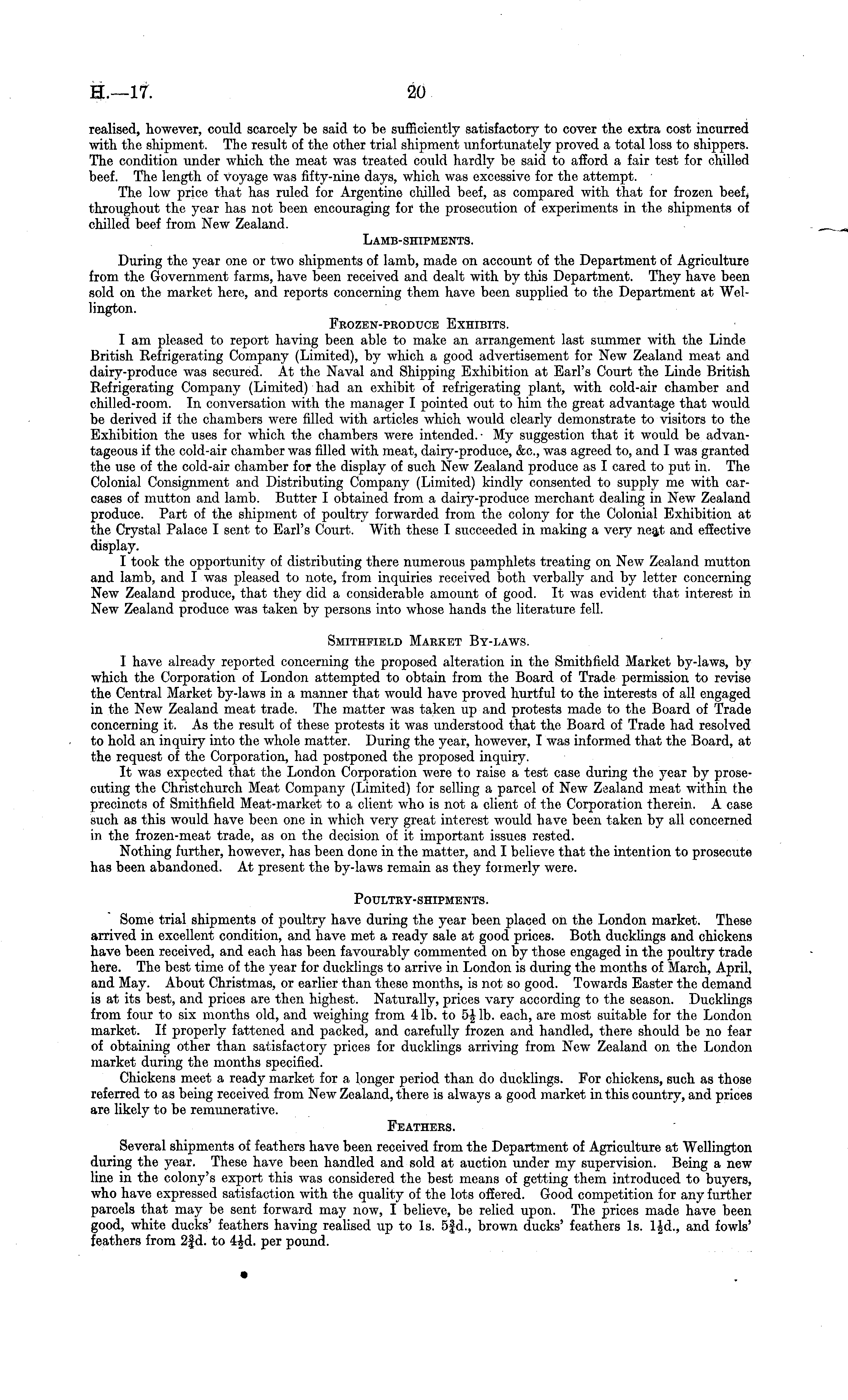 realised, however, could scarcely be said to be sufficiently satisfactory to cover the extra cost incurred with the shipment. The result of the other trial shipment unfortunately proved a total loss to shippers. The condition under which the meat was treated could hardly be said to afford a fair test for chilled beef. The length of voyage was fifty-nine days, which was excessive for the attempt. The low price that has ruled for Argentine chilled beef, as compared with that for frozen beef* throughout the year has not been encouraging for the prosecution of experiments in the shipments of chilled beef from New Zealand. Lamb-shipments. During the year one or two shipments of lamb, made on account of the Department of Agriculture from the Government farms, have been received and dealt with by this Department. They have been sold on the market here, and reports concerning them have been supplied to the Department at Wellington. Frozen-produce Exhibits. I am pleased to report having been able to make an arrangement last summer with the Linde British Refrigerating Company (Limited), by which a good advertisement for New Zealand meat and dairy-produce was secured. At the Naval and Shipping Exhibition at Earl's Court the Linde British Refrigerating Company (Limited) had an exhibit of refrigerating plant, with cold-air chamber and chilled-room. In conversation with the manager I pointed out to him the great advantage that would be derived if the chambers were filled with articles which would clearly demonstrate to visitors to the Exhibition the uses for which the chambers were intended.- My suggestion that it would be advantageous if the cold-air chamber was filled with meat, dairy-produce, &c, was agreed to, and I was granted the use of the cold-air chamber for the display of such New Zealand produce as I cared to put in. The Colonial Consignment and Distributing Company (Limited) kindly consented to supply me with carcases of mutton and lamb. Butter I obtained from a dairy-produce merchant dealing in New Zealand produce. Part of the shipment of poultry forwarded from the colony for the Colonial Exhibition at the Crystal Palace I sent to Earl's Court. With these I succeeded in making a very nea,t and effective display. I took the opportunity of distributing there numerous pamphlets treating on New Zealand mutton and lamb, and I was pleased to note, from inquiries received both verbally and by letter concerning New Zealand produce, that they did a considerable amount of good. It was evident that interest in New Zealand produce was taken by persons into whose hands the literature fell. Smithfield Market By-laws. I have already reported concerning the proposed alteration in the Smithfield Market by-laws, by which the Corporation of London attempted to obtain from the Board of Trade permission to revise the Central Market by-laws in a manner that would have proved hurtful to the interests of all engaged in the New Zealand meat trade. The matter was taken up and protests made to the Board of Trade concerning it. As the result of these protests it was understood that the Board of Trade had resolved to hold an inquiry into the whole matter. During the year, however, I was informed that the Board, at the request of the Corporation, had postponed the proposed inquiry. It was expected that the London Corporation were to raise a test case during the year by prosecuting the Christchurch Meat Company (Limited) for selling a parcel of New Zealand meat within the precincts of Smithfield Meat-market to a client who is not a client of the Corporation therein. A case such as this would have been one in which very great interest would have been taken by all concerned in the frozen-meat trade, as on the decision of it important issues rested. Nothing further, however, has been done in the matter, and I believe that the intention to prosecute has been abandoned. At present the by-laws remain as they formerly were. Poultry-shipments. Some trial shipments of poultry have during the year been placed on the London market. These arrived in excellent condition, and have met a ready sale at good prices. Both ducklings and chickens have been received, and each has been favourably commented on by those engaged in the poultry trade here. The best time of the year for ducklings to arrive in London is during the months of March, April, and May. About Christmas, or earlier than these months, is not so good. Towards Easter the demand is at its best, and prices are then highest. Naturally, prices vary according to the season. Ducklings from four to six months old, and weighing from 4 lb. to 5| lb. each, are most suitable for the London market. If properly fattened and packed, and carefully frozen and handled, there should be no fear of obtaining other than satisfactory prices for ducklings arriving from New Zealand on the London market during the months specified. Chickens meet a ready market for a longer period than do ducklings. For chickens, such as those referred to as being received from New Zealand, there is always a good market in this country, and prices are likely to be remunerative. Feathers. Several shipments of feathers have been received from the Department of Agriculture at Wellington during the year. These have been handled and sold at auction under my supervision. Being a new line in the colony's export this was considered the best means of getting them introduced to buyers, who have expressed satisfaction with the quality of the lots offered. Good competition for any further parcels that may be sent forward may now, I believe, be relied upon. The prices made have been good, white ducks' feathers having realised up to Is. s|d., brown ducks' feathers Is. l|d., and fowls' feathers from 2fd. to 4£d. per pound.