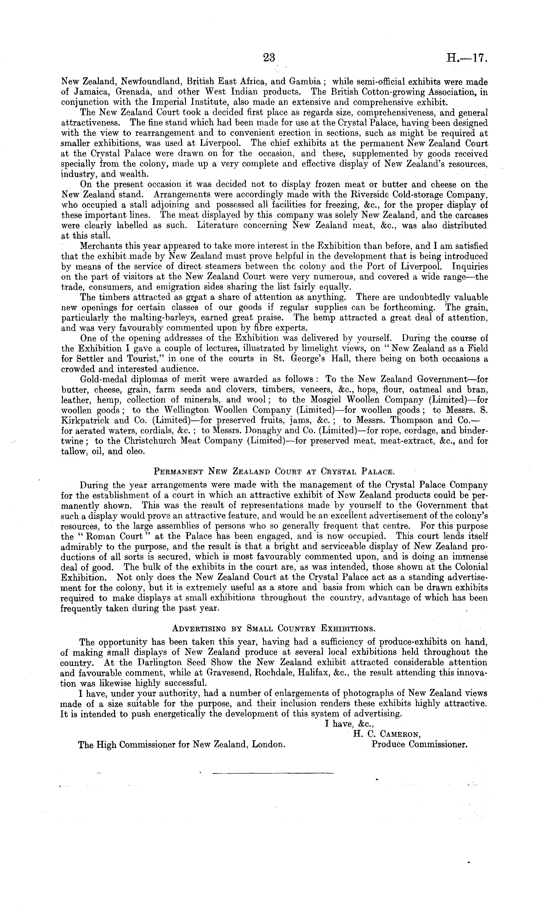 New Zealand, Newfoundland, British East Africa, and Gambia ; while semi-official exhibits were made of Jamaica, Grenada, and other West Indian products. The British Cotton-growing Association, in conjunction with the Imperial Institute, also made an extensive and comprehensive exhibit. The New Zealand Court took a decided first place as regards size, comprehensiveness, and general attractiveness. The fine stand which had been made for use at the Crystal Palace, having been designed with the view to rearrangement and to convenient erection in sections, such as might be required at smaller exhibitions, was used at Liverpool. The chief exhibits at the permanent New Zealand Court at the Crystal Palace were drawn on for the occasion, and these, supplemented by goods received specially from the colony, made up a very complete and effective display of New Zealand's resources, industry, and wealth. On the present occasion it was decided not to display frozen meat or butter and cheese on the New Zealand stand. Arrangements were accordingly made with the Riverside Cold-storage Company, who occupied a stall adjoining and possessed all facilities for freezing, &c, for the proper display of these important lines. The meat displayed by this company was solely New Zealand, and the carcases were clearly labelled as such. Literature concerning New Zealand meat, &c, was also distributed at this stall. Merchants this year appeared to take more interest in the Exhibition than before, and I am satisfied that the exhibit made by New Zealand must prove helpful in the development that is being introduced by means of the service of direct steamers between the colony and the Port of Liverpool. Inquiries on the part of visitors at the New Zealand Court were very numerous, and covered a wide range —the trade, consumers, and emigration sides sharing the list fairly equally. The timbers attracted as great a share of attention as anything. There are undoubtedly valuable new openings for certain classes of our goods if regular supplies can be forthcoming. The grain, particularly the malting-barleys, earned great praise. The hemp attracted a great deal of attention, and was very favourably commented upon by fibre experts. One of the opening addresses of the Exhibition was delivered by yourself. During the course of the Exhibition I gave a couple of lectures, illustrated by limelight views, on " New Zealand as a Field for Settler and Tourist," in one of the courts in St. George's Hall, there being on both occasions a crowded and interested audience. Gold-medal diplomas of merit were awarded as follows : To the New Zealand Government—for butter, cheese, grain, farm seeds and clovers, timbers, veneers, &c, hops, flour, oatmeal and bran, leather, hemp, collection of minerals, and wool; to the Mosgiel Woollen Company (Limited) —for woollen goods ; to the Wellington Woollen Company (Limited) —for woollen goods ; to Messrs. S. Kirkpatrick and Co. (Limited) —for preserved fruits, jams, &c. ; to Messrs. Thompson and Co. — for aerated waters, cordials, &c. ; to Messrs. Donaghy and Co. (Limited) —for rope, cordage, and bindertwine ; to the Christchurch Meat Company (Limited) —for preserved meat, meat-extract, &c, and for tallow, oil, and oleo. Permanent New Zealand Court at Crystal Palace. During the year arrangements were made with the management of the Crystal Palace Company for the establishment of a court in which an attractive exhibit of New Zealand products could be permanently shown. This was the result of representations made by yourself to the Government that such a display would provs an attractive feature, and would be an excellent advertisement of the colony's resources, to the large assemblies of persons who so generally frequent that centre. For this purpose the " Roman Court" at the Palace has been engaged, and is now occupied. This court lends itself admirably to the purpose, and the result is that a bright and serviceable display of New Zealand productions of all sorts is secured, which is most favourably commented upon, and is doing an immense deal of good. The bulk of the exhibits in the court are, as was intended, those shown at the Colonial Exhibition. Not only does the New Zealand Court at the Crystal Palace act as a standing advertisement for the colony, but it is extremely useful as a store and basis from which can be drawn exhibits required to make displays at small exhibitions throughout the country, advantage of which has been frequently taken during the past year. Advertising by Small Country Exhibitions. The opportunity has been taken this year, having had a sufficiency of produce-exhibits on hand, of making small displays of New Zealand produce at several local exhibitions held throughout the country. At the Darlington Seed Show the New Zealand exhibit attracted considerable attention and favourable comment, while at Gravesend, Rochdale, Halifax, &c, the result attending this innovation was likewise highly successful. I have, under your authority, had a number of enlargements of photographs of New Zealand views made of a size suitable for the purpose, and their inclusion renders these exhibits highly attractive. It is intended to push energetically the development of this system of advertising. I have, &c, H. C. Cameron, The High Commissioner for New Zealand, London. Produce Commissioner.