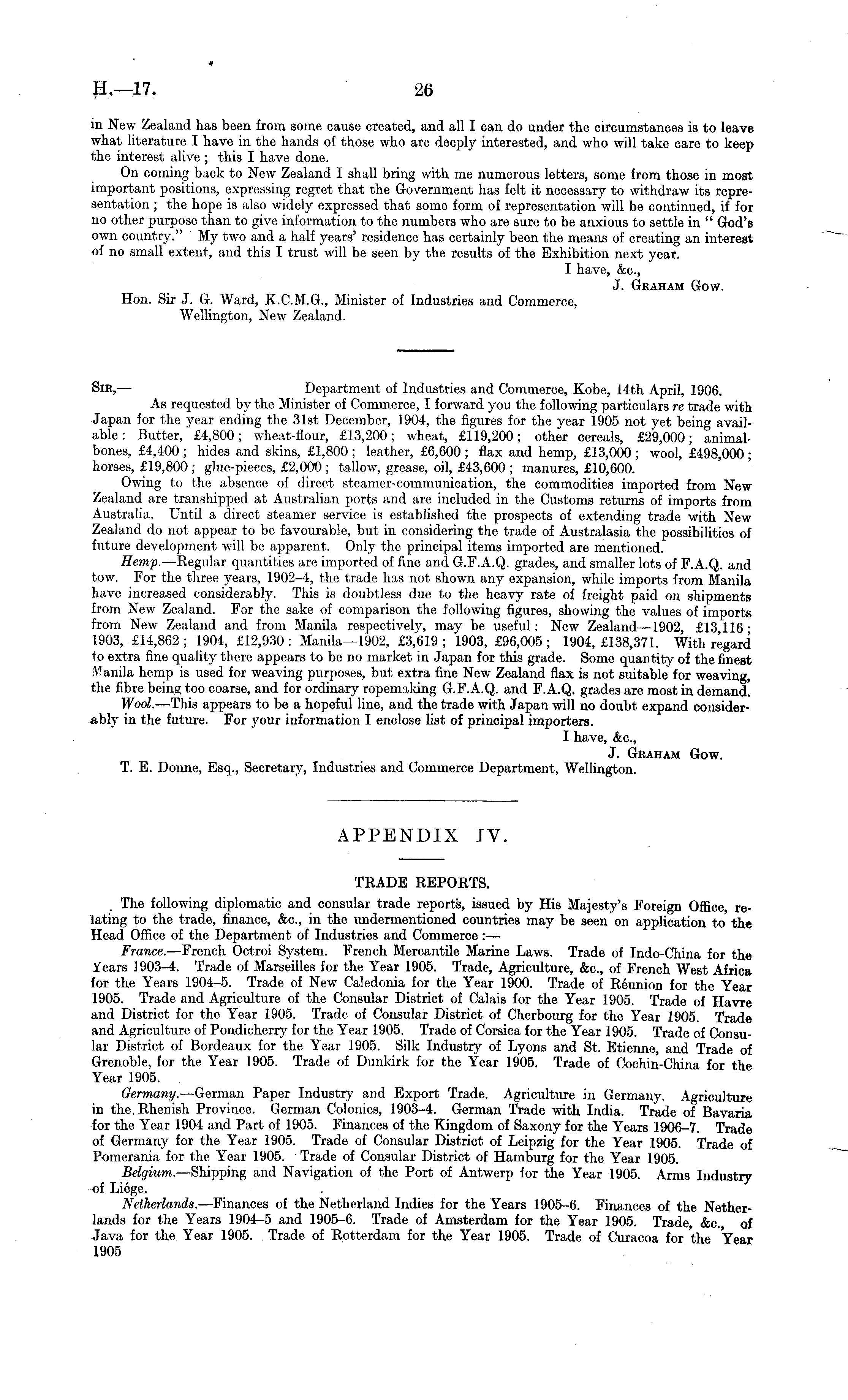 m New Zealand has been from some cause created, and all I can do under the circumstances is to leave what literature I have in the hands of those who are deeply interested, and who will take care to keep the interest alive ; this I have done. On coming back to New Zealand I shall bring with me numerous letters, some from those in most important positions, expressing regret that the Government has felt it necessary to withdraw its representation ; the hope is also widely expressed that some form of representation will be continued, if for no other purpose than to give information to the numbers who are sure to be anxious to settle in " God's own country." My two and a half years' residence has certainly been the means of creating an interest of no small extent, and this I trust will be seen by the results of the Exhibition next year. I have, &c, J. Graham Gow. Hon. Sir J. G. Ward, K.C.M.G., Minister of Industries and Commerce, Wellington, New Zealand. Sir, — Department of Industries and Commerce, Kobe, J 4th April, 1906. As requested by the Minister of Commerce, I forward you the following particulars re trade with Japan for the year ending the 31st December, 1904, the figures for the year 1905 not yet being available : Butter, £4,800; wheat-flour, £13,200; wheat, £119,200; other cereals, £29,000; animalbones, £4,400 ; hides and skins, £1,800 ; leather, £6,600 ; flax and hemp, £13,000 ; wool, £498,000 ; horses, £19,800 ; glue-pieces, £2,000 ; tallow, grease, oil, £43,600 ; manures, £10,600. Owing to the absence of direct steamer-communication, the commodities imported from New Zealand are transhipped at Australian ports and are included in the Customs returns of imports from Australia. Until a direct steamer service is established the prospects of extending trade with New Zealand do not appear to be favourable, but in considering the trade of Australasia the possibilities of future development will be apparent. Only the principal items imported are mentioned. Hemp. —Regular quantities are imported of fine and G.F.A.Q. grades, and smaller lots of F.A.Q. and tow. For the three years, 1902-4, the trade has not shown any expansion, while imports from Manila have increased considerably. This is doubtless due to the heavy rate of freight paid on shipments from New Zealand. For the sake of comparison the following figures, showing the values of imports from New Zealand and from Manila respectively, may be useful: New Zealand—l9o2, £13 116 ■ 1903, £14,862 ; 1904, £12,930 : Manila—l9o2, £3,619 ; 1903, £96,005 ; 1904, £138,371. With regard to extra fine quality there appears to be no market in Japan for this grade. Some quantity of the finest Manila hemp is used for weaving purposes, but extra fine New Zealand flax is not suitable for weaving, the fibre being too coarse, and for ordinary ropemaking G.F.A.Q. and F.A.Q. grades are most in demand. Wool. —This appears to be a hopeful line, and the trade with Japan will no doubt expand considerably in the future. For your information I enclose list of principal importers. I have, &c, J. Graham Gow. T. E. Donne, Esq., Secretary, Industries and Commerce Department, Wellington. APPENDIX IV. TRADE REPORTS. The following diplomatic and consular trade reports, issued by His Majesty's Foreign Office, relating to the trade, finance, &c, in the undermentioned countries may be seen on application to the Head Office of the Department of Industries and Commerce : — France. —French Octroi System. French Mercantile Marine Laws. Trade of Indo-China for the if ears 1903-4. Trade of Marseilles for the Year 1905. Trade, Agriculture, &c, of French West Africa for the Years 1904-5. Trade of New Caledonia for the Year 1900. Trade of Reunion for the Year 1905. Trade and Agriculture of the Consular District of Calais for the Year 1905. Trade of Havre and District for the Year 1905. Trade of Consular District of Cherbourg for the Year 1905. Trade and Agriculture of Pondicherry for the Year 1905. Trade of Corsica for the Year 1905. Trade of Consular District of Bordeaux for the Year 1905. Silk Industry of Lyons and St. Etienne, and Trade of Grenoble, for the Year 1905. Trade of Dunkirk for the Year 1905. Trade of Cochin-China for the Year 1905. Germany. —German Paper Industry and Export Trade. Agriculture in Germany. Agriculture in the. Rhenish Province. German Colonies, 1903-4. German Trade with India. Trade of Bavaria for the Year 1904 and Part of 1905. Finances of the Kingdom of Saxony for the Years 1906-7. Trade of Germany for the Year 1905. Trade of Consular District of Leipzig for the Year 1905. Trade of Pomerania for the Year 1905. Trade of Consular District of Hamburg for the Year 1905. Belgium. —Shipping and Navigation of the Port of Antwerp for the Year 1905. Arms Industry of Liege. Netherlands. —Finances of the Netherland Indies for the Years 1905-6. Finances of the Netherlands for the Years 1904-5 and 1905-6. Trade of Amsterdam for the Year 1905. Trade, &c, of Java for the Year 1905. Trade of Rotterdam for the Year 1905. Trade of Curacoa for the Year 1905