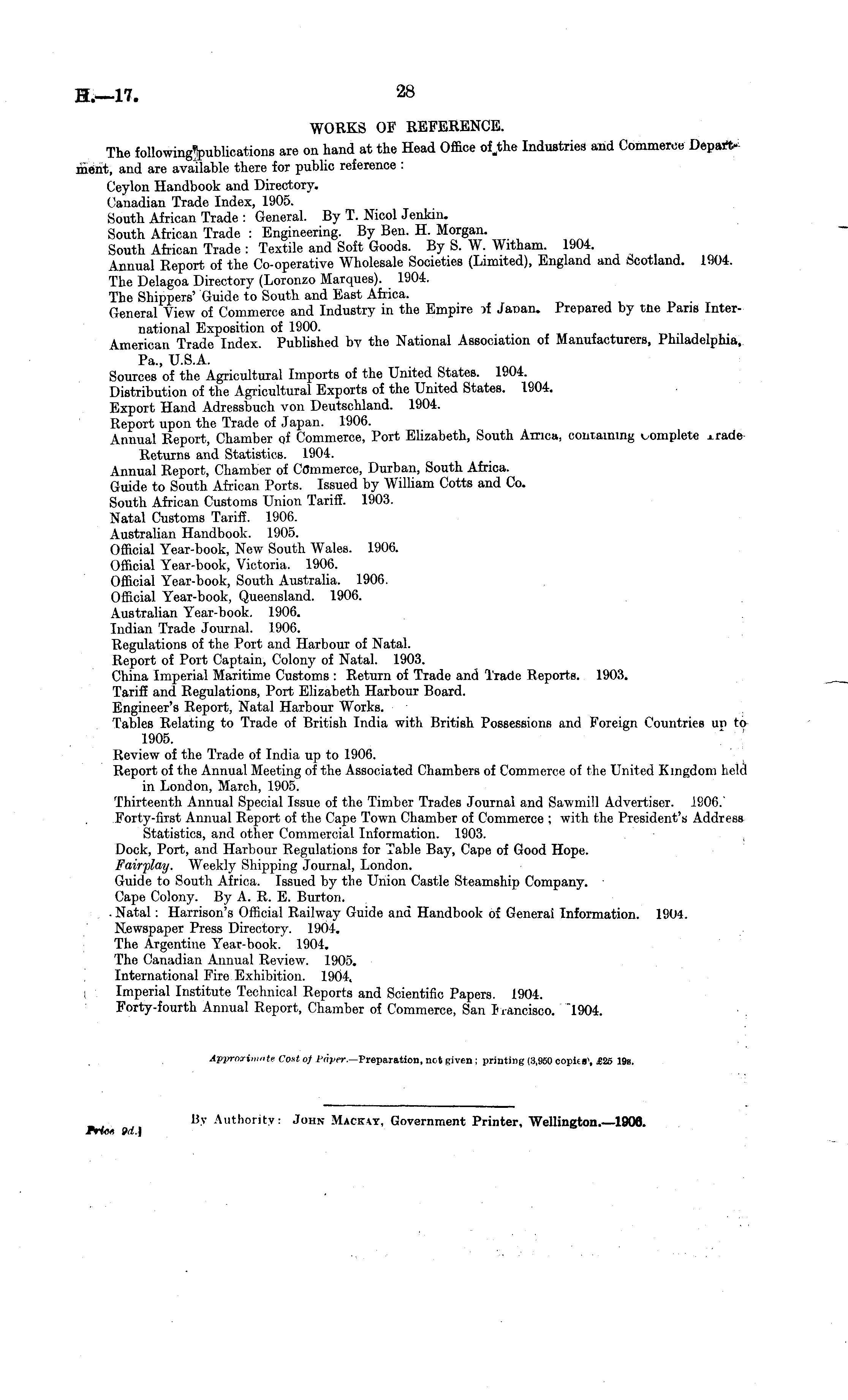 WORKS OF REFERENCE. The are on hand at the Head Office of>e Industries and Commerce Department, and are available there for public reference : Ceylon Handbook and Directory. Canadian Trade Index, 1905. South African Trade : General. By T. Nicol Jenkin. South African Trade : Engineering. By Ben. H. Morgan. South African Trade : Textile and Soft Goods. By S. W. Witham. 1904. Annual Report of the Co-operative Wholesale Societies (Limited), England and Scotland. 1904. The Delagoa Directory (Loronzo Marques). 1904. The Shippers' Guide to South and East Africa. General View of Commerce and Industry in the Empire if Janan. Prepared by tfie Paris International Exposition of 1900. American Trade Index. Published by the National Association of Manufacturers, Philadelphia, Pa., U.S.A. Sources of the Agricultural Imports of the United States. 1904. Distribution of the Agricultural Exports of the United States. 1904. Export Hand Adressbuch yon Deutschland. 1904. Report upon the Trade of Japan. 1906. Annual Report, Chamber of Commerce, Port Elizabeth, South Amca, containing complete xrade Returns and Statistics. 1904. Annual Report, Chamber of Commerce, Durban, South Africa. Guide to South African Ports. Issued by William Cotts and Co. South African Customs Union Tariff. 1903. Natal Customs Tariff. 1906. Australian Handbook. 1905. Official Year-book, New South Wales. 1906. Official Year-book, Victoria. 1906. Official Year-book, South Australia. 1906. Official Year-book, Queensland. 1906. Australian Year-book. 1906. Indian Trade Journal. 1906. Regulations of the Port and Harbour of Natal. Report of Port Captain, Colony of Natal. 1903. China Imperial Maritime Customs : Return of Trade and Trade Reports. 1903. Tariff and Regulations, Port Elizabeth Harbour Board. Engineer's Report, Natal Harbour Works. Tables Relating to Trade of British India with British Possessions and Foreign Countries up to 1905. Review of the Trade of India up to 1906. Report of the Annual Meeting of the Associated Chambers of Commerce of the United Kingdom held in London, March, 1905. Thirteenth Annual Special Issue of the Timber Trades Journal and Sawmill Advertiser. 1906.' Forty-first Annual Report of the Cape Town Chamber of Commerce ; with the President's Address Statistics, and other Commercial Information. 1903. . Dock, Port, and Harbour Regulations for Table Bay, Cape of Good Hope. Fairplay. Weekly Shipping Journal, London. Guide to South Africa. Issued by the Union Castle Steamship Company. • Cape Colony. By A. R. E. Burton. . Natal: Harrison's Official Railway Guide and Handbook of Generai Information. 1904. Newspaper Press Directory. 1904. The Argentine Year-book. 1904. The Canadian Annual Review. 1905. International Fire Exhibition. 1904, : Imperial Institute Technical Reports and Scientific Papers. 1904. Forty-fourth Annual Report, Chamber of Commerce, San Francisco. 1904.