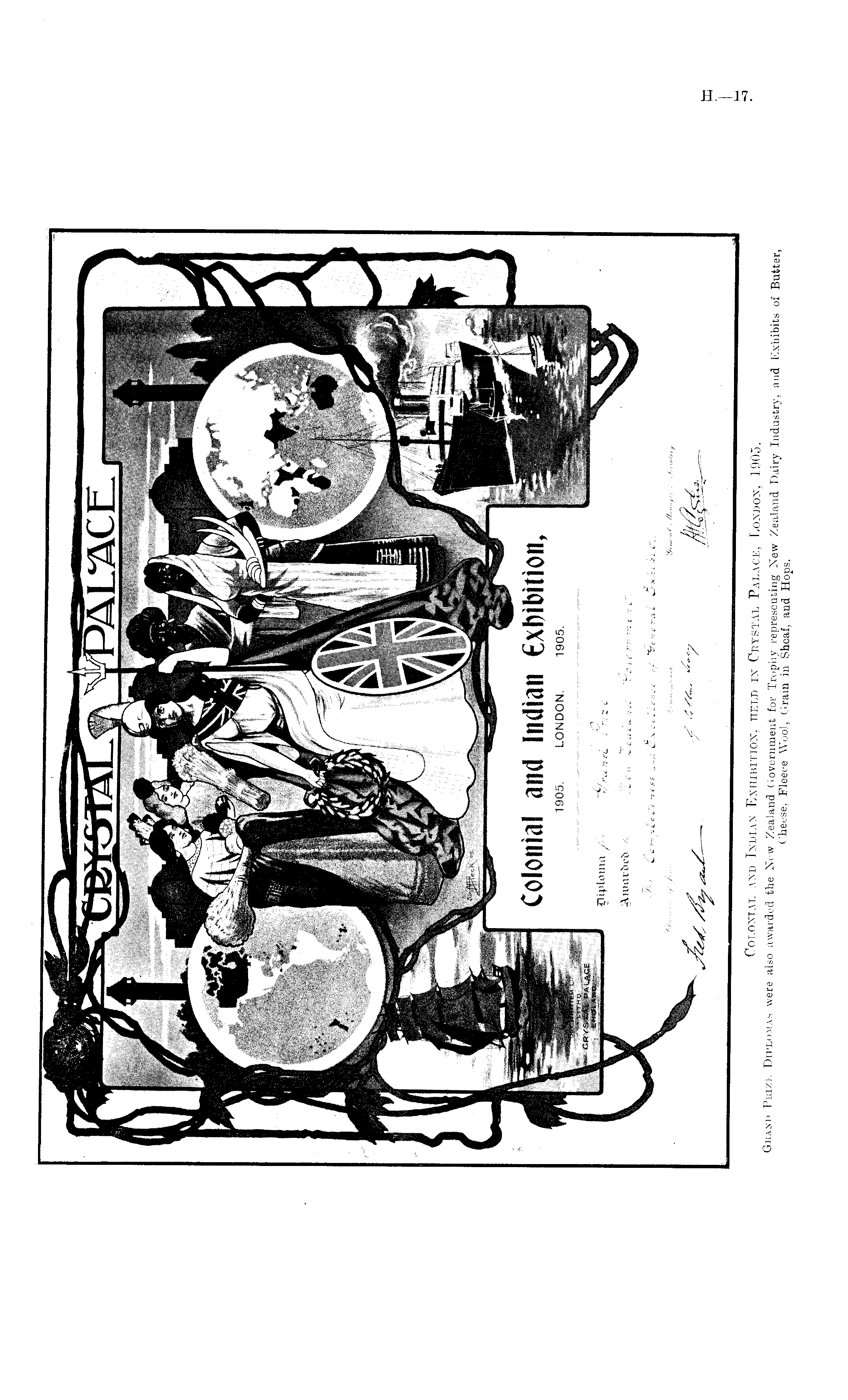 Colonial and Indian Exhibition, held in Crystal Palace, London, 1905. Grand Prize Diplomas were also awarded the New Zealand Government for Trophy representing New Zealand Dairy Industry, and Exhibits of Butter Cheese, Fleece Wool, Grain in Sheaf, and Hops.