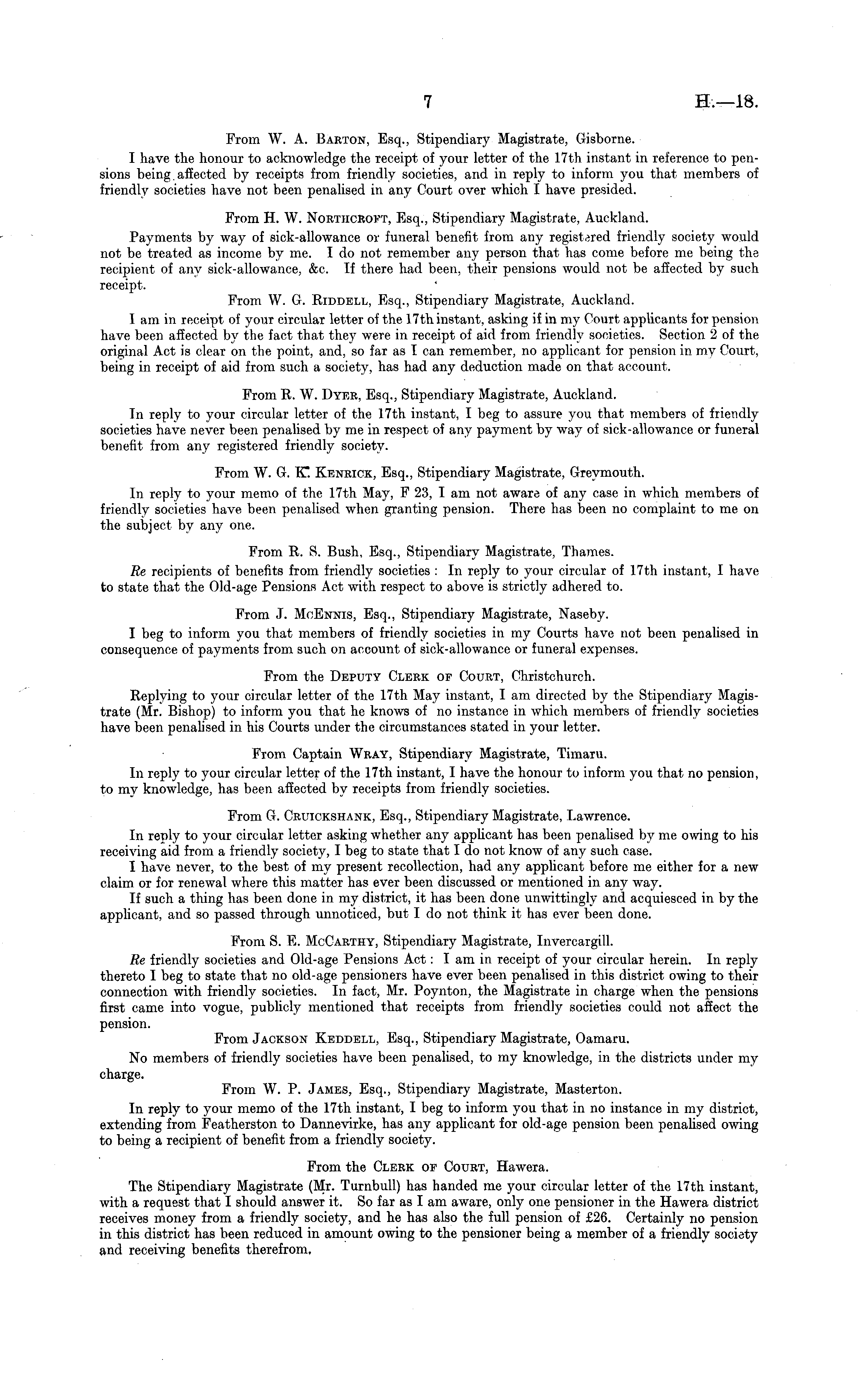 From W. A. Barton, Esq., Stipendiary Magistrate, Gisborne. I have the honour to acknowledge the receipt of your letter of the 17th instant in reference to pensions being affected by receipts from friendly societies, and in reply to inform you that members of friendly societies have not been penalised in any Court over which I have presided. From H. W. Northcroft, Esq., Stipendiary Magistrate, Auckland. Payments by way of sick-allowance or funeral benefit from any registered friendly society would not be treated as income by me. Ido not remember any person that has come before me being the recipient of any sick-allowance, &c. If there had been, their pensions would not be affected by such receipt. From W. G. Riddell, Esq., Stipendiary Magistrate, Auckland. I am in receipt of your circular letter of the 17th instant, asking if in my Court applicants for pension have been affected by the fact that they were in receipt of aid from friendly societies. Section 2of the original Act is clear on the point, and, so far as I can remember, no applicant for pension in my Court, being in receipt of aid from such a society, has had any deduction made on that account. From E. W. Dyer, Esq., Stipendiary Magistrate, Auckland. In reply to your circular letter of the 17th instant, I beg to assure you that members of friendly societies have never been penalised by me in respect of any payment by way of sick-allowance or funeral benefit from any registered friendly society. From W. G. X". Kenriok, Esq., Stipendiary Magistrate, Greymouth. In reply to your memo of the 17th May, F 23, I am not aware of any case in which members of friendly societies have been penalised when granting pension. There has been no complaint to me on the subject by any one. From R. S. Bush, Esq., Stipendiary Magistrate, Thames. Re recipients of benefits from friendly societies : In reply to your circular of 17th instant, I have to state that the Old-age Pensions Act with respect to above is strictly adhered to. From J. McEnnis, Esq., Stipendiary Magistrate, Naseby. I beg to inform you that members of friendly societies in my Courts have not been penalised in consequence of payments from such on account of sick-allowance or funeral expenses. From the Deputy Clerk of Court, Christchurch. Replying to your circular letter of the 17th May instant, I am directed by the Stipendiary Magistrate (Mr. Bishop) to inform you that he knows of no instance in which members of friendly societies have been penalised in his Courts under the circumstances stated in your letter. From Captain Wray, Stipendiary Magistrate, Timaru. In reply to your circular letter of the 17th instant, I have the honour to inform you that no pension, to my knowledge, has been affected by receipts from friendly societies. From G. Cruickshank, Esq., Stipendiary Magistrate, Lawrence. In reply to your circular letter asking whether any applicant has been penalised by me owing to his receiving aid from a friendly society, I beg to state that I do not know of any such case. I have never, to the best of my present recollection, had any applicant before me either for a new claim or for renewal where this matter has ever been discussed or mentioned in any way. If such a thing has been done in my district, it has been done unwittingly and acquiesced in by the applicant, and so passed through unnoticed, but I do not think it has ever been done. From S. E. McCarthy, Stipendiary Magistrate, Invercargill. Re friendly societies and Old-age Pensions Act: lam in receipt of your circular herein. In reply thereto I beg to state that no old-age pensioners have ever been penalised in this district owing to their connection with friendly societies. In fact, Mr. Poynton, the Magistrate in charge when the pensions first came into vogue, publicly mentioned that receipts from friendly societies could not affect the pension. From Jackson Keddell, Esq., Stipendiary Magistrate, Oamaru. No members of friendly societies have been penalised, to my knowledge, in the districts under my charge. From W. P. James, Esq., Stipendiary Magistrate, Masterton. In reply to your memo of the 17th instant, I beg to inform you that in no instance in my district, extending from Featherston to Dannevirke, has any applicant for old-age pension been penalised owing to being a recipient of benefit from a friendly society. From the Clerk op Court, Hawera. The Stipendiary Magistrate (Mr. Turnbull) has handed me your circular letter of the 17th instant, with a request that I should answer it. So far as lam aware, only one pensioner in the Hawera district receives money from a friendly society, and he has also the full pension of £26. Certainly no pension in this district has been reduced in amount owing to the pensioner being a member of a friendly society and receiving benefits therefrom.