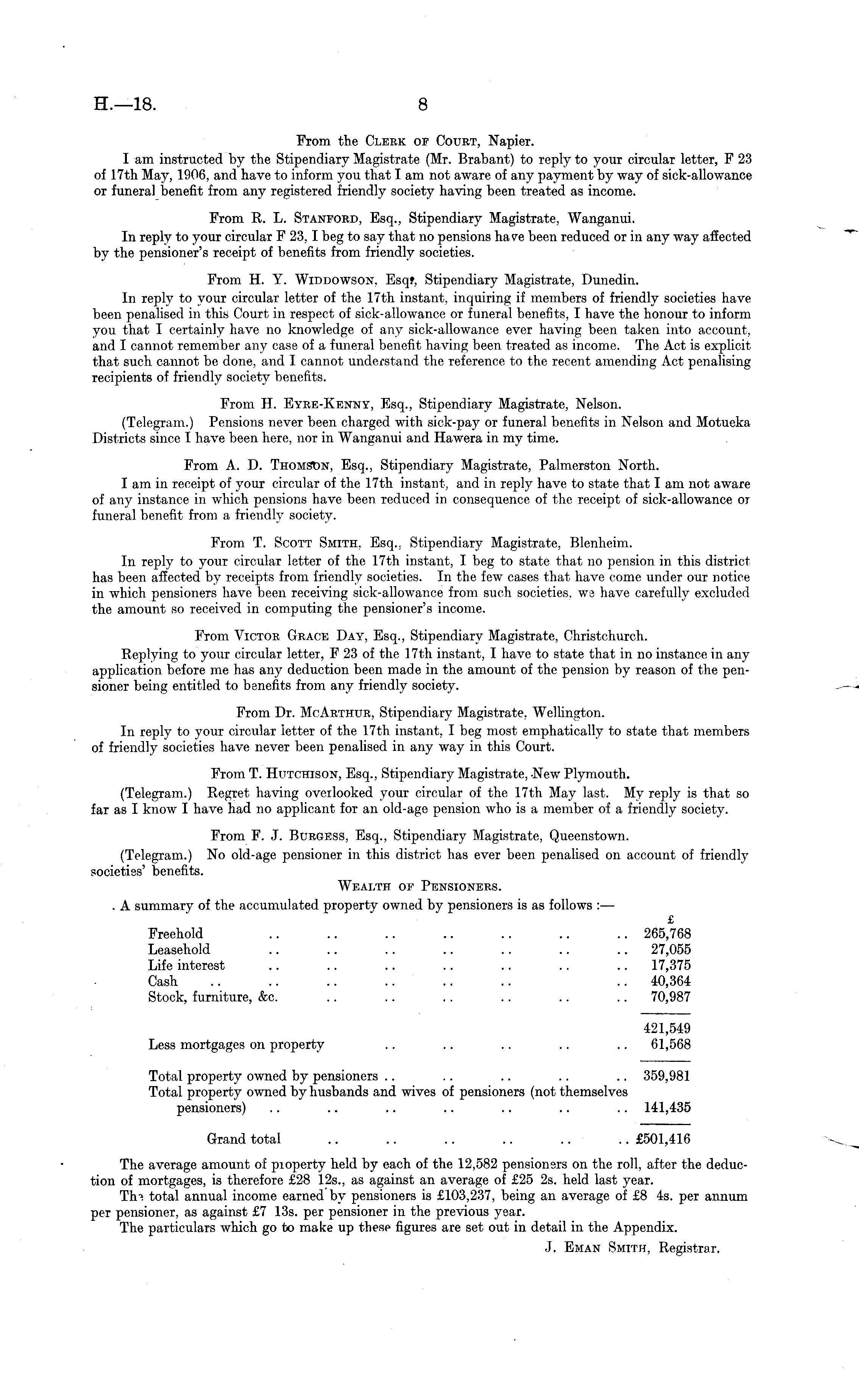From the Clerk of Court, Napier. I am instructed by the Stipendiary Magistrate (Mr. Brabant) to reply to your circular letter, F 23 of 17th May, 1906, and have to inform you that I am not aware of any payment by way of sick-allowance or funeral benefit from any registered friendly society having been treated as income. From R. L. Stanford, Esq., Stipendiary Magistrate, Wanganui. In reply to your circular F 23,1 beg to say that no pensions have been reduced or in any way affected by the pensioner's receipt of benefits from friendly societies. From H. Y. Widdowson, Esqf, Stipendiary Magistrate, Dunedin. In reply to your circular letter of the 17th instant, inquiring if members of friendly societies have been penalised in this Court in respect of sick-allowance or funeral benefits, I have the honour to inform you that I certainly have no knowledge of any sick-allowance ever having been taken into account, and I cannot remember any case of a funeral benefit having been treated as income. The Act is explicit that such cannot be done, and I cannot understand the reference to the recent amending Act penalising recipients of friendly society benefits. From H. Eyre-Kenny, Esq., Stipendiary Magistrate, Nelson. (Telegram.) Pensions never been charged with sick-pay or funeral benefits in Nelson and Motueka Districts since I have been here, nor in Wanganui and Hawera in my time. From A. D. Thomson, Esq., Stipendiary Magistrate, Palmerston North. I am in receipt of your circular of the 17th instant, and in reply have to state that I am not aware of any instance in which pensions have been reduced in consequence of the receipt of sick-allowance or funeral benefit from a friendly society. From T. Scott Smith, Esq.. Stipendiary Magistrate, Blenheim. In reply to your circular letter of the 17th instant, I beg to state that no pension in this district has been affected by receipts from friendly societies. In the few cases that have come under our notice in which pensioners have been receiving sick-allowance from such societies, we have carefully excluded the amount so received in computing the pensioner's income. From Victor Grace Day, Esq., Stipendiary Magistrate, Christchurch. Replying to your circular letter, F 23 of the 17th instant, I have to state that in no instance in any application before me has any deduction been made in the amount of the pension by reason of the pensioner being entitled to benefits from any friendly society. From Dr. McArthur, Stipendiary Magistrate, Wellington. In reply to your circular letter of the 17th instant, I beg most emphatically to state that members of friendly societies have never been penalised in any way in this Court. From T. Hutchison, Esq., Stipendiary Magistrate, New Plymouth. (Telegram.) Regret having overlooked your circular of the 17th May last. My reply is that so far as I know I have had no applicant for an old-age pension who is a member of a friendly society. From F. J. Burgess, Esq., Stipendiary Magistrate, Queenstown. (Telegram.) No old-age pensioner in this district has ever been penalised on account of friendly societies' benefits. Wealth of Pensioners. . A summary of the accumulated property owned by pensioners is as follows : — £ Freehold .. .. .. .. .. .. .. 265,768 Leasehold .. .. .. .. .. .. .. 27,055 Life interest .. .. .. .. .. .. .. 17,375 Cash .. .. .. .. .. .. .. 40,364 Stock, furniture, &c. .. .. . . .. .. .. 70,987 421,549 Less mortgages on property .. .. .. .. .. 61,568 Total property owned by pensioners .. .. .. .. .. 359,981 Total property owned by husbands and wives of pensioners (not themselves pensioners) .. .. .. .. .. .. .. 141,435 Grand total .. .. .. .. .. .. £501,416 The average amount of pioperty held by each of the 12,582 pensioners on the roll, after the deduction of mortgages, is therefore £28 125., as against an average of £25 2s. held last year. Trn total annual income earned by pensioners is £103,237, being an average of £8 4s. per annum per pensioner, as against £7 13s. per pensioner in the previous year. The particulars which go to make up these figures are set out in detail in the Appendix. J. Eman Smith, Registrar.