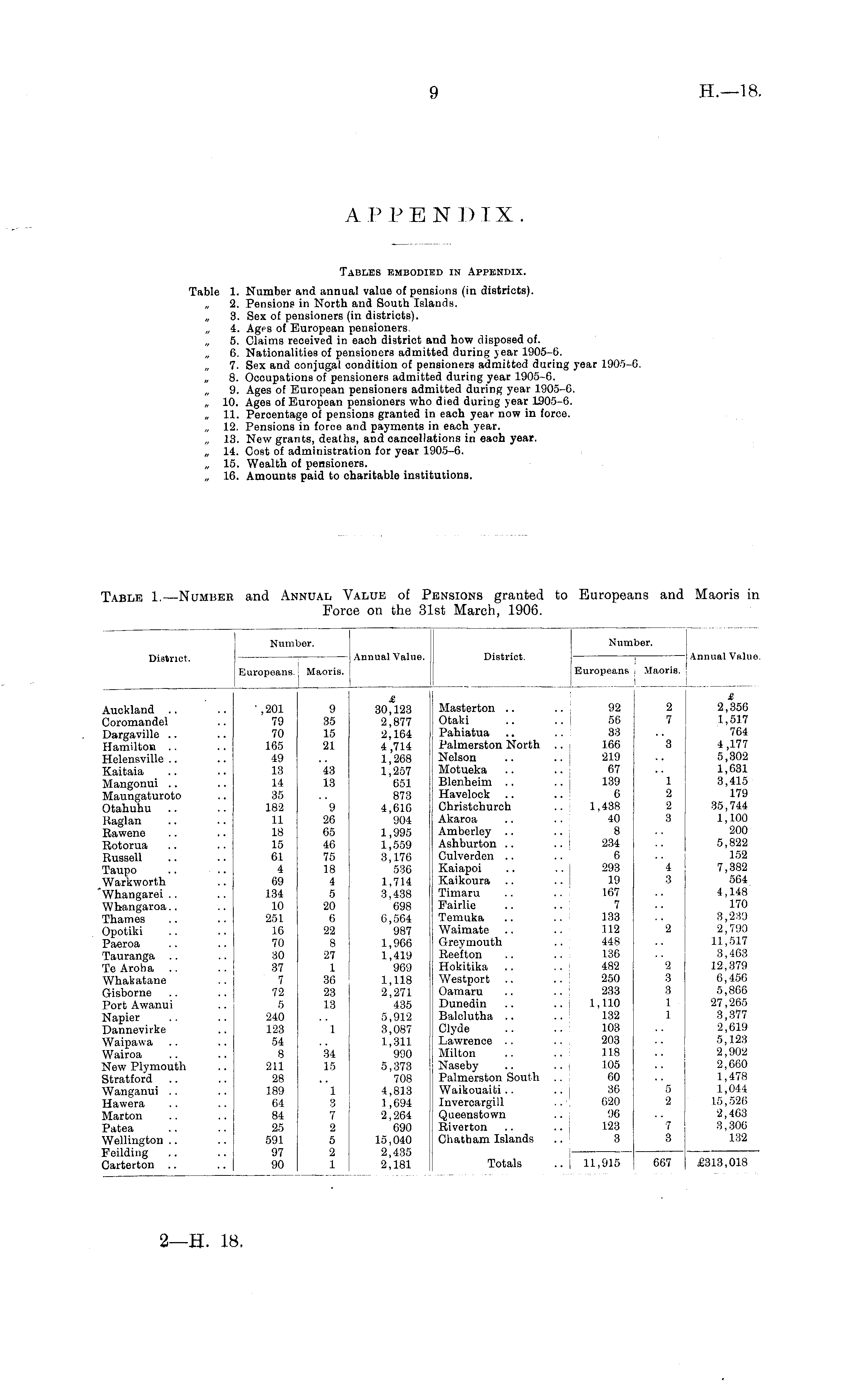 A P P ENDIX. Tables embodied in Appendix. Table 1. Number and annual value of pensions (in districts). „ 2. Pension? in North and South Islands. „ 3. Sex of pensioners (in districts). „ 4. Ages of European pensioners. 5. Claims received in each district and how disposed of. 6. Nationalities of pensioners admitted during year 1905-6. „ 7. Sex and conjugal condition of pensioners admitted during year 1905-6. 8. Occupations of pensioners admitted during year 1905-6. „ 9. Ages of European pensioners admitted during year 1905-6. „ 10. Ages of European pensioners who died during year 1905-6. „ 11. Percentage of pensions granted in each year now in force. „ 12. Pensions in force and payments in each year. „ 13. New grants, deaths, and cancellations in each year. „ 14. Cost of administration for year 1905-6. „ 15. Wealth of pensioners. „ 16. Amounts paid to oharitable institutions.
