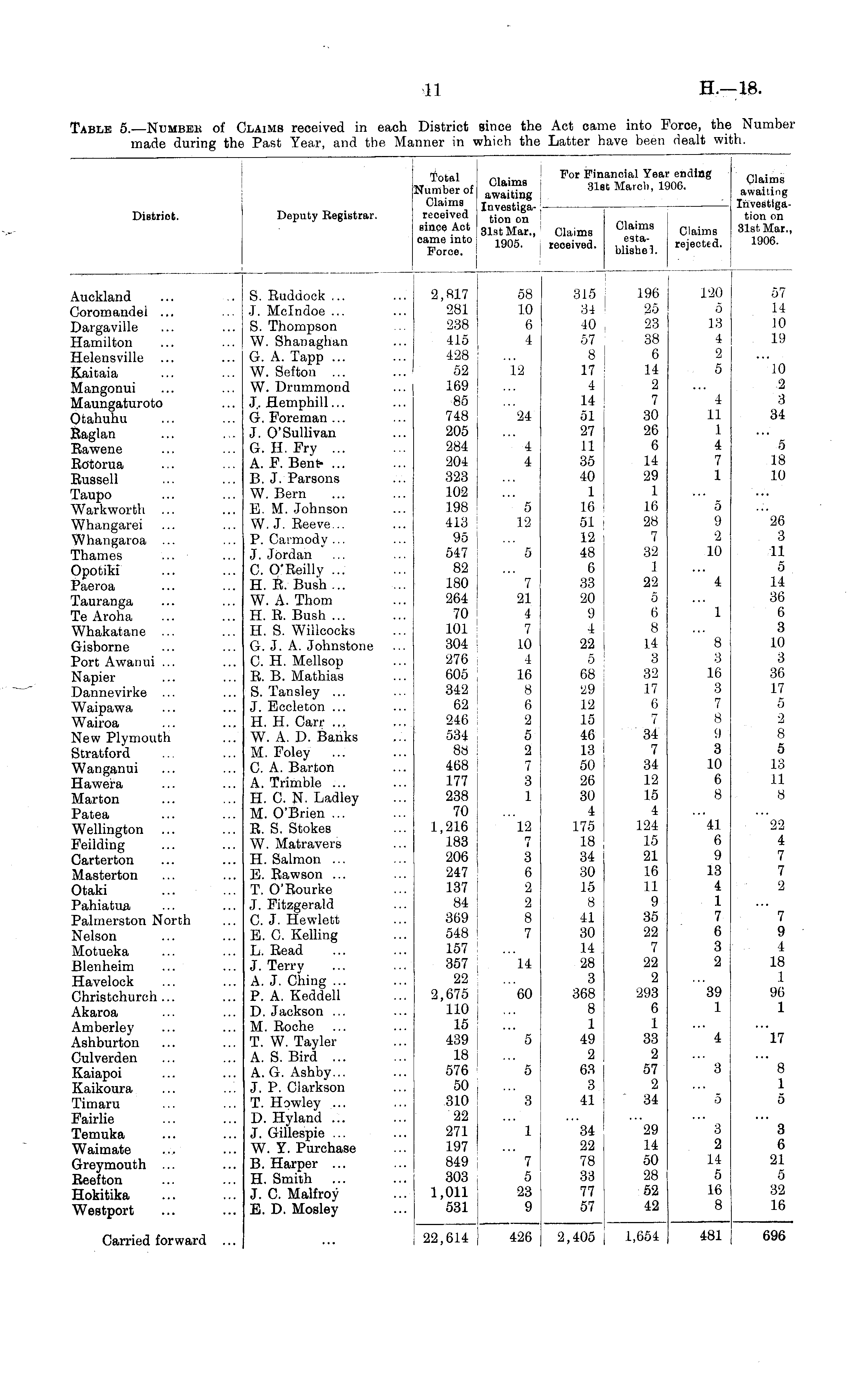 District. Deputy Registrar. Tnfftl For Fir lotal Claims o h Number of awaiting Claims Investiga . received tion 0^ BinceAct 31stMar claima camemto, 1905 . te(Jeived lancial Year ending it March, 1906. Cla ; ms Claims Claims awaiting Investigation on 31st Mar., 1906. Auckland Coromandel ... Dargaville Hamilton Helensville Kaicaia Mangonui Maungaturoto Otahuhu Raglan Rawene Rotorua Russell Taupo Warkworth Whangarei Whangaroa Thames Opotiki Paeroa Tauranga Te Aroha Whakatane Gisborne Port Awanui ... Napier Dannevirke Waipawa Wairoa New Plymouth Stratford Wanganui Hawera Marton Patea Wellington Feilding Carterton Masterton Otaki Pahiatua Palmerston North Nelson Motueka Blenheim Havelock Christchurch ... Akaroa Amberley Ashburton Culverden Kaiapoi Kaikoura Timaru Fairlie Temuka Waimate Greymouth ... Reefton Hokitika Weetport S. Euddock ... J. Mclndoe ... S. Thompson W. Shanaghan G. A. Tapp ... W. Sefton ... W. Drummond J., flemphill... G. Foreman ... J. O'Sullivan G. H. Fry ... A. F. Bent- ... B. J. Parsons W. Bern E. M. Johnson W. J. Eeeve... P. Carmody ... J. Jordan C. O'Reilly ... H. R. Bush ... W. A. Thorn H. R. Bush ... H. S. Willcocks G. J. A. Johnstone C. H. Mellsop R. B. Mathias S. Tansley ... J. Eccleton ... H. H. Carr ... W. A. D. Banks M. Foley C. A. Barton A. Trimble ... H. C. N. Ladley M. O'Brien ... R. S. Stokes W. Matravers H. Salmon ... E. Rawson ... T. O'Rourke J. Fitzgerald C. J. Hewlett E. C. Kelling L. Read J. Terry A. J. Ching ... P. A. Keddell D. Jackson ... M. Roche T. W. Tayler A. S. Bird ... A. G. Ashby... J. P. Clarkson T. Howley ... D. Hyland ... J. Gillespie ... W. Y. Purchase B. Harper ... H. Smith ... J. C. Malfroy E. D. Mosley 2,817 281 238 415 428 52 169 85 748 205 284 204 323 102 198 413 95 547 82 180 264 70 101 304 276 605 342 62 246 534 88 468 177 238 70 1,216 183 206 247 137 84 369 548 157 357 22 2,675 110 15 439 18 576 50 310 22 271 197 849 303 1,011 531 58 10 6 4 12 24 4 4 5 n 5 7 21 4 7 10 4 16 8 6 2 5 2 7 3 1 315 34 40 57 8 17 4 14 51 27 11 35 40 1 16 51 12 48 6 33 20 9 4 22 5 68 29 12 15 46 13 50 26 30 4 175 18 34 30 15 8 41 30 14 28 3 368 8 1 49 2 63 3 41 196 ■2b 23 38 6 14 2 7 30 26 6 14 29 1 16 28 7 32 1 22 5 6 8 14 3 32 17 6 7 34 7 34 12 15 4 124 15 21 16 11 9 35 22 7 22 2 293 6 1 33 2 57 2 34 120 5 18 I 2 5 4 11 1 4 7 1 5 9 2 10 4 1 8 3 16 3 7 8 <) 3 10 6 8 57 14 .10 19 10 2 3 34 S 18 10 26 3 11 5 14 36 6 3 10 3 36 17 5 2 8 5 13 11 8 12 n I 3 6 2 2 8 7 41 6 9 13 4 1 7 6 3 2 22 4 7 7 2 14 7 9 4 18 1 96 1 60 "39 1 5 4 'l7 5 3 8 1 0 3 5 1 7 5 23 9 34 22 78 33 77 57 29 14 50 28 52 42 3 2 14 5 16 8 3 6 21 5 32 16 Carried forward 22,614 426 2,405 1,654 481 696