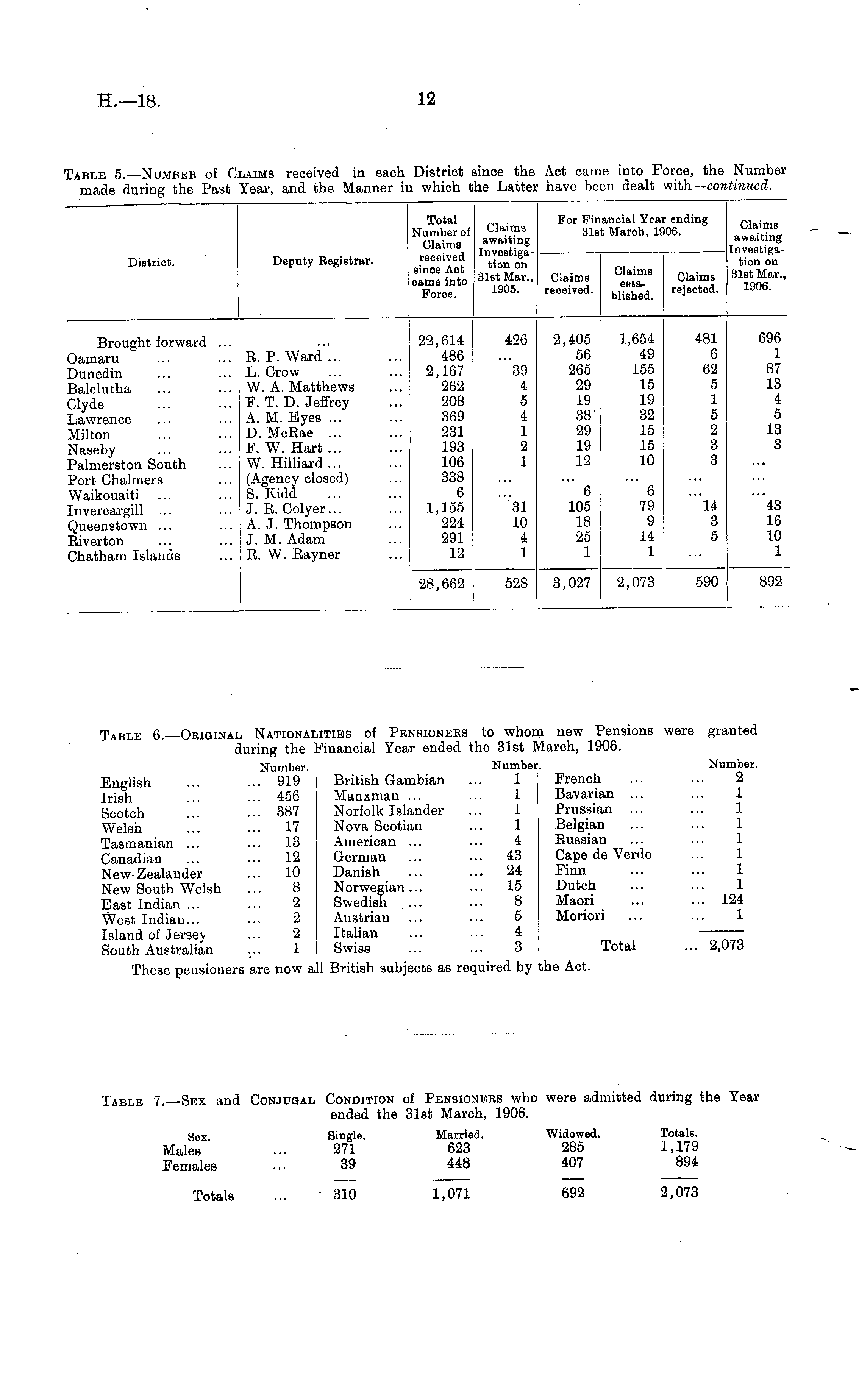 District. Deputy Registrar. Total Number of Claims received since Act came into Force. Claims awaiting Investigation on 31st Mar., 1905. For Fin; 31st ,ncial Yeai March, 1? c ending 106. Claims awaiting Investigation on 31st Mar., 1906. Claims received. Claims established. Claims rejected. Brought forward ... Oamaru Dunedin Balclutha Clyde Lawrence Milton Naseby Palmerston South Port Chalmers Waikouaiti Invercargill Queenstown ... Eiverton Chatham Islands E. P. Ward ... L. Crow W. A. Matthews F. T. D. Jeffrey A. M. Eyes ... D. McEae ... P. W. Hart ... W. Hilliard... (Agency closed) S. Kidd J. E. Colyer... A. J. Thompson J. M. Adam E. W. Eayner 22,614 486 2,167 262 208 369 231 193 106 338 6 1,155 224 291 12 426 39 4 5 4 1 2 1 2,405 56 265 29 19 38' 29 19 12 1,654 49 155 15 19 32 15 15 10 481 6 62 5 1 5 2 3 3 696 1 87 13 4 5 13 3 31 10 4 1 6 105 18 25 1 6 79 9 14 1 14 3 5 43 16 10 1 28,662 528 3,027 2,073 590 892