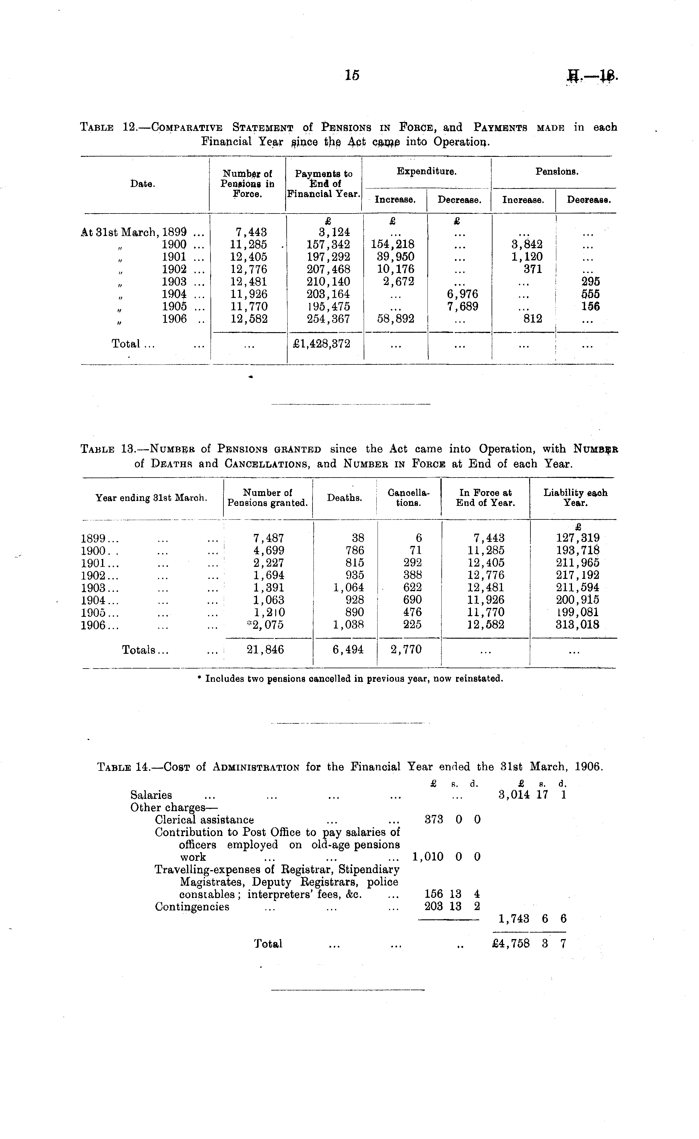 Table 14.—Cost of Administration for the Financial Year ended the 31st March, 1906. £ b. d. £ s. d. Salaries ... ... ... ... ... 3,014 17 1 Other charges— Clerical assistance ... ... 373 0 0 Contribution to Post Office to pay salaries of officers employed on old-age pensions work ... ... ... 1,010 0 0 Travelling-expenses of Registrar, Stipendiary Magistrates, Deputy Eegistrars, police constables; interpreters' fees, &c. ... 156 13 4 Contingencies ... ... ... 203 13 2 1,743 6 6 Total ... ... .. £4,758 3 7