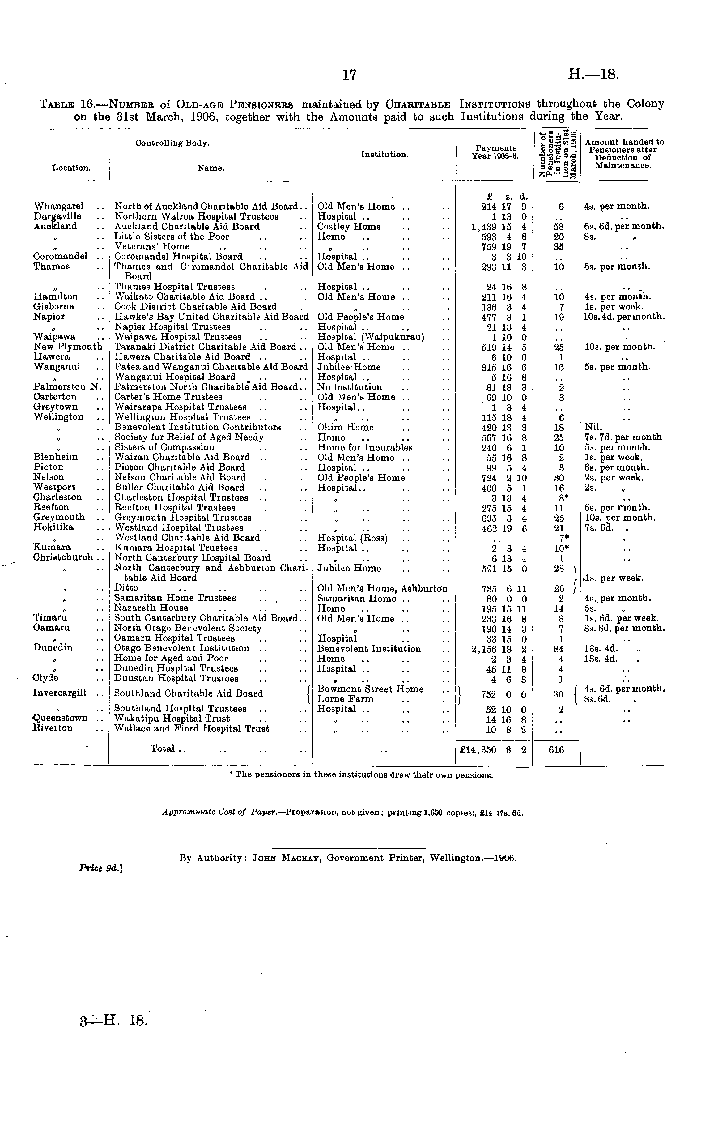 Table 16.—Number of Old-age Pensioners maintained by Charitable Institutions throughout the Colony on the 31st March, 1906, together with the Amounts paid to such Institutions during the Year.
