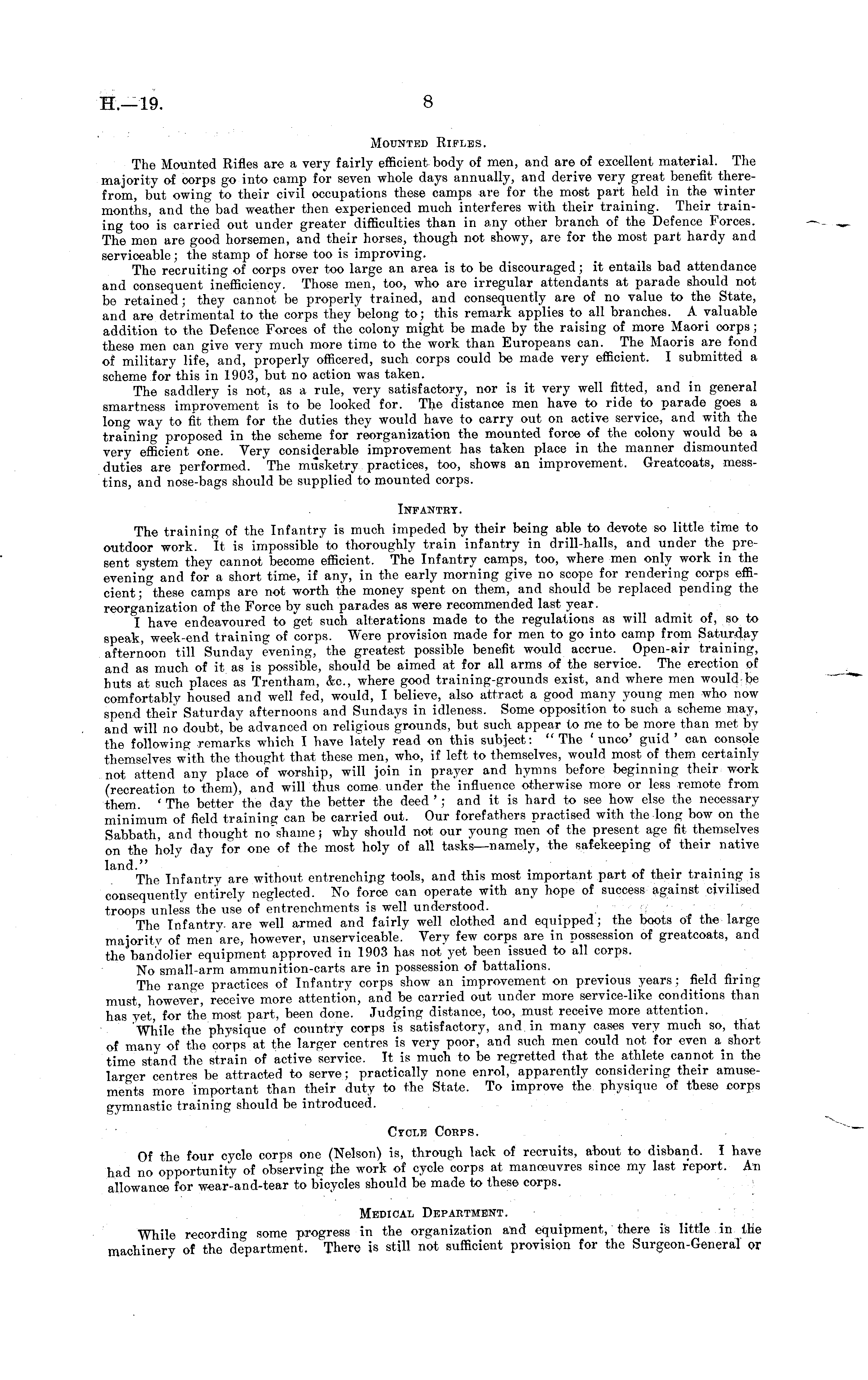 Mounted Rifles. The Mounted Rifles are a very fairly efficient body of men, and are of excellent material. The majority of corps go into camp for seven whole days annually, and derive very great benefit therefrom, but owing to their civil occupations these camps are for the most part held in the winter months, and the bad weather then experienced much interferes with their training. Their training too is carried out under greater difficulties than in any other branch of the Defence Forces. The men are good horsemen, and their horses, though not showy, are for the most part hardy and serviceable; the stamp of horse too is improving. The recruiting of corps over too large an area is to be discouraged; it entails bad attendance and consequent inefficiency. Those men, too, who are irregular attendants at parade should not be retained; they cannot be properly trained, and consequently are of no value to the State, and are detrimental to the corps they belong to; this remark applies to all branches. A valuable addition to the Defence Forces of the colony might be made by the raising of more Maori corps ; these men can give very much more time to the work than Europeans can. The Maoris are fond of military life, and, properly officered, such corps could be made very efficient. I submitted a scheme for this in 1903, but no action was taken. The saddlery is not, as a rule, very satisfactory, nor is it very well fitted, and in general smartness improvement is to be looked for. The distance men have to ride to parade goes a long way to fit them for the duties they would have to carry out on active service, and with the training proposed in the scheme for reorganization the mounted force of the colony would be a very efficient one. Very considerable improvement has taken place in the manner dismounted duties are performed. The musketry practices, too, shows an improvement. Greatcoats, messtins, and nose-bags should be supplied to mounted corps. Infantry. The training of the Infantry is much impeded by their being able to devote so little time to outdoor work. It is impossible to thoroughly train infantry in drill-halls, and under the present system they cannot become efficient. The Infantry camps, too, where men only work in the evening and for a short time, if any, in the early morning give no scope for rendering corps efficient; these camps are not worth the money spent on them, and should be replaced pending the reorganization of the Force by such parades as were recommended last year. I have endeavoured to get such alterations made to the regulations as will admit of, so to speak, week-end training of corps. Were provision made for men to go into camp from Saturday afternoon till Sunday evening, the greatest possible benefit would accrue. Open-air training, and as much of it as'is possible, should be aimed at for all arms of the service. The erection of huts at such places as Trentham, &c, where good training-grounds exist, and where men would be comfortably housed and well fed, would, I believe, also attract a good many young men who now spend their Saturday afternoons and Sundays in idleness. Some opposition to such a scheme may, and will no doubt, be advanced on religious grounds, but such appear to me to be more than met by the following remarks which I have lately read on this subject: " The 'unco' quid ' can console themselves with the thought that these men, who, if left to themselves, would most of them certainly not attend any place of worship, will join in prayer and hymns before beginning their work (recreation to them), and will thus come under the influence otherwise more or less remote from them. ' The better the day the better the deed '; and it is hard to see how else the necessary minimum of field training can be carried out. Our forefathers practised with the long bow on the Sabbath, and thought no"shame; why should not our young men of the present age fit themselves on the holy day for one of the most holy of all tasks—namely, the safekeeping of their native The Infantry are without entrenching tools, and this most important part of their training is consequently entirely neglected. No force can operate with any hope of success against civilised troops unless the use of entrenchments is well understood. The Infantry are well armed and fairly well clothed and equipped; the boots of the large majority of men'are, however, unserviceable. Very few corps are in possession of greatcoats, and the bandolier equipment approved in 1903 has not yet been issued to all corps. No small-arm ammunition-carts are in possession of battalions. The range practices of Infantry corps show an improvement on previous years; field firing must, however, receive more attention, and be carried out under more service-like conditions than has vet, for the most part, been done. Judging distance, too, must receive more attention. While the physique of country corps is satisfactory, and in many cases very much so, that of many of the corps at the larger centres is very poor, and such men could not for even a_ short time stand the strain of active service. It is much to be regretted that the athlete cannot in the larger centres be attracted to serve; practically none enrol, apparently considering their amusements more important than their duty to the State. To improve the physique of these corps gymnastic training should be introduced. Cycle Corps. Of the four cycle corps one (Nelson) is, through lack of recruits, about to disband. I have had no opportunity of observing the work of cycle corps at manoeuvres since my last report. An allowance for wear-and-tear to bicycles should be made to these corps. Medical Department. While recording some progress in the organization and equipment, there is little in the machinery of the department. There is still not sufficient provision for the Surgeon-General or