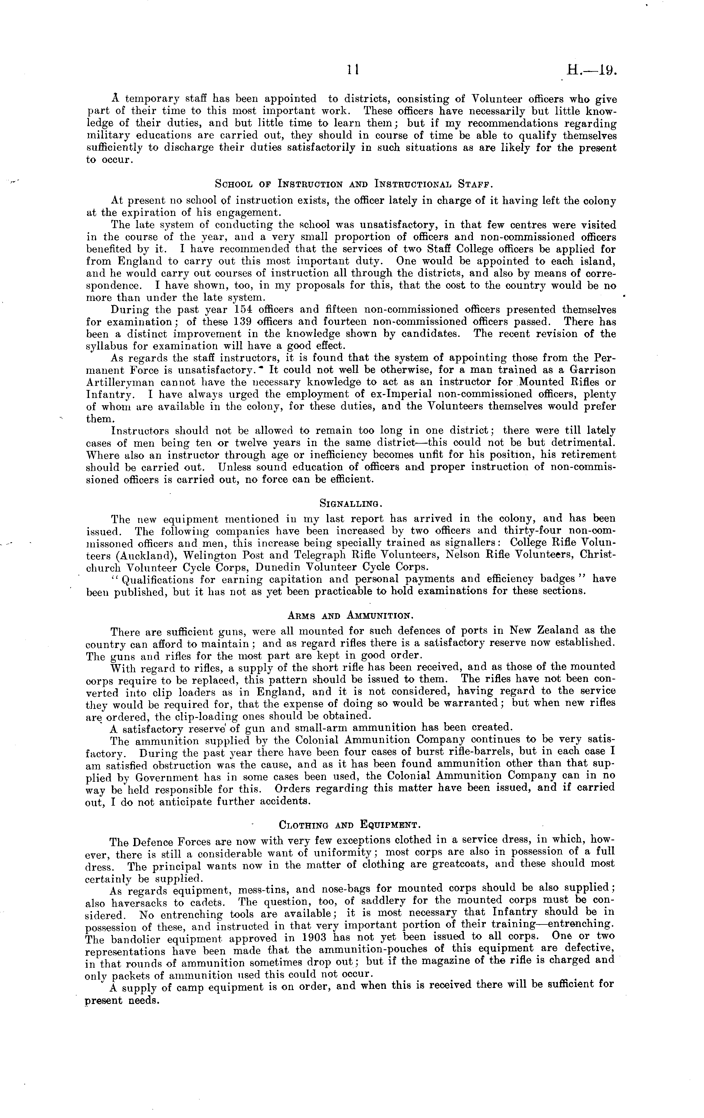 A temporary staff has been appointed to districts, consisting of Volunteer officers who give part of their time to this most important work. These officers have necessarily but little knowledge of their duties, and but little time to learn them; but if my recommendations regarding military educations are carried out, they should in course of time be able to qualify themselves sufficiently to discharge their duties satisfactorily in such situations as are likely for the present to occur. School of Instruction and Instructional Staff. At present no school of instruction exists, the officer lately in charge of it having left the colony at the expiration of his engagement. The late system of conducting the school was unsatisfactory, in that few centres were visited in the course of the year, and a very small proportion of officers and non-commissioned officers benefited by it. I have recommended that the services of two Staff College officers be applied for from England to carry out this most important duty. One would be appointed to each island, and he would carry out courses of instruction all through the districts, and also by means of correspondence. I have shown, too, in my proposals for this, that the cost to the country would be no more than under the late system. During the past year 154 officers and fifteen non-commissioned officers presented themselves for examination; of these 139 officers and fourteen non-commissioned officers passed. There has been a distinct improvement in the knowledge shown by candidates. The recent revision of the syllabus for examination will have a good effect. As regards the staff instructors, it is found that the system of appointing those from the Permanent Force is unsatisfactory." It could not well be otherwise, for a man trained as a Garrison Artilleryman cannot have the necessary knowledge to act as an instructor for Mounted Rifles or Infantry. I have always urged the employment of ex-Imperial non-commissioned officers, plenty of whom are available in the colony, for these duties, and the Volunteers themselves would prefer them. Instructors should not be allowed to remain too long in one district; there were till lately cases of men being ten or twelve years in the same district—this could not be but detrimental. Where also an instructor through age or inefficiency becomes unfit for his position, his retirement should be carried out. Unless sound education of officers and proper instruction of non-commis-sioned officers is carried out, no force can be efficient. Signalling. The new equipment mentioned in my last report has arrived in the colony, and has been issued. The following companies have been increased by two officers and thirty-four non-oom-missoned officers and men, this increase being specially trained as signallers : College Rifle Volunteers (Auckland), Welington Post and Telegraph Rifle Volunteers, Nelson Rifle Volunteers, Christchurch Volunteer Cycle Corps, Dunedin Volunteer Cycle Corps. " Qualifications for earning capitation and personal payments and efficiency badges " have been published, but it has not as yet been practicable to hold examinations for these sections. Arms and Ammunition. There are sufficient guns, were all mounted for such defences of ports in New Zealand as the country can afford to maintain; and as regard rifles there is a satisfactory reserve now established. The guns and rifles for the most part are kept in good order. With regard to rifles, a supply of the short rifle has been received, and as those of the mounted corps require to be replaced, this pattern should be issued to them. The rifles have not been converted into clip loaders as in England, and it is not considered, having regard to the service they would be required for, that the expense of doing so would be warranted; but when new rifles are. ordered, the clip-loading ones should be obtained. A satisfactory reserve' of gun and small-arm ammunition has been created. The ammunition supplied by the Colonial Ammunition Company continues to be very satisfactory. During the past year there have been four cases of burst rifle-barrels, but in each case I am satisfied obstruction was the cause, and as it has been found ammunition other than that supplied by Government has in some cases been used, the Colonial Ammunition Company can in no way be held responsible for this. Orders regarding this matter have been issued, and if carried out, I do not anticipate further accidents. Clothing and Equipment. The Defence Forces are now with very few exceptions clothed in a service dress, in which, however, there is still a considerable want of uniformity; most corps are also in possession of a full dress. The principal wants now in the matter of clothing are greatcoats, and these should most certainly be supplied. As "regards equipment, mess-tins, and nose-bags for mounted corps should be also supplied ; also haversacks to cadets. The question, too, of saddlery for the mounted corps must be considered. No entrenching tools are available; it is most necessary that Infantry should be in possession of these, and instructed in that very important portion of their training—entrenching. The bandolier equipment approved in 1903 has not yet been issued to all corps. One or two representations have been made that the ammunition-pouches of this equipment are defective, in that rounds of ammunition sometimes drop out; but if the magazine of the rifle is charged and only packets of ammunition used this could not occur. A supply of camp equipment is on order, and when this is received there will be sufficient for present needs.
