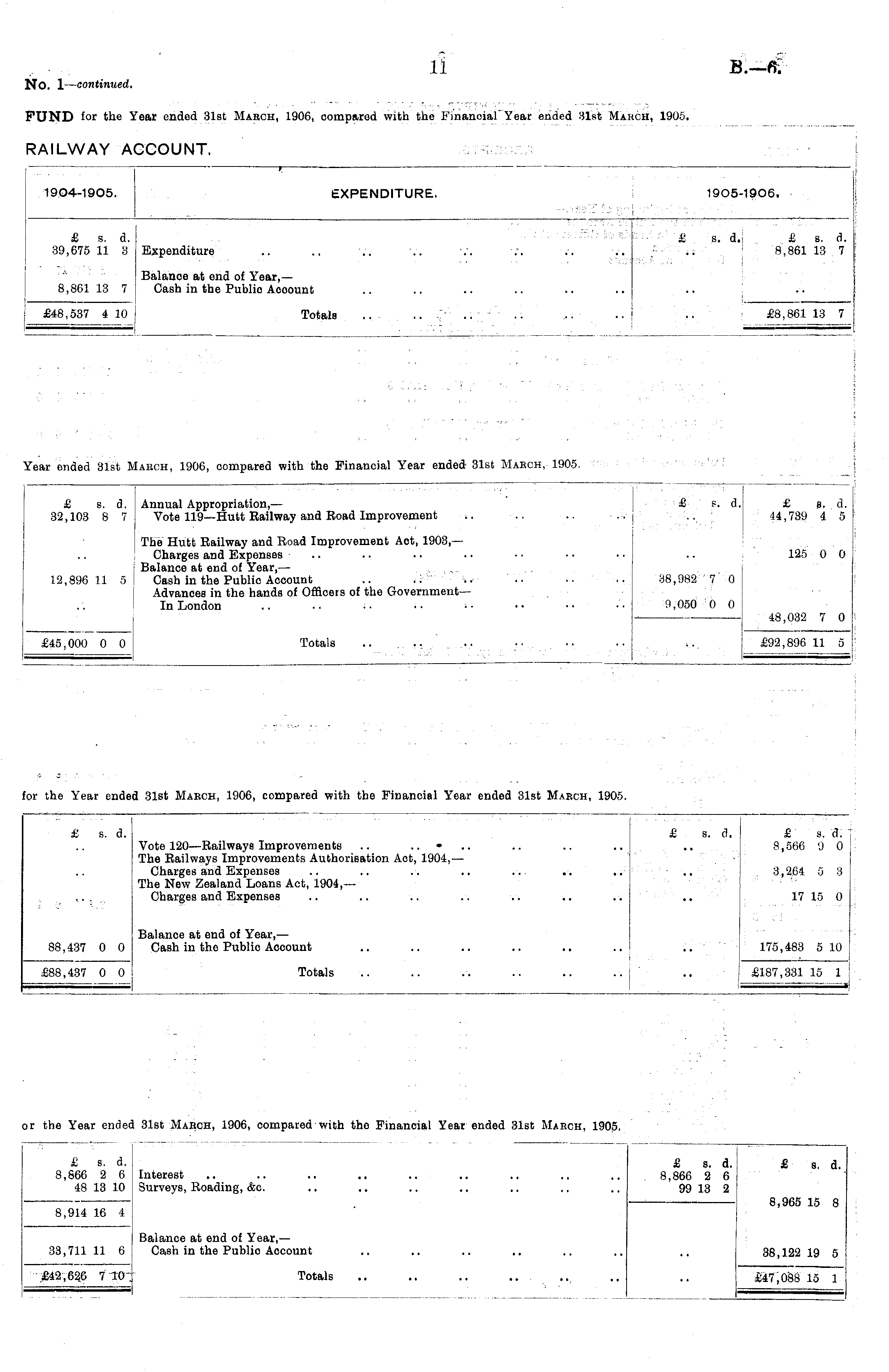 1904-1905. EXPENDITURE. 1905-1906. £ s. d. 39,675 11 3 Expenditure Balance at end of Year, — 8,861 13 7 Cash in the Public Aooount £48,537 4 10 j Totals ..- .. : .. .. i £ s. d.: £ s. d. 8,861 13 7 £8,861 13 7 £8,861 13 7 i Year ended 81st ar ended 31st March, 1906, compared with the Financial Year ended 31st March, 1905. I £ s. d. 32,103 8 7 Annual Appropriation,— Vote 119—Hutt Railway and Road Improvement .. £ s. d. £ s. d. 44,739 4 5 12,896 11 5 The Hutt Railway and Road Improvement Aot, 1903 — Charges and Expenses Balance at end of Year, — Cash in the Public Account .. .. Advances in the hands of Officers of the Government— In London .. .. ■ ■ • • ■ ■ 38,982 7' 0 | 125 0 0 9,050 0 0 48,032 7 0 £45,000 0 0 Totals .. ........ £92,896 11 5 'or the Year ended I 31st March, 1906, compared with the Financial Year ended 31st March, 1905. £ s. d. £ s. d. £ s. d. 8,566 9 0 Vote 120—Railways Improvements .. .. • The Railways Improvements Authorisation Aot, 1904, — Charges and Expenses The New Zealand Loans Act, 1904, — Charges and Expenses 3,2,64 5 3 17 15 0 88,437 0 0 Balance at end of Year, — Cash in the Public Account 175,483 5 10 Totals £187,331 15 1 £88,437 0 0 or the Year ended 1 31st March, 1906, compared with the Financial Year ended 31st March, 1905. £ s. d. 8,866 2 6 48 13 10 £ s. d. 8,866 2 6 48 13 10 Interest .. .. .. .. .. .. ., .. Surveys, Roading, &c. £ s. d. . 8,866 2 6 99 13 2 £ . 8,8 i £ 366 99 s 5 i ) 16 s. 2 3 d. 6 2 £ Q Oi £ s. d. 8,914 16 4 8,9i 8,965 15 8 8,914 16 4 33,711 11 6 Balance at end of Year,— Cash in the Publio Account 38,1! L22 33,711 11 6 38,122 19 5 £42,626 7 10 -; £42,626 7 10: Totals .. .. .. ........ £47, Oi £47,088 15 1 188 j