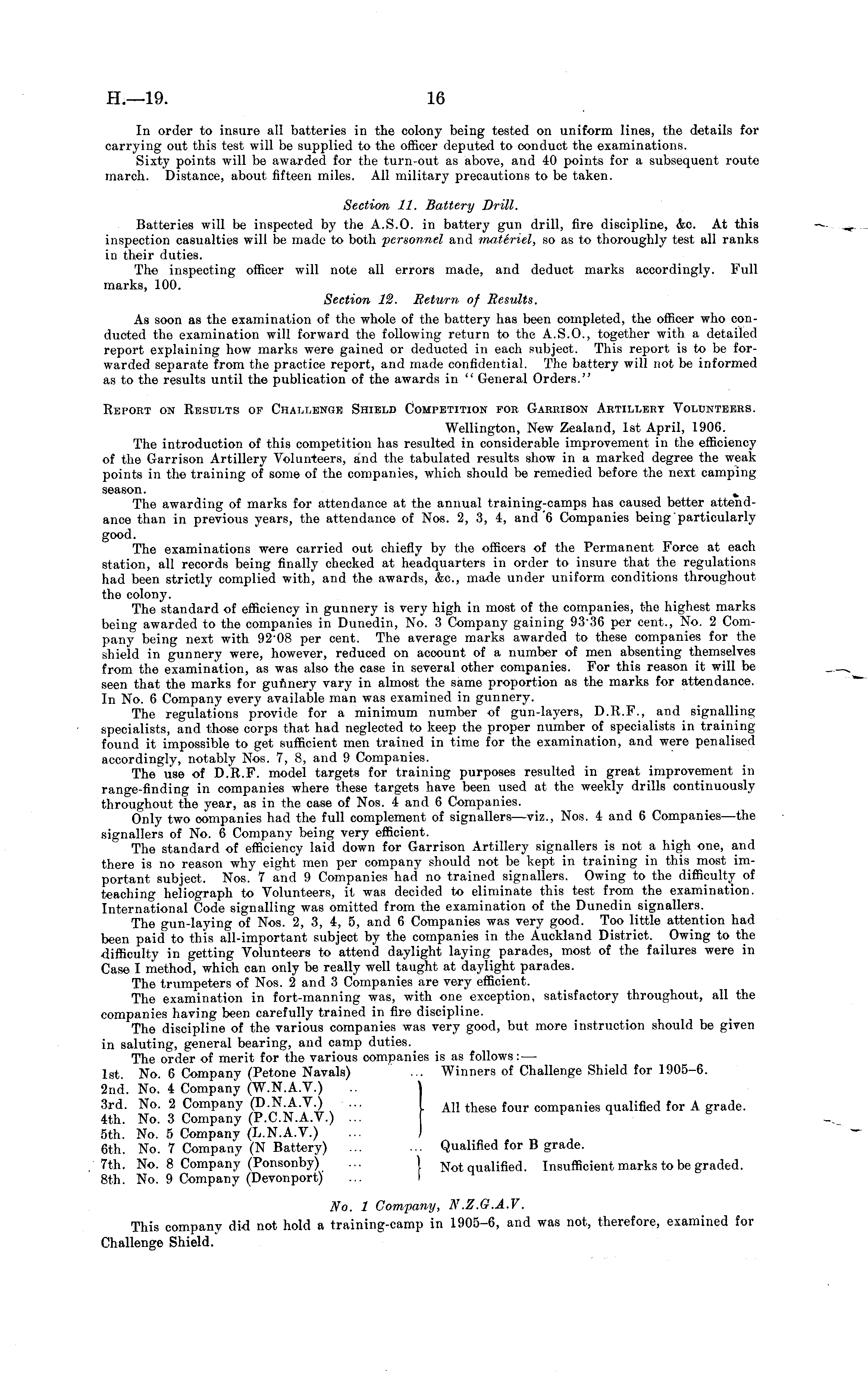 In order to insure all batteries in the colony being tested on uniform lines, the details for carrying out this test will be supplied to the officer deputed to conduct the examinations. Sixty points will be awarded for the turn-out as above, and 40 points for a subsequent route inarch. Distance, about fifteen miles. AH military precautions to be taken. Section 11. Battery Drill. Batteries will be inspected by the A.S.O. in battery gun drill, fire discipline, &c. At this inspection casualties will be made to both personnel and materiel, so as to thoroughly test all ranks in their duties. The inspecting officer will note all errors made, and deduct marks accordingly. Full marks, 100. Section 12. Return of Results. As soon as the examination of the whole of the battery has been completed, the officer who conducted the examination will forward the following return to the A.5.0., together with a detailed report explaining how marks were gained or deducted in each subject. This report is to be forwarded separate from the practice report, and made confidential. The battery will not be informed as to the results until the publication of the awards in " General Orders." Report on Results of Challenge Shield Competition for Garrison Artillery Volunteers. Wellington, New Zealand, Ist April, 1906. The introduction of this competition has resulted in considerable improvement in the efficiency of the Garrison Artillery Volunteers, and the tabulated results show in a marked degree the weak points in the training of some of the companies, which should be remedied before the next camping season. The awarding of marks for attendance at the annual training-camps has caused better attendance than in previous years, the attendance of Nos. 2, 3, 4, and '6 Companies being particularly good. The examinations were carried out chiefly by the officers of the Permanent Force at each station, all records being finally checked at headquarters in order to insure that the regulations had been strictly complied with, and the awards, &c, made under uniform conditions throughout the colony. The standard of efficiency in gunnery is very high in most of the companies, the highest marks being awarded to the companies in Dunedin, No. 3 Company gaining 9336 per cent., No. 2 Company being next with 9208 per cent. The average marks awarded to these companies for the shield in gunnery were, however, reduced on account of a number of men absenting themselves from the examination, as was also the case in several other companies. For this reason it will be seen that the marks for guftnery vary in almost the same proportion as the marks for attendance. In No. 6 Company every available man was examined in gunnery. The regulations provide for a minimum number of gun-layers, D.R.F., and signalling specialists, and those corps that had neglected to keep the proper number of specialists in training found it impossible to get sufficient men trained in time for the examination, and were penalised accordingly, notably Nos. 7, 8, and 9 Companies. The use of D.R.F. model targets for training purposes resulted in great improvement in range-finding in companies where these targets have been used at the weekly drills continuously throughout the year, as in the case of Nos. 4 and 6 Companies. Only two companies had the full complement of signallers —viz., Nos. 4 and 6 Companies—the signallers of No. 6 Company being very efficient. The standard of efficiency laid down for Garrison Artillery signallers is not a high one, and there is no reason why eight men per company should not be kept in training in this most important subject. Nos. 7 and 9 Companies had no trained signallers. Owing to the difficulty of teaching heliograph to Volunteers, it was decided to eliminate this test from the examination. International Code signalling was omitted from the examination of the Dunedin signallers. The gun-laying of Nos. 2, 3, 4, 5, and 6 Companies was very good. Too little attention had been paid to this all-important subject by the companies in the Auckland District. Owing to the difficulty in getting Volunteers to attend daylight laying parades, most of the failures were in Case I method, which can only be really well taught at daylight parades. The trumpeters of Nos. 2 and 3 Companies are very efficient. The examination in fort-manning was, with one exception, satisfactory throughout, all the companies having been carefully trained in fire discipline. The discipline of the various companies was very good, but more instruction should be given in saluting, general bearing, and camp duties.^ The order of merit for the various companies is as follows: — Ist. No. 6 Company (Petone Navals) ... Winners of Challenge Shield for 1905-6. 2nd. No. 4 Company (W.N.A.V.) 3rd. No. 2 Company (D.N.A.V.) ... All th four compan i e s qualified for A grade. 4th. No. 3 Company (P.C.N.A.V.) ... sth. No. 5 Company (L.N.A.V.) 6th. No. 7 Company (N Battery) ... ... Qualified for B grade. 7th. No. 8 Company (Ponsonby) ... 1 Not qualified. Insufficient marks to be graded. Bth. No. 9 Company (Devonport) ... I No. 1 Company, N.Z.G.A.V. This company did not hold a training-camp in 1905-6, and was not, therefore, examined for Challenge Shield.