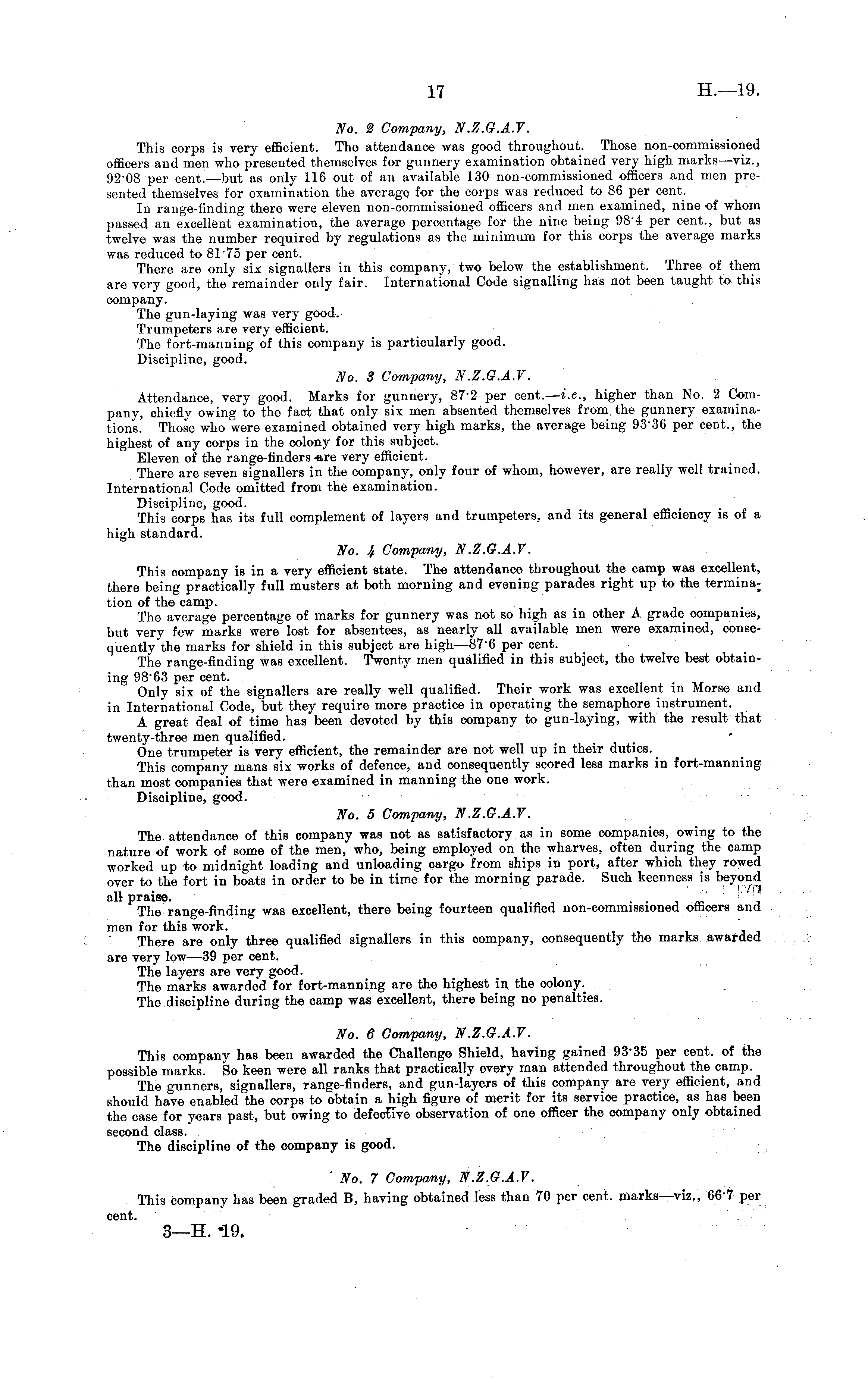 No. 2 Company, N.Z.G.A.V. This corps is very efficient. The attendance was good throughout. Those non-commissioned officers and men who presented themselves for gunnery examination obtained very high marks—viz., 92-08 per cent. —but as only 116 out of an available 130 non-commissioned officers and men presented themselves for examination the average for the corps was reduced to 86 per cent. In range-finding there were eleven non-commissioned officers and men examined, nine of whom passed an excellent examination, the average percentage for the nine being 984 per cent., but as twelve was the number required by regulations as the minimum for this corps the average marks was reduced to 8U75 per cent. There are only six signallers in this company, two below the establishment. Three of them are very good, the remainder only fair. International Code signalling has not been taught to this company. The gun-laying was very good. Trumpeters are very efficient. The fort-manning of this company is particularly good. Discipline, good. No. 3 Company, N.Z.G.A.V. Attendance, very good. Marks for gunnery, 87"2 per cent.-— i.e., higher than No. 2 Company, chiefly owing to the fact that only six men absented themselves from the gunnery examinations. Those who were examined obtained very high marks, the average being 9336 per cent., the highest of any corps in the colony for this subject. Eleven of the range-finders -are very efficient. There are seven signallers in the company, only four of whom, however, are really well trained. International Code omitted from the examination. Discipline, good. This corps has its full complement of layers and trumpeters, and its general efficiency is of a high standard. No. b Company, N.Z.G.A.V. This company is in a very efficient state. The attendance throughout the camp was excellent, there being practically full musters at both morning and evening parades right up to the termination of the camp. The average percentage of marks for gunnery was not so high as in other A grade companies, but very few marks were lost for absentees, as nearly all available men were examined, consequently the marks for shield in this subject are high—B7"6 per cent. The range-finding was excellent. Twenty men qualified in this subject, the twelve best obtaining 98 - 63 per cent. Only six of the signallers are really well qualified. Their work was excellent in Morse and in International Code, but they require more practice in operating the semaphore instrument. A great deal of time has been devoted by this company to gun-laying, with the result that twenty-three men qualified. One trumpeter is very efficient, the remainder are not well up in their duties. This company mans six works of defence, and consequently scored less marks in fort-manning than most companies that were examined in manning the one work. Discipline, good. No. 5 Company, N.Z.G.A.V. The attendance of this company was not as satisfactory as in some companies, owing to the nature of work of some of the men, who, being employed on the wharves, often during the camp worked up to midnight loading and unloading cargo from ships in port, after which they rowed over to the fort in boats in order to be in time for the morning parade. Such keenness is beyond all praise. .."_•___ The range-finding was excellent, there being fourteen qualified non-commissioned officers and men for this work. There are only three qualified signallers in this company, consequently the marks awarded are very low —39 per cent. The layers are very good. The marks awarded for fort-manning are the highest in the colony. The discipline during the camp was excellent, there being no penalties. No. 6 Company, N.Z.G.A.V. This company has been awarded the Challenge Shield, having gained 9335 per cent, of the possible marks. So keen were all ranks that practically every man attended throughout the camp. The gunners, signallers, range-finders, and gun-layers of this company are very efficient, and should have enabled the corps to obtain a high figure of merit for its service practice, as has been the case for years past, but owing to defec-ive observation of one officer the company only obtained second class. The discipline of the company is good. ' No. 7 Company, N.Z.G.A.V. This company has been graded B, having obtained less than 70 per cent, marks —viz., 66"7 per cent.