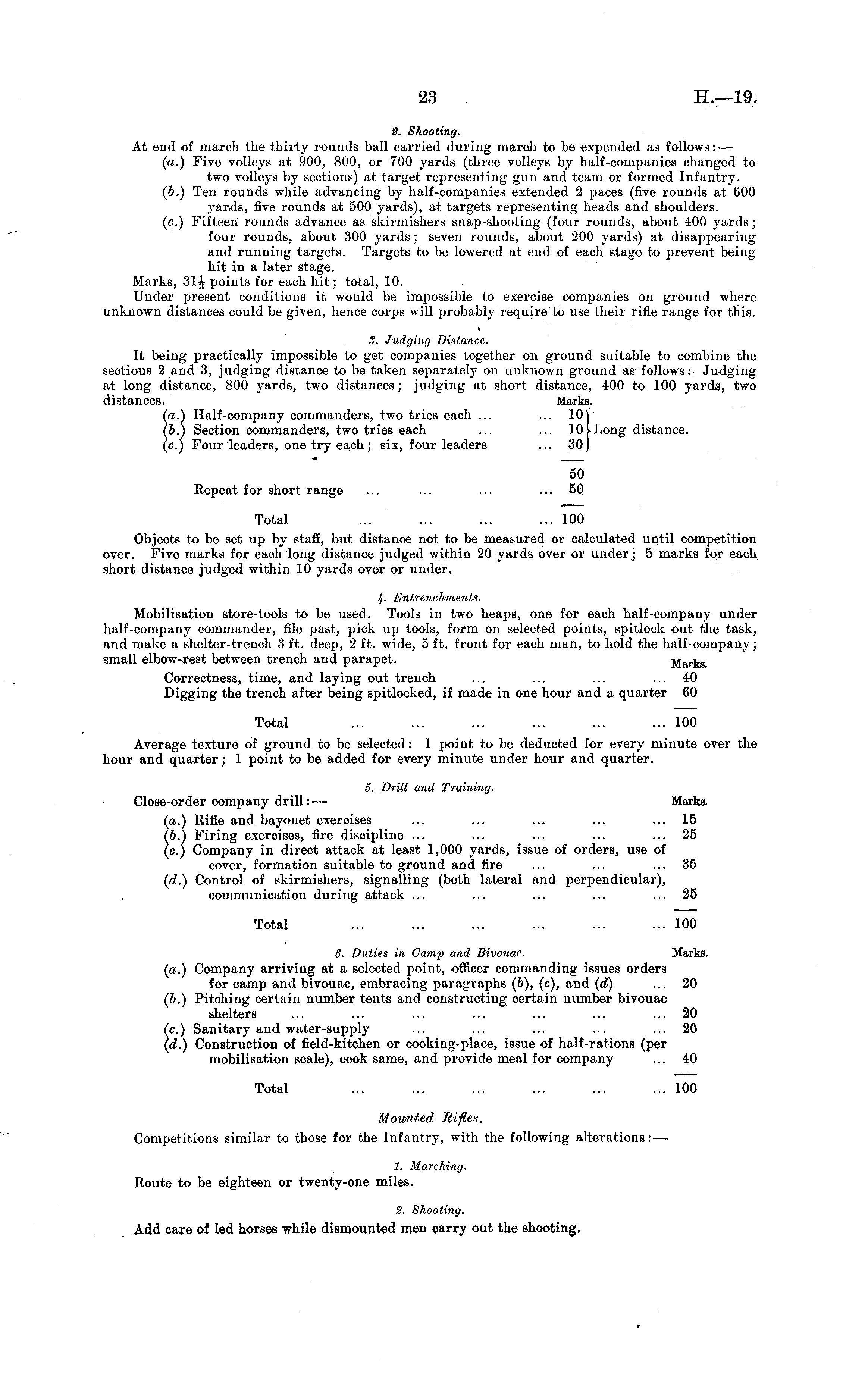 „. Shooting. At end of march the thirty rounds ball carried during march to be expended as follows: — (a.) Five volleys at 900, 800, or 700 yards (three volleys by half-companies changed to two volleys by sections) at target representing gun and team or formed Infantry. (..) Ten rounds while advancing by half-companies extended 2 paces (five rounds at 600 yards, five rounds at 500 yards), at targets representing heads and shoulders, (c.) Fifteen rounds advance as skirmishers snap-shooting (four rounds, about 400 yards; four rounds, about 300 yards; seven rounds, about 200 yards) at disappearing and running targets. Targets to be lowered at end of each stage to prevent being hit in a later stage. Marks, 31 1 points for each hit; total, 10. Under present conditions it would be impossible to exercise companies on ground where unknown distances could be given, hence corps will probably require to use their rifle range for this. _. Judging Distance. It being practically impossible to get companies together on ground suitable to combine the sections 2 and 3, judging distance to be taken separately on unknown ground as follows: Judging at long distance, 800 yards, two distances; judging at short distance, 400 to 100 yards, two distances. Marks. (a.) Half-company commanders, two tries each ... ... 10 (_.) Section commanders, two tries each ... ... 10 Long distance. (..) Four leaders, one try each; six, four leaders ... 30 50 Repeat for short range ... ... ... ... 50 Total ... ... ... ... 100 Objects to be set up by staff, but distanoe not to be measured or calculated until competition over. Five marks for each long distance judged within 20 yards over or under; 5 marks for each short distance judged within 10 yards over or under. If. Entrenchments. Mobilisation store-tools to be used. Tools in two heaps, one for each half-company under half-company commander, file past, pick up tools, form on selected points, spitlock out the task, and make a shelter-trench 3 ft. deep, 2 ft. wide, 5 ft. front for each man, to hold the half-company ; small elbow-rest between trench and parapet. Marks. Correctness, time, and laying out trench ... ... ... ... 40 Digging the trench after being spitlocked, if made in one hour and a quarter 60 Total ... ... ... ... ... ... 100 Average texture of ground to be selected: 1 point to be deducted for every minute over the hour and quarter; 1 point to be added for every minute under hour and quarter. 5. Drill and Training. Close-order oompany drill:- —• Marks. (a.) Rifle and bayonet exercises ... ... ... ... ... 15 (_.) Firing exercises, fire discipline ... ... ... ... ... 25 (c.) Company in direct attack at least 1,000 yards, issue of orders, use of cover, formation suitable to ground and fire ... ... ... 35 (_■.) Control of skirmishers, signalling (both lateral and perpendicular), communication during attack ... ... ... ... ... 25 Total ... ... ... ... ... ... 100 .. Duties in Camp and Bivouac. Marks. (a.) Company arriving at a selected point, officer commanding issues orders for camp and bivouac, embracing paragraphs (b), (c), and (d) ... 20 (6.) Pitching certain number tents and constructing certain number bivouac shelters ... ... ... ... ... ... ... 20 (c.) Sanitary and water-supply ... ... ... ... ... 20 (d.) Construction of field-kitchen or cooking-place, issue of half-rations (per mobilisation scale), cook same, and provide meal for company ... 40 Total ... ... ... ... ... ... 100 Mounted Rifles. Competitions similar to those for the Infantry, with the following alterations: — 1. Marching. Route to be eighteen or twenty-one miles. 2. Shooting. Add care of led horses while dismounted men carry out the shooting.