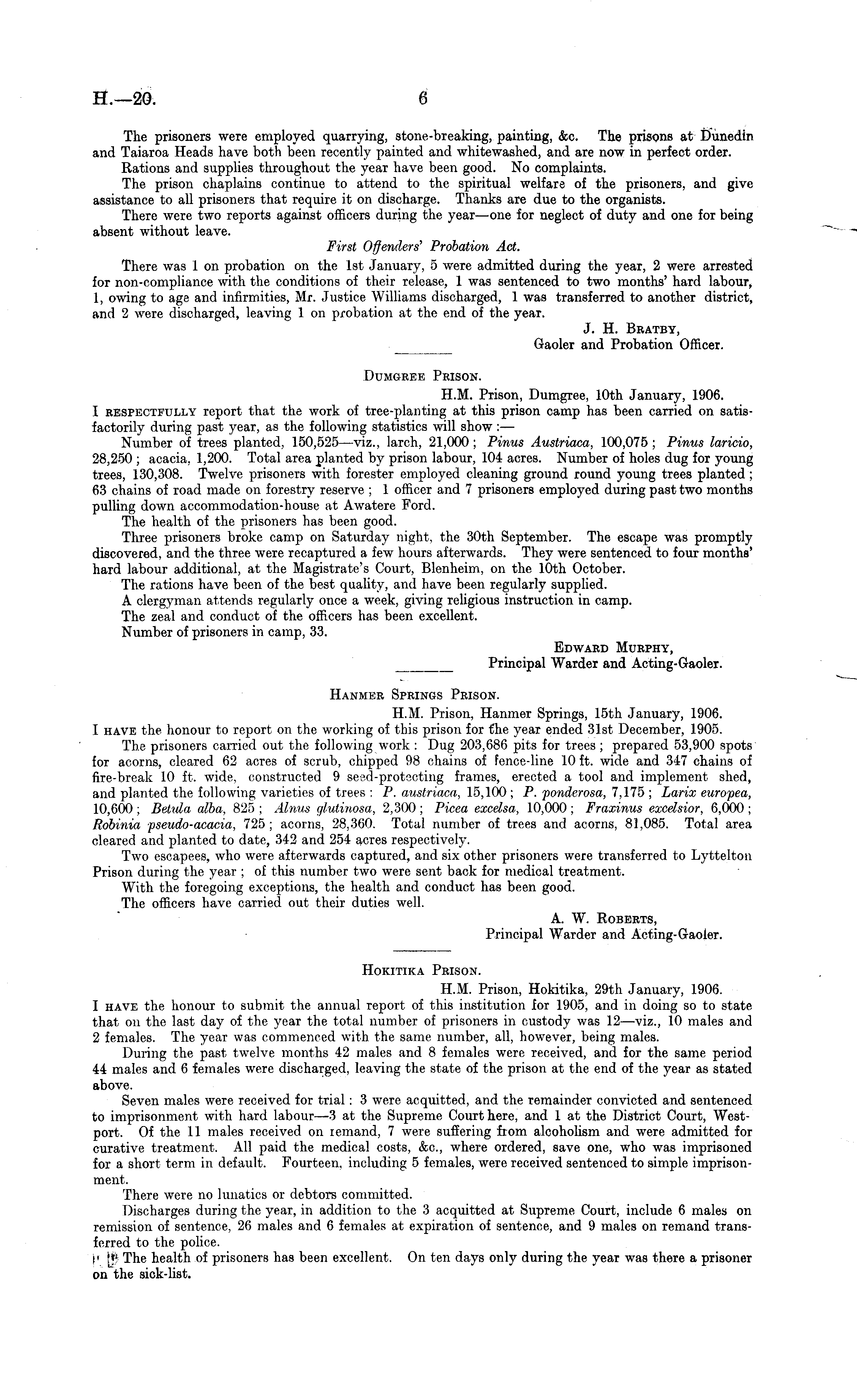 The prisoners were employed quarrying, stone-breaking, painting, &c. The prisons at Dunedin and Taiaroa Heads have both been recently painted and whitewashed, and are now in perfect order. Rations and supplies throughout the year have been good. No complaints. The prison chaplains continue to attend to the spiritual welfare of the prisoners, and give assistance to all prisoners that require it on discharge. Thanks are due to the organists. There were two reports against officers during the year—one for neglect of duty and one for being absent without leave. First Offenders' Probation Act. There was 1 on probation on the Ist January, 5 were admitted during the year, 2 were arrested for non-compliance with the conditions of their release, 1 was sentenced to two months' hard labour, 1, owing to age and infirmities, Mr. Justice Williams discharged, 1 was transferred to another district, and 2 were discharged, leaving 1 on probation at the end of the year. J. H. Bratby, Gaoler and Probation Officer. Dumgree Prison. H.M. Prison, Dumgree, 10th January, 1906. I respectfully report that the work of tree-planting at this prison camp has been carried on satisfactorily during past year, as the following statistics will show : — Number of trees planted, 150,525 —viz., larch, 21,000 ; Pinus Austriaca, 100,075 ; Pinus laricio, 28,250 ; acacia, 1,200. Total area planted by prison labour, 104 acres. Number of holes dug for young trees, 130,308. Twelve prisoners with forester employed cleaning ground round young trees planted ; 63 chains of road made on forestry reserve ; 1 officer and 7 prisoners employed during past two months pulling down accommodation-house at Awatere Ford. The health of the prisoners has been good. Three prisoners broke camp on Saturday night, the 30th September. The escape was promptly discovered, and the three were recaptured a few hours afterwards. They were sentenced to four months' hard labour additional, at the Magistrate's Court, Blenheim, on the 10th October. The rations have been of the best quality, and have been regularly supplied. A clergyman attends regularly once a week, giving religious instruction in camp. The zeal and conduct of the officers has been excellent. Number of prisoners in camp, 33. Edward Murphy, Principal Warder and Acting-Gaoler. Hanmer Springs Prison. H.M. Prison, Hanmer Springs, 15th January, 1906. I have the honour to report on the working of this prison for the year ended 31st December, 1905. The prisoners carried out the following work : Dug 203,686 pits for trees ; prepared 53,900 spots for acorns, cleared 62 acres of scrub, chipped 98 chains of fence-line 10 ft. wide and 347 chains of fire-break 10 ft. wide, constructed 9 seed-protecting frames, erected a tool and implement shed, and planted the following varieties of trees : P. austriaca, 15,100 ; P. ponderosa, 7,175 ; Larix europea, 10,600 ; Betula alba, 825 ; Alrms glutinosa, 2,300 ; Picea excelsa, 10,000 ; Fraxinus excelsior, 6,000 ; Robinia pseudo-acacia, 725; acorns, 28,360. Total number of trees and acorns, 81,085. Total area cleared and planted to date, 342 and 254 acres respectively. Two escapees, who were afterwards captured, and six other prisoners were transferred to Lyttelton Prison during the year ; of this number two were sent back for medical treatment. With the foregoing exceptions, the health and conduct has been good. The officers have carried out their duties well. A. W. Roberts, Principal Warder and Acting-Gaoler. Hokitika Prison. H.M. Prison, Hokitika, 29th January, 1906. 1 have the honour to submit the annual report of this institution for 1905, and in doing so to state that on the last day of the year the total number of prisoners in custody was 12—viz., 10 males and 2 females. The year was commenced with the same number, all, however, being males. During the past twelve months 42 males and 8 females were received, and for the same period 44 males and 6 females were discharged, leaving the state of the prison at the end of the year as stated above. Seven males were received for trial: 3 were acquitted, and the remainder convicted and sentenced to imprisonment with hard labour —3 at the Supreme Court here, and lat the District Court, Westport. Of the 11 males received on lemand, 7 were suffering from alcoholism and were admitted for curative treatment. All paid the medical costs, &c, where ordered, save one, who was imprisoned for a short term in default. Fourteen, including 5 females, were received sentenced to simple mentThere were no lunatics or debtors committed. Discharges during the year, in addition to the 3 acquitted at Supreme Court, include 6 males on remission of sentence, 26 males and 6 females at expiration of sentence, and 9 males on remand transferred to the police. i' I* The health of prisoners has been excellent. On ten days only during the year was there a prisoner on the sick-list.