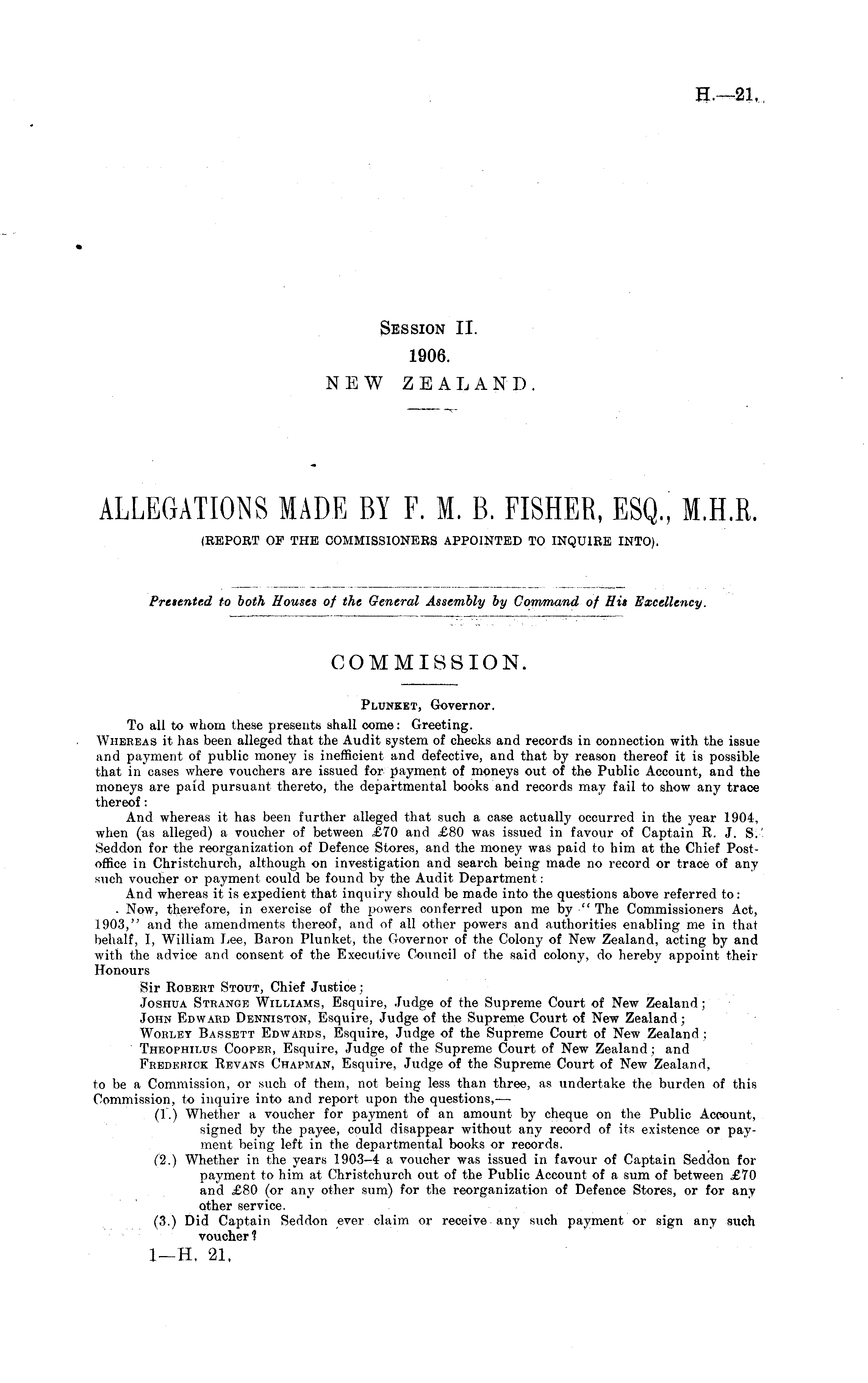 COMMISSION. Plunket, Governor. To all to whom these presents shall come: Greeting. Whereas it has been alleged that the Audit system of checks and records in connection with the issue and payment of public money is inefficient and defective, and that by reason thereof it is possible that in cases where vouchers are issued for payment of moneys out of the Public Account, and the moneys are paid pursuant thereto, the departmental books and records may fail to show any trace thereof: And whereas it has been further alleged that such a case actually occurred in the year 1904, when (as alleged) a voucher of between £70 and £80 was issued in favour of Captain R. J. S. Seddon for the reorganization of Defence Stores, and the money was paid to him at the Chief Postoffice in Christchurch, although on investigation and search being made no record or trace of any such voucher or payment could be found by the Audit Department: And whereas it is expedient that inquiry should be made into the questions above referred to: . Now, therefore, in exercise of the powers conferred upon me by " The Commissioners Act, 1903," and the amendments thereof, and of all other powers and authorities enabling me in that behalf, I, William Lee, Baron Plunket, the Governor of the Colony of New Zealand, acting by and with the advice and consent of the Executive Council of the said colony, do hereby appoint their Honours Sir Robert Stout, Chief Justice : Joshua Strange Williams, Esquire, Judge of the Supreme Court of New Zealand ; John Edward Denniston, Esquire, Judge of the Supreme Court of New Zealand; Worlkt Bassett Edwards, Esquire, Judge of the Supreme Court of New Zealand : Theophilus Cooper, Esquire, Judge of the Supreme Court of New Zealand; and Frederick Revans Chapman, Esquire, Judge of the Supreme Court of New Zealand, to be a Commission, or such of them, not being less than three, as undertake the burden of this Commission, to inquire into and report upon the questions,— (1.) Whether a voucher for payment of an amount by cheque on the Public Account, signed by the payee, could disappear without any record of its existence or payment being left in the departmental books or records. (2.) Whether in the years 1903-4 a voucher was issued in favour of Captain Seddon for payment to him at Christchurch out of the Public Account of a sum of between £70 and £80 (or any other sum) for the reorganization of Defence Stores, or for any other service. (3.) Did Captain Seddon ever claim or receive any such payment or sign any such voucher 1 I—H. 21,