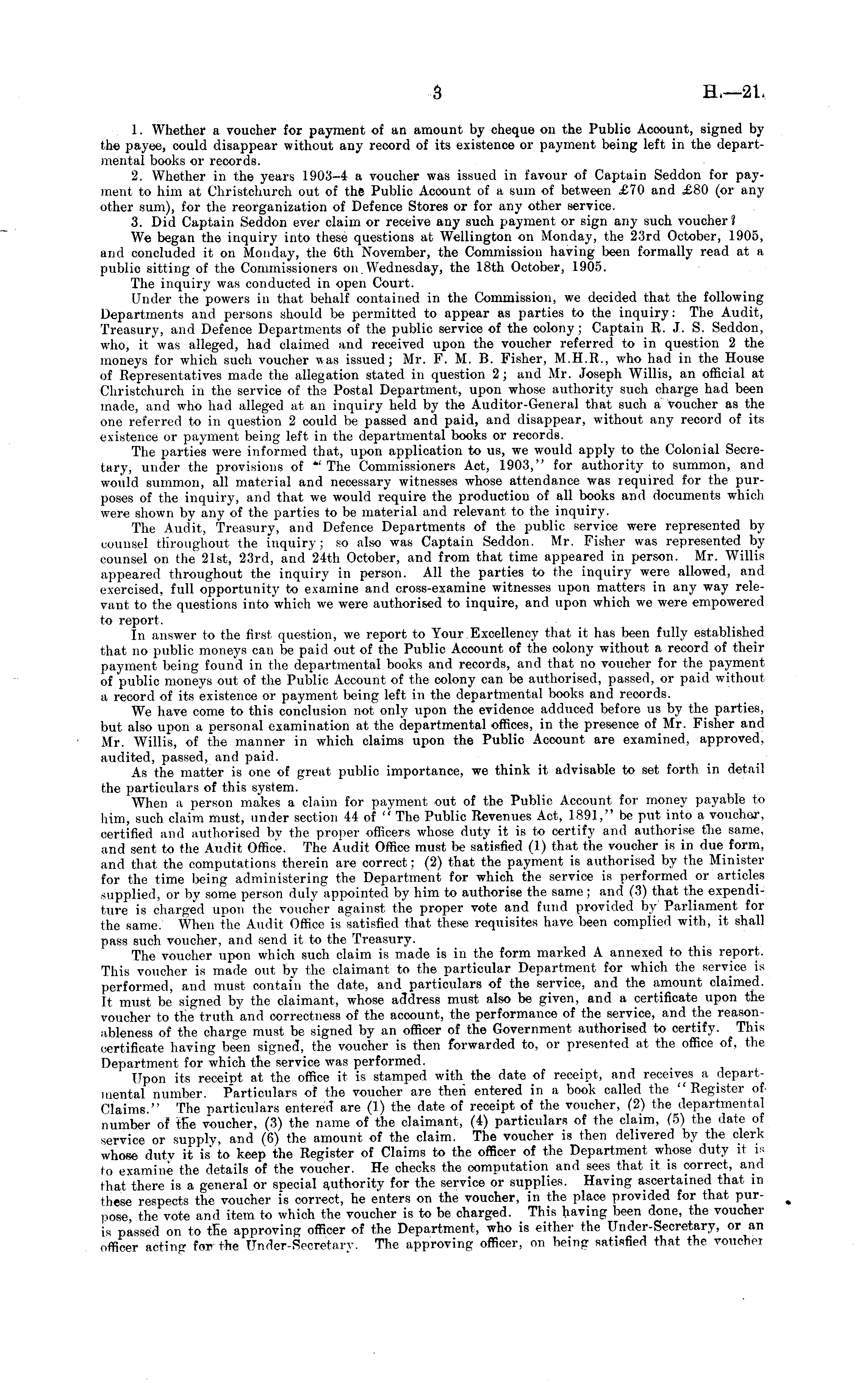 1. Whether a voucher for payment of an amount by cheque on the Public Account, signed by the payee, could disappear without any record of its existence or payment being left in the departmental books or records. 2. Whether in the years 1903—4 a voucher was issued in favour of Captain Seddon for payment to him at Christchurch out of the Public Account of a sum of between £70 and £80 (or any other sum), for the reorganization of Defence Stores or for any other service. 3. Did Captain Seddon ever claim or receive any such payment or sign any such voucher? We began the inquiry into these questions at Wellington on Monday, the 23rd October, 1905, and concluded it on Monday, the 6th November, the Commission having been formally read at a public sitting of the Commissioners on.Wednesday, the 18th October, 1905. The inquiry was conducted in open Court. Under the powers in that behalf contained in the Commission, we decided that the following Departments and persons should be permitted to appear as parties to the inquiry: The Audit, Treasury, and Defence Departments of the public service of the colony; Captain R. J. S. Seddon, who, it was alleged, had claimed and received upon the voucher referred to in question 2 the moneys for which such voucher was issued; Mr. F. M. B. Fisher, M.H.R., who had in the House of Representatives made the allegation stated in question 2; and Mr. Joseph Willis, an official at Christchurch in the service of the Postal Department, upon whose authority such charge had been made, and who had alleged at an inquiry held by the Auditor-General that such a voucher as the one referred to in question 2 could be passed and paid, and disappear, without any record of its existence or payment being left in the departmental books or records. The parties were informed that, upon application to us, we would apply to the Colonial Secretary, under the provisions of * The Commissioners Act, 1903," for authority to summon, and would summon, all material and necessary witnesses whose attendance was required for the purposes of the inquiry, and that we would require the production of all books and documents which were shown by any of the parties to be material and relevant to the inquiry. The Audit, Treasury, and Defence Departments of the public service were represented by counsel throughout the inquiry; so also was Captain Seddon. Mr. Fisher was represented by counsel on the 21st, 23rd, and 24th October, and from that time appeared in person. Mr. Willis appeared throughout the inquiry in person. All the parties to the inquiry were allowed, and exercised, full opportunity to examine and cross-examine witnesses upon matters in any way relevant to the questions into which we were authorised to inquire, and upon which we were empowered to report. In answer to the first question, we report to Your Excellency that it has been fully established that no public moneys can be paid out of the Public Account of the colony without a record of their payment being found in the departmental books and records, and that no voucher for the payment of public moneys out of the Public Account of the colony can be authorised, passed, or paid without a record of its existence or payment being left in the departmental books and records. We have come to this conclusion not only upon the evidence adduced before us by the parties, but also upon a personal examination at the departmental offices, in the presence of Mr. Fisher and Mr. Willis, of the manner in which claims upon the Public Account are examined, approved, audited, passed, and paid. As the matter is one of great public importance, we think it advisable to set forth in detail the particulars of this system. When a person makes a claim for payment out of the Public Account for money payable to him, such claim must, under section 44 of " The Public Revenues Act, 1891," be put into a voucher, certified and authorised by the proper officers whose duty it is to certify and authorise the same, and sent to the Audit Office. The A~udit Office must be satisfied (1) that the voucher is in due form, and that the computations therein are correct; (2) that the payment is authorised by the Minister for the time being administering the Department for which the service is performed or articles supplied, or by some person duly appointed by him to authorise the same ; and (3) that the expenditure is charged upon the voucher against the proper vote and fund provided by Parliament for the same. When the Audit Office is satisfied that these requisites have been complied with, it shall pass such voucher, and send it to the Treasury. The voucher upon which such claim is made is in the form marked A annexed to this report. This voucher is made out by the claimant to the particular Department for which the service is performed, and must contain the date, and particulars of the service, and the amount claimed. It must be signed by the claimant, whose address must also be given, and a certificate upon the voucher to the truth and correctness of the account, the performance of the service, and the reasonableness of the charge must be signed by an officer of the Government authorised to certify. This i«rtificate having been signed, the voucher is then forwarded to, or presented at the office of, the Department for which the service was performed. Upon its receipt at the office it is stamped with the date of receipt, and receives a departmental number. Particulars of the voucher are then entered in a book called the "Register of Claims." The particulars entered are (1) the date of receipt of the voucher, (2) the departmental number of tEe voucher, (3) the name of the claimant, (4) particulars of the claim, (5) the date of service or supply, and (6) the amount of the claim. The voucher is then delivered by the clerk whose duty it is to keep the Register of Claims to the officer of the Department whose duty it is to examine the details of the voucher. He checks the computation and 
