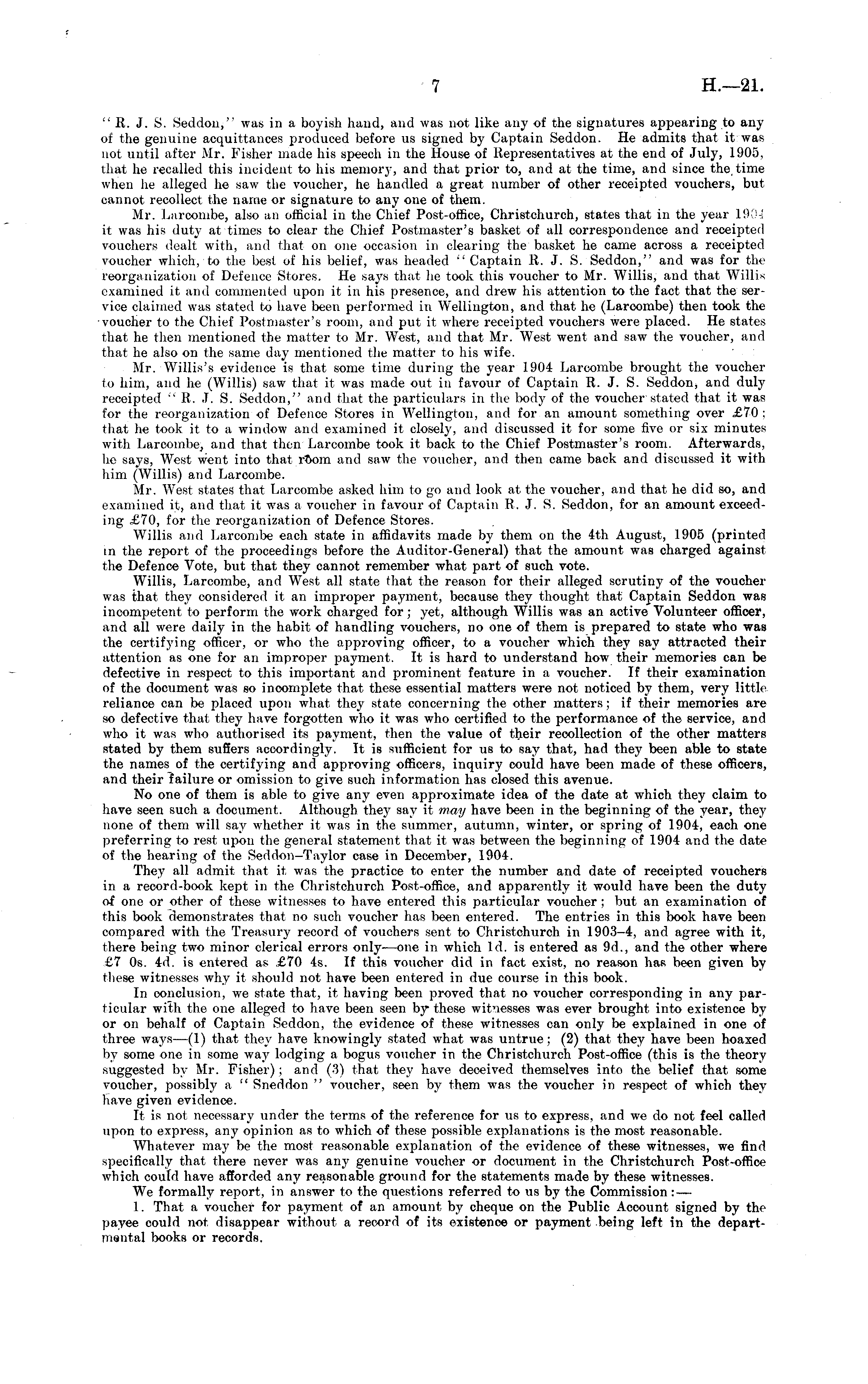 " R. J. S. Seddou," was in a boyish hand, and was not like any of the signatures appearing to any of the genuine acquittances: produced before us signed by Captain Seddon. He admits that it was not until after Mr. Fisher made his speech in the House of Representatives at the end of July, 1905, that he recalled this incident to his memory, and that prior to, and at the time, and since the, time when he alleged he saw the voucher, he handled a great number of other receipted vouchers, but cannot recollect the name or signature to any one of them. Mr. Ijiirconibe, also an official in the Chief Post-office, Christchurch, states that in the year l'.S : ' it was his duty at times to clear the Chief Postmaster's basket of all correspondence and receipted vouchers dealt with, and that on one occasion in clearing the basket he came across a receipted voucher which, to the best of his belief, was headed " Captain R. J. S. Seddon," and was for the reorganization of Defence Stores. He says that lie took this voucher to Mr. Willis, and that Willis examined it and commented upon it in his presence, and drew his attention to the fact that the service claimed was stated to have been performed in Wellington, and that he (Larcombe) then took the voucher to the Chief Postmaster's room, and put it where receipted vouchers were placed. He states that he then mentioned the matter to Mr. West, and that Mr. West went and saw the voucher, and that he also on the same day mentioned the matter to his wife. Mr. Willis's evidence is that some time during the year 1904 Larcombe brought the voucher to him, and he (Willis) saw that it was made out in favour of Captain R. J. S. Seddon, and duly receipted " R. J. S. Seddon," and that the particulars in the body of the voucher slated that it was for the reorganization of Defence Stores in Wellington, and for an amount something over £70; that he took it to a window and examined it closely, and discussed it for some five or six minutes with Larcombe, and that then Larcombe took it back to the Chief Postmaster's room. Afterwards, he says, West went into that room and saw the voucher, and then came back and discussed it with him (Willis) and Larcombe. Mr. West states that Larcombe asked him to go and look at the voucher, and that he did so, and examined it, and that it was a voucher in favour of Captain R. J. S. Seddon, for an amount exceeding £70, for the reorganization of Defence Stores. Willis and Larcombe each state in affidavits made by them on the 4th August, 1905 (printed in the report of the proceedings before the Auditor-General) that the amount was charged against the Defence Vote, but that they cannot remember what part of such vote. Willis, Larcombe, and West all state that the reason for their alleged scrutiny of the voucher was that they considered it an improper payment, because they thought that Captain Seddon was incompetent to perform the work charged for; yet, although Willis was an active Volunteer officer, and all were daily in the habit of handling vouchers, no one of them is prepared to state who was the certifying officer, or who the approving officer, to a voucher which they say attracted their attention as one for an improper payment. It is hard to understand how their memories can be defective in respect to this important and prominent feature in a voucher. If their examination of the document was so incomplete that these essential matters were not noticed by them, very little reliance can be placed upon what they state concerning the other matters; if their memories are so defective that they have forgotten who it was who certified to the performance of the service, and who it was who authorised its payment, then the value of their recollection of the other matters stated by them suffers accordingly. It is sufficient for us to say that, had they been able to state the names of the certifying and approving officers, inquiry could have been made of these officers, and their failure or omission to give such information has closed this avenue. No one of them is able to give any even approximate idea of the date at which they claim to have seen such a document. Although they say it may have been in the beginning of the year, they none of them will say whether it was in the summer, autumn, winter, or spring of 1904, each one preferring to rest upon the general statement that it was between the beginning of 1904 and the date of the hearing of the Seddon-Taylor case in December, 1904. They all admit that it was the practice to enter the number and date of receipted vouchers in a record-book kept in the Christchurch Post-office, and apparently it would have been the duty of one or other of these witnesses to have entered this particular voucher ; but an examination of this book demonstrates that no such voucher has been entered. The entries in this book have been compared with the Treasury record of vouchers sent to Christchurch in 1903-4, and agree with it, there being two minor clerical errors only—one in which Id. is entered as 9d., and the other where £7 os. 4d. is entered as £70 4s. If this voucher did in fact exist, no reason has been given by these witnesses why it should not have been entered in due course in this book. In conclusion, we state that, it having been proved that no voucher corresponding in any particular with the one alleged to have been seen by these wit'iesses was ever brought into existence by or on behalf of Captain Seddon, the evidence of these witnesses can only be explained in one of three ways —(1) that they have knowingly stated what was untrue; (2) that they have been hoaxed by some one in some way lodging a bogus voucher in the Christchurch Post-office (this is the theory suggested by Mr. Fisher); and (3) that they have deceived themselves into the belief that some voucher, possibly a " Sneddon " voucher, seen by them was the voucher in respect of which they have given evidence. It is not necessary under the terms o