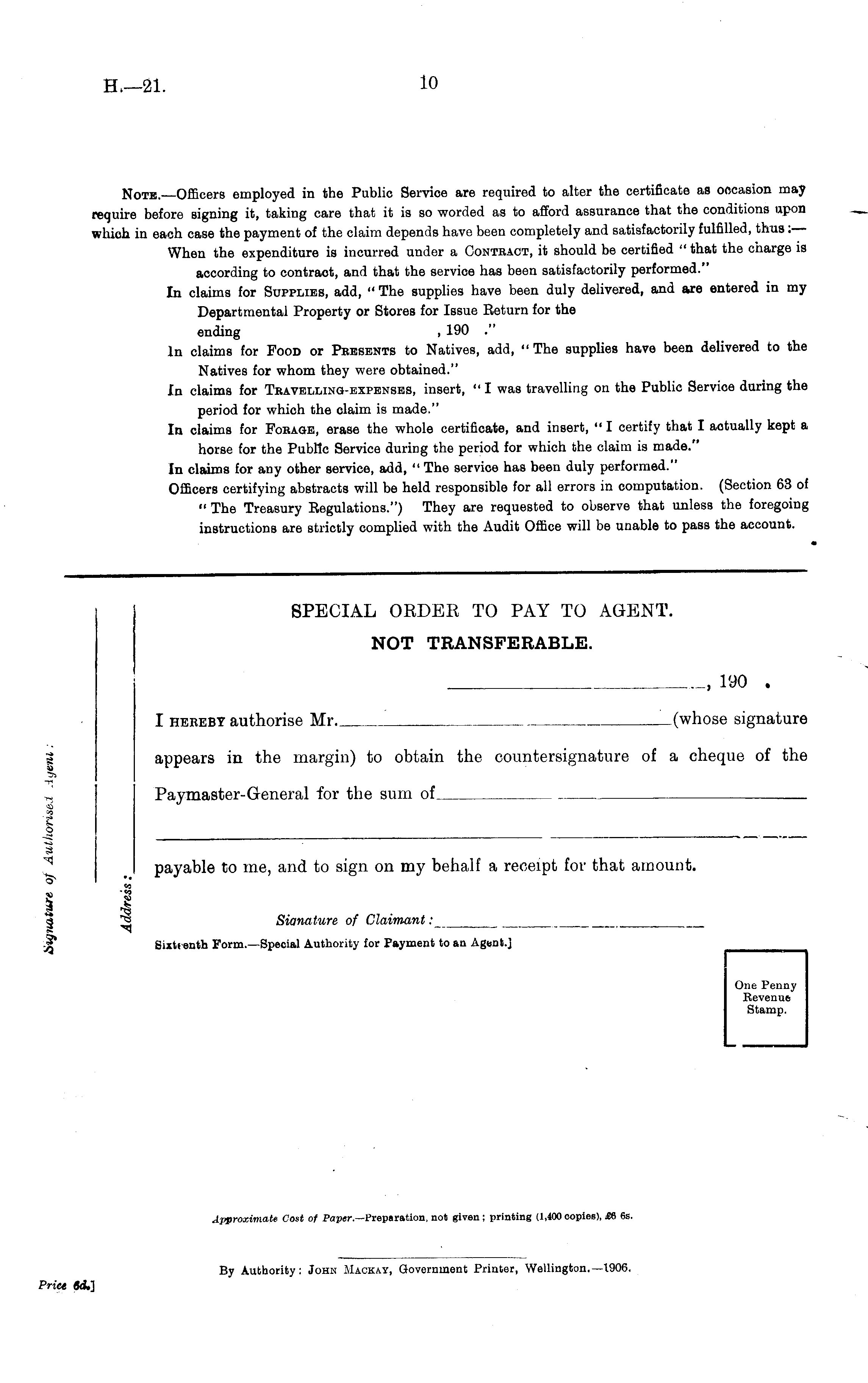 Note.—Officers employed in the Public Service are required to alter the certificate as occasion may require before signing it, taking care that it is so worded as to afford assurance that the conditions upon which in each case the payment of the claim depends have been completely and satisfactorily fulfilled, thus :— When the expenditure is incurred under a Contract, it should be certified " that the charge is according to contract, and that the service has been satisfactorily performed." In claims for Supplies, add, " The supplies have been duly delivered, and are entered in my Departmental Property or Stores for Issue Return for the ending , 190 In claims for Food or Pebsents to Natives, add, "The supplies have been delivered to the Natives for whom they were obtained." In claims for Travelling-expenses, insert, " I was travelling on the Public Service during the period for which the claim is made." In claims for Forage, erase the whole certificate, and insert, " I certify that I actually kept a horse for the Public Service during the period for which the claim is made." In claims for any other service, add, " The service has been duly performed." Officers certifying abstracts will be held responsible for all errors in computation. (Section 63 of " The Treasury Regulations.") They are requested to observe that unless the foregoing instructions are strictly complied with the Audit Office will be unable to pass the account.