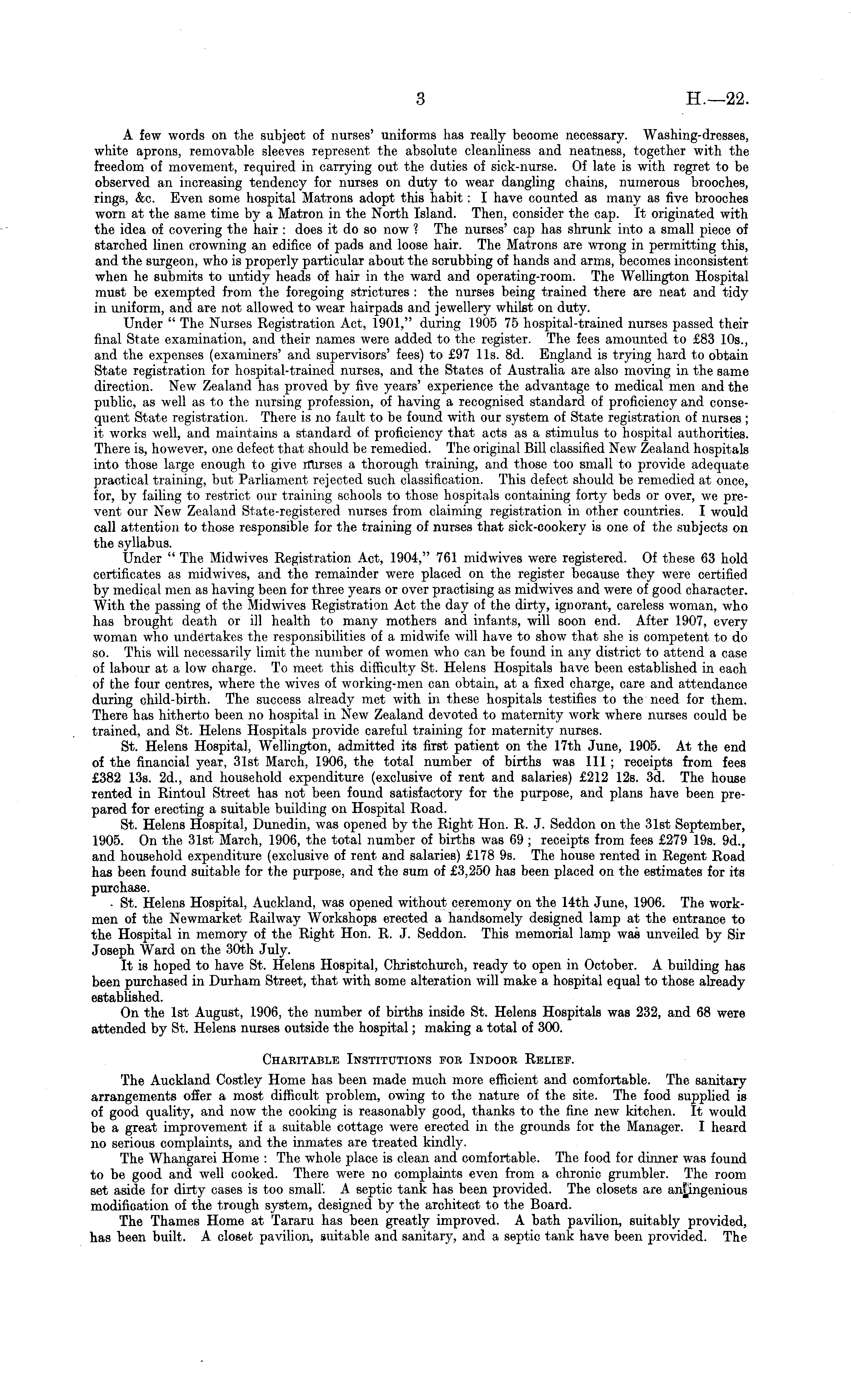 A few words on the subject of nurses' uniforms has really become necessary. Washing-dresses, white aprons, removable sleeves represent the absolute cleanliness and neatness, together with the freedom of movement, required in carrying out the duties of sick-nurse. Of late is with regret to be observed an increasing tendency for nurses on duty to wear dangling chains, numerous brooches, rings, &c. Even some hospital Matrons adopt this habit: I have counted as many as five brooches worn at the same time by a Matron in the North Island. Then, consider the cap. It originated with the idea of covering the hair : does it do so now 1 The nurses' cap has shrunk into a small piece of starched linen crowning an edifice of pads and loose hair. The Matrons are wrong in permitting this, and the surgeon, who is properly particular about the scrubbing of hands and arms, becomes inconsistent when he submits to untidy heads of hair in the ward and operating-room. The Wellington Hospital must be exempted from the foregoing strictures : the nurses being trained there are neat and tidy in uniform, and are not allowed to wear hairpads and jewellery whilst on duty. Under " The Nurses Registration Act, 1901," during 1905 75 hospital-trained nurses passed their final State examination, and their names were added to the register. The fees amounted to £83 10s., and the expenses (examiners' and supervisors' fees) to £97 lis. Bd. England is trying hard to obtain State registration for hospital-trained nurses, and the States of Australia are also moving in the same direction. New Zealand has proved by five years' experience the advantage to medical men and the public, as well as to the nursing profession, of having a recognised standard of proficiency and consequent State registration. There is no fault to be found with our system of State registration of nurses ; it works well, and maintains a standard of proficiency that acts as a stimulus to hospital authorities. There is, however, one defect that should be remedied. The original Bill classified New Zealand hospitals into those large enough to give rflirses a thorough training, and those too small to provide adequate practical training, but Parliament rejected such classification. This defect should be remedied at once, for, by failing to restrict our training schools to those hospitals containing forty beds or over, we prevent our New Zealand State-registered nurses from claiming registration in other countries. I would call attention to those responsible for the training of nurses that sick-cookery is one of the subjects on the syllabus. Under " The Midwives Registration Act, 1904," 761 midwives were registered. Of these 63 hold certificates as midwives, and the remainder were placed on the register because they were certified by medical men as having been for three years or over practising as midwives and were of good character. With the passing of the Midwives Registration Act the day of the dirty, ignorant, careless woman, who has brought death or ill health to many mothers and infants, will soon end. After 1907, every woman who undertakes the responsibilities of a midwife will have to show that she is competent to do so. This will necessarily limit the number of women who can be found in any district to attend a case of labour at a low charge. To meet this difficulty St. Helens Hospitals have been established in each of the four centres, where the wives of working-men can obtain, at a fixed charge, care and attendance during child-birth. The success already met with in these hospitals testifies to the need for them. There has hitherto been no hospital in New Zealand devoted to maternity work where nurses could be trained, and St. Helens Hospitals provide careful training for maternity nurses. St. Helens Hospital, Wellington, admitted its first patient on the 17th June, 1905. At the end of the financial year, 31st March, 1906, the total number of births was 111; receipts from fees £382 13s. 2d., and household expenditure (exclusive of rent and salaries) £212 12s. 3d. The house rented in Rintoul Street has not been found satisfactory for the purpose, and plans have been prepared for erecting a suitable building on Hospital Road. St. Helens Hospital, Dunedin, was opened by the Right Hon. R. J. Seddon on the 31st September, 1905. On the 31st March, 1906, the total number of births was 69 ; receipts from fees £279 19s. 9d., and household expenditure (exclusive of rent and salaries) £178 9s. The house rented in Regent Road has been found suitable for the purpose, and the sum of £3,250 has been placed on the estimates for its purchase. - St. Helens Hospital, Auckland, was opened without ceremony on the 14th June, 1906. The workmen of the Newmarket Railway Workshops erected a handsomely designed lamp at the entrance to the Hospital in memory of the Right Hon. R. J. Seddon. This memorial lamp was unveiled by Sir Joseph Ward on the 30th July. It is hoped to have St. Helens Hospital, Christchurch, ready to open in October. A building has been purchased in Durham Street, that with some alteration will make a hospital equal to those already established. On the Ist August, 1906, the number of births inside St. Helens Hospitals was 232, and 68 were attended by St. Helens nurses outside the hospital; making a total of 300. Charitable Institutions for Indoor Relief. The Auckland Costley Home has been made much more efficient and comfortable. The sanitary arrangements offer a most difficult problem, owing to the nature of the site. The food supplied is of good quality, and now the cooking is reasonably good, thanks to the fine new kitchen. It would be a great improvement if a suitable cottage were erected in the grounds for the Manager. I heard no serious complaints, and the inmates are treated kindly. The Whangarei Home : The whole place is clean and comfortable. The food for dinner was found to be good and well cooked. There were no complaints even from a chronic gru