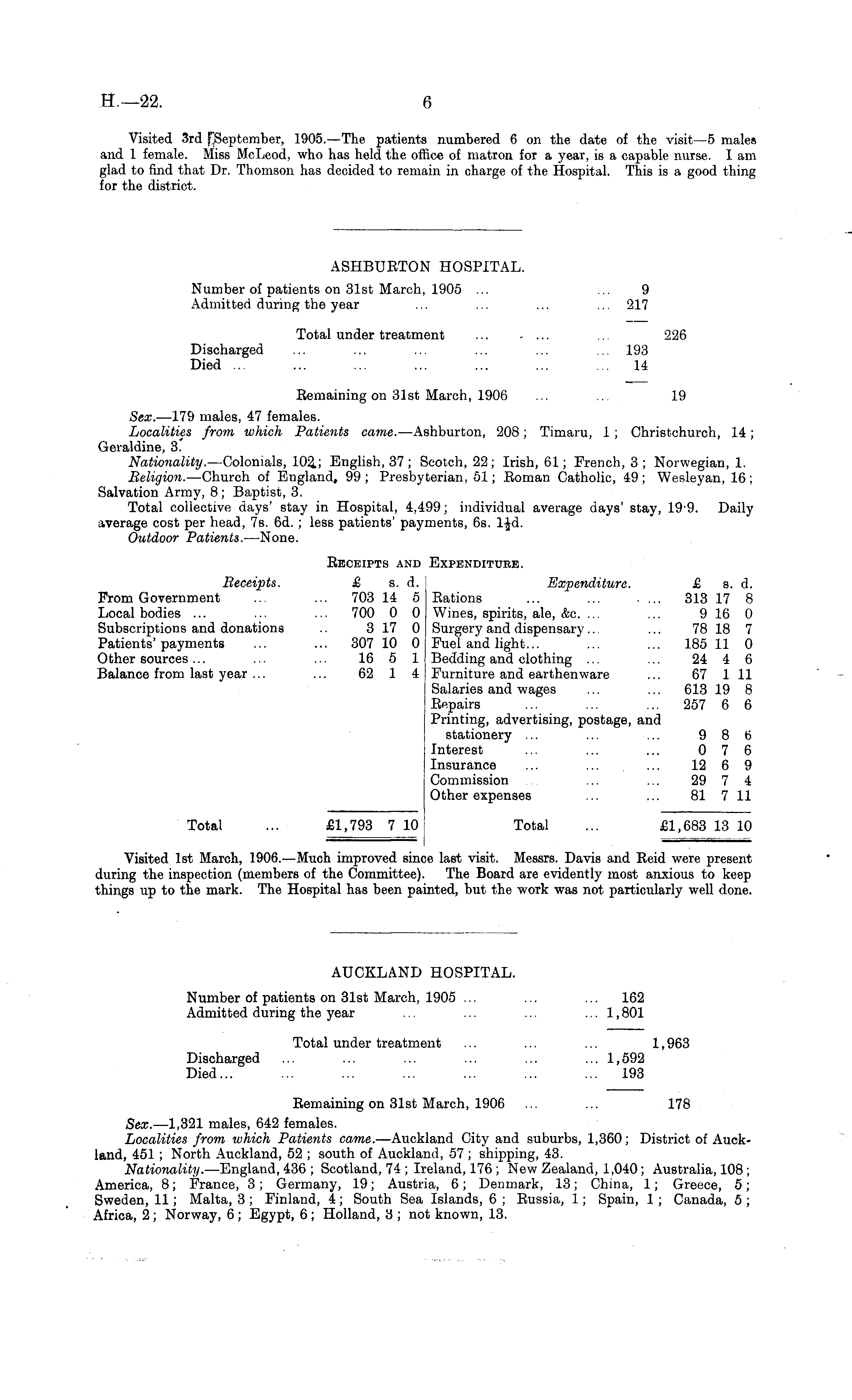Visited 3rd 1905.—The patients numbered 6on the date of the visit—s males and 1 female. Miss McLeod, who has held the office of matron for a year, is a capable nurse. lam glad to find that Dr. Thomson has decided to remain in charge of the Hospital. This is a good thing for the district. ASHBURTON HOSPITAL. Number of patients on 31st March, 1905 ... ... 9 Admitted during the year ... ... ... ... 217 Total under treatment ... .... ... 226 Discharged ... ... ... ... ... ... 193 Died ... ... ... ... ... ... ... 14 Remaining on 31st March, 1906 ... ... 19 Sex. —179 males, 47 females. Localities from which Patients came. —Ashburton, 208; Timaru, 1 ; Christchurch, 14; Geraldine, 3. Nationality. —Colonials, 102.; English, 37 ; Scotch, 22 ; Irish, 61; French, 3 ; Norwegian, 1. Religion. —Church of England, 99; Presbyterian, 51; Roman Catholic, 49; Wesleyan, 16; Salvation Army, 8; Baptist, 3. Total collective days' stay in Hospital, 4,499; individual average days' stay, 19-9. Daily average cost per head, 7s. 6d. ; less patients' payments, 6s. l^d. Outdoor Patients. —None. Receipts and Expenditure. Receipts. £ s. d. Expenditure. £ s. d. From Government ... ... 703 14 5 Rations ... ... .... 313 17 8 Local bodies ... ... ... 700 0 0 Wines, spirits, ale, &c. ... ... 916 0 Subscriptions and donations .. 3 17 0 Surgery and dispensary.. ... 78 18 7 Patients'payments ... ... 307 10 0 Fuel and light... ... ... 185 11 0 Other sources... ... ... 1651 Bedding and clothing ... ... 24 4 6 Balance from last year ... ... 62 1 4 Furniture and earthenware ... 67 1 11 Salaries and wages ... ... 613 19 8 Repairs ... ... ... 257 6 6 Printing, advertising, postage, and stationery ... ... ... 986 Interest ... ... ... 076 Insurance ... ... ... 12 6 9 Commission ... ... 29 7 4 Other expenses ... ... 81 7 11 Total ... £1,793 7 10 Total ... £1,683 13 10 Visited Ist March, 1906.—Much improved since last visit. Messrs. Davis and Reid were present during the inspection (members of the Committee). The Board are evidently most anxious to keep things up to the mark. The Hospital has been painted, but the work was not particularly well done. AUCKLAND HOSPITAL. Number of patients on 31st March, 1905 ... ... ... 162 Admitted during the year ... ... ... ... 1,801 Total under treatment ... ... ... 1,963 Discharged ... ... ... ... ... ... 1,592 Died... ... ... ... ... ... ... 193 Remaining on 31st March, 1906 ... ... 178 Sea;. —1,321 males, 642 females. Localities from which Patients came. —Auckland City and suburbs, 1,360; District of Auckland, 451 ; North Auckland, 52 ; south of Auckland, 57 ; shipping, 43. Nationality. —England, 436 ; Scotland, 74 ; Ireland, 176 ; New Zealand, 1,040; Australia, 108 ; America, 8; France, 3; Germany, 19; Austria, 6; Denmark, 13; China, 1; Greece, 5; Sweden, 11; Malta, 3 ; Finland, 4; South Sea Islands, 6 ; Russia, 1; Spain, 1 ; Canada, 5 ; Africa, 2 ; Norway, 6 ; Egypt, 6 ; Holland, 3 ; not known, 13.