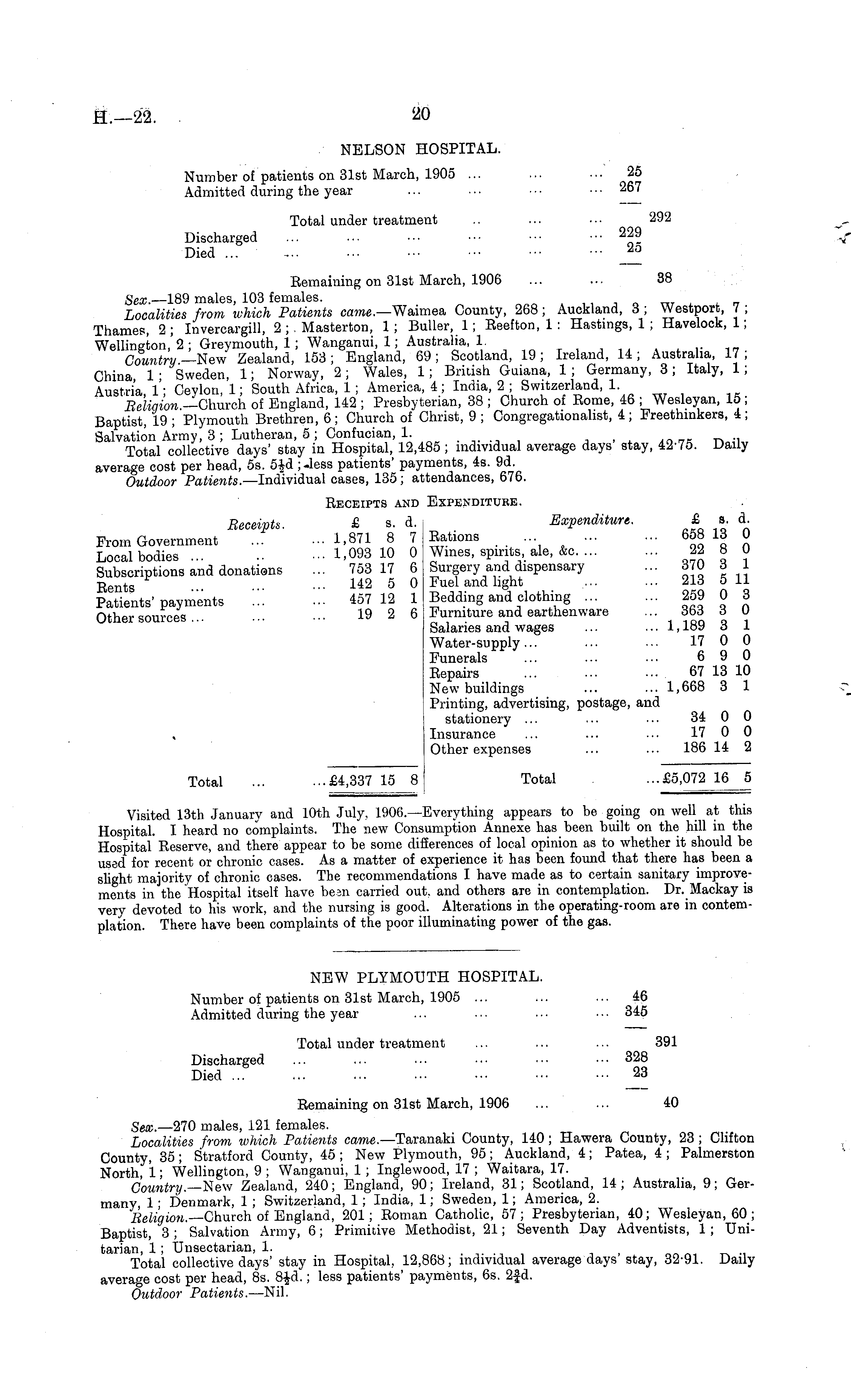 NELSON HOSPITAL. Number of patients on 31st March, 1905 ... ... ••• 25 Admitted during the year ... ... ■ • • • • ■ 267 Total under treatment .. ... • ■ • 292 Discharged ... ... ••• ••• ••• ••• 22 ? Died ... - 21 Remaining on 31st March, 1906 ... ... 38 Sex.— lB9 males, 103 females. , Localities from which Patients came.— Waimea County, 268; Auckland, 3 ; Westport, 7 ; Thames, 2; Invercargill, 2 ; Masterton, 1; Buller, 1; Reefton, 1 : Hastings, 1 ; Havelock, 1; Wellington, 2 ; Greymouth, 1; Wanganui, 1; Australia, 1 Country—New Zealand, 153; England, 69; Scotland, 19; Ireland, 14; Australia, 17, China 1 ■ Sweden, 1; Norway, 2; Wales, 1; British Guiana, 1 ; Germany, 3 ; Italy, 1; Austria, 1; Ceylon, 1; South Africa, 1; America, 4; India, 2 ; Switzerland, 1. Religion.— Church of England, 142 ; Presbyterian, 38 ; Church of Rome, 46 ;, Wesleyan, 15 ; Baptist, 19 ; Plymouth Brethren, 6 ; Church of Christ, 9 ; Congregationalist, 4 ; Freethinkers, 4 ; Salvation Army, 3; Lutheran, 5; Confucian, 1. ~.,,. , , , ,„ „- t-> -i Total collective days' stay in Hospital, 12,485 ; individual average days stay, 42-75. Daily average cost per head, ss. s£d ;-less patients' payments, 4s. 9d. Outdoor Patients. —Individual cases, 135; attendances, 676. Receipts and Expenditure. Receipts. £ s. d. Expenditure. £ s. d. From Government ... ...1,871 8 7 Rations ... 658 13 0 Local bodies .. ...1,093 10 0 Wines, spirits, ale, &c. ... ... 22 8 0 Subscriptions and donations ... 753 17 6 Surgery and dispensary ... 370 3 1 Bents ... 142 5 0 Fuel and light ... ... 213 511 Patients'payments 457 12 1 Bedding and clothing 259 0 3 Other sources 19 2 6 Furniture and earthenware -363 3 0 Salaries and wages ... ... 1, l»y 6 l Water-supply... ... ... 17 0 0 Funerals ... ... ■■• 690 Repairs 67 13 10 New buildings ... ... 1,668 3 1 Printing, advertising, postage, and stationery ... ... ... 34 0 0 Insurance ... ... ... 17 0 0 Other expenses ... ... 186 14 2 Total £4,337 15 8 Total ... £5,072 16 5 Visited 13th January and 10th July, 1906.—Everything appears to be going on well at this Hospital. I heard no complaints. The new Consumption Annexe has been built on the hill in the Hospital Reserve, and there appear to be some differences of local opinion as to whether it should be used for recent or chronic cases. As a matter of experience it has been found that there has been a slight majority of chronic cases. The recommendations I have made as to certain sanitary improvements in the Hospital itself have hem carried out, and others are in contemplation. Dr. Mackay is very devoted to his work, and the nursing is good. Alterations in the operating-room are in contemplation. There have been complaints of the poor illuminating power of the gas. NEW PLYMOUTH HOSPITAL. Number of patients on 31st March, 1905 ... ... ... 46 Admitted during the year ... ... ... ■ • • 345 Total under treatment ... ... ... 391 Discharged ... ... ... ••• ••• ••• 328 Died ... ... ... ... ••• ••• ■•• 23 Remaining on 31st March, 1906 ... ... 40 Sex. —270 males, 121 females. Localities from which Patients came.— Taranaki County, 140; Hawera County, 23 ; Clifton County, 35; Stratford County, 45 ; New Plymouth, 95; Auckland, 4; Patea, 4 ; Palmerston North, 1; Wellington, 9 ; Wanganui, 1; Inglewood, 17 ; Waitara, 17. Country .—New Zealand, 240; England, 90; Ireland, 31; Scotland, 14 ; Australia, 9 ; Germany, 1 ; Denmark, 1 ; Switzerland, 1 ; India, 1; Sweden, 1; America, 2. 'Religion.— Church of England, 201; Roman Catholic, 57; Presbyterian, 40; Wesleyan, 60 ; Baptist, 3; Salvation Army, 6; Primitive Methodist, 21; Seventh Day Adventists, 1 ; Unitarian, 1; Unsectarian, 1. Total collective days' stay in Hospital, 12,868; individual average days' stay, 32-91. Daily average cost per head, Bs. B£d.; less patients' payments, 6s. 2fd. Outdoor Patients. —Nil.