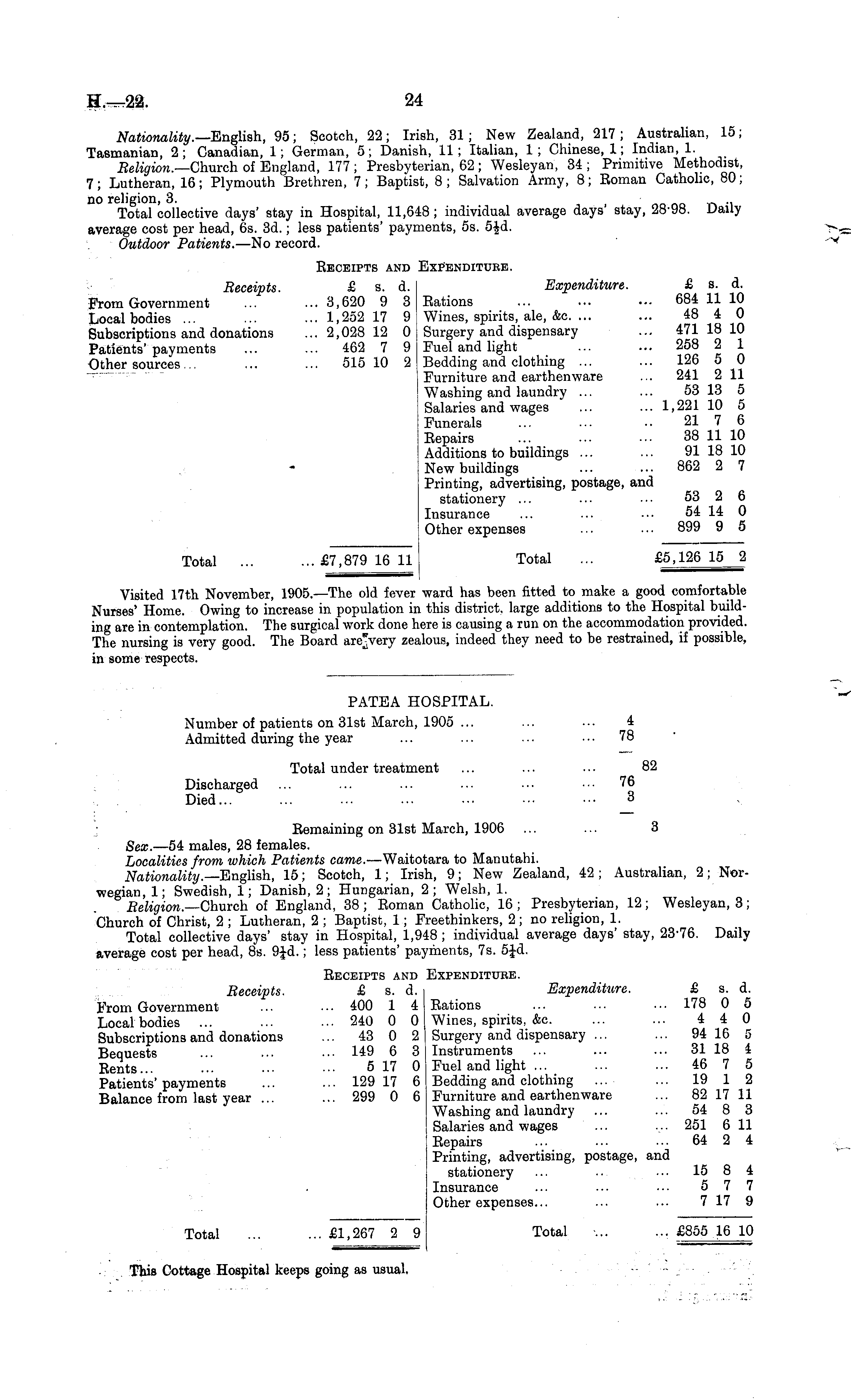 Nationality.— English, 95; Scotch, 22; Irish, 31; New Zealand, 217; Australian, 15; Tasmanian, 2; Canadian, 1; German, 5; Danish, 11; Italian, 1; Chinese, 1; Indian, 1. Religion.— Church of England, 177 ; Presbyterian, 62 ; Wesleyan, 34 ; Primitive Methodist, 7; Lutheran, 16; Plymouth Brethren, 7; Baptist, 8; Salvation Army, 8; Roman Catholic, 80; no religion, 3. Total collective days' stay in Hospital, 11,648 ; individual average days stay, 28-98. Daily average cost per head, 6s. 3d.; less patients' payments, ss. s|d. Outdoor Patients. —No record. Receipts and Expenditure. Receipts. £ s. d. Expenditure. £ s. d. From Government ... ... 3,620 9 3 Rations ... ... ... 684 11 10 Local bodies ... ... ...1,252 17 9 Wines, spirits, ale, &c. ... ... 48 4 0 Subscriptions and donations ...2,028 12 0 Surgery and dispensary ... 47118 10 Patients'payments ... ... 462 7 9 Fuel and light ... ... 258 2 1 Other sources... ... ... 515 10 2 Bedding and clothing ... ... 126 5 0 Furniture and earthenware ... 241 211 Washing and laundry ... ... 53 13 5 Salaries and wages ... ... 1,221 10 5 Funerals ... ... .. 21 7 6 Repairs 38 11 10 Additions to buildings ... ... 91 18 10 New buildings ... ... 862 2 7 Printing, advertising, postage, and stationery ... ... ... 53 2 6 Insurance ... ... ... 54 14 0 Other expenses ... ... 899 9 5 Total ... ... £7,879 16 11 Total ... £5,126 15 2 Visited 17th November, 1905.—The old fever ward has been fitted to make a good comfortable Nurses' Home. Owing to increase in population in this district, large additions to the Hospital building are in contemplation. The surgical work done here is causing a run on the accommodation provided. The nursing is very good. The Board zealous, indeed they need to be restrained, if possible, in some respects. PATEA HOSPITAL. Number of patients on 31st March, 1905 ... ... ... 4 Admitted during the year ... ... ... ••• 78 Total under treatment ... ... ... 82 Discharged ... ... ... ... ■•• ••• 76 Died... ... ... ... ••• ••• ••• 3 Remaining on 31st March, 1906 ... ... 3 Sex. —54 males, 28 females. Localities from which Patients came.- —Waitotara to Manutahi. Nationality.— English, 15; Scotch, 1; Irish, 9; New Zealand, 42 ; Australian, 2 ; Norwegian, 1; Swedish, 1; Danish, 2; Hungarian, 2; Welsh, 1. Religion.— Church of England, 38 ; Roman Catholic, 16 ; Presbyterian, 12; Wesleyan, 3; Church of Christ, 2 ; Lutheran, 2 ; Baptist, 1; Freethinkers, 2; no religion, 1. Total collective days' stay in Hospital, 1,948 ; individual average days' stay, 23-76. Daily average cost per head, Bs. 9Jd.; less patients' payments, 7s. 5Jd. Receipts and Expenditure. Receipts. £ s. d. Expenditure. £ s. d. From Government ... ... 400 1 4 Rations ... ... ... 178 0 5 Local bodies ... ... ... 240 0 0 Wines, spirits, &c. ... ... 4 4 0 Subscriptions and donations ... 43 0 2 Surgery and dispensary ... ... 94 16 5 Bequests ... ... ... 149 6 3 Instruments ... ... ... 31 18 4 Rents... ... ••• ... 517 0 Fuel and light ... ... ... 46 7 5 Patients'payments ... ... 129 17 6 Bedding and clothing ... ... 19 1 2 Balance from last year ... ... 299 0 6 Furniture and earthenware ... 82 17 11 Washing and laundry ... ... 54 8 3 Salaries and wages ... .... 251 6 11 Repairs ... ... •■• 64 2 4 Printing, advertising, postage, and stationery ... .. ... 15 8 4 Insurance ... ... ... 577 Other expenses... ... ... 7 17 9 Total ... ... £1,267 2 9 Total £855 16 10 This Cottage Hospital keeps going as usual.