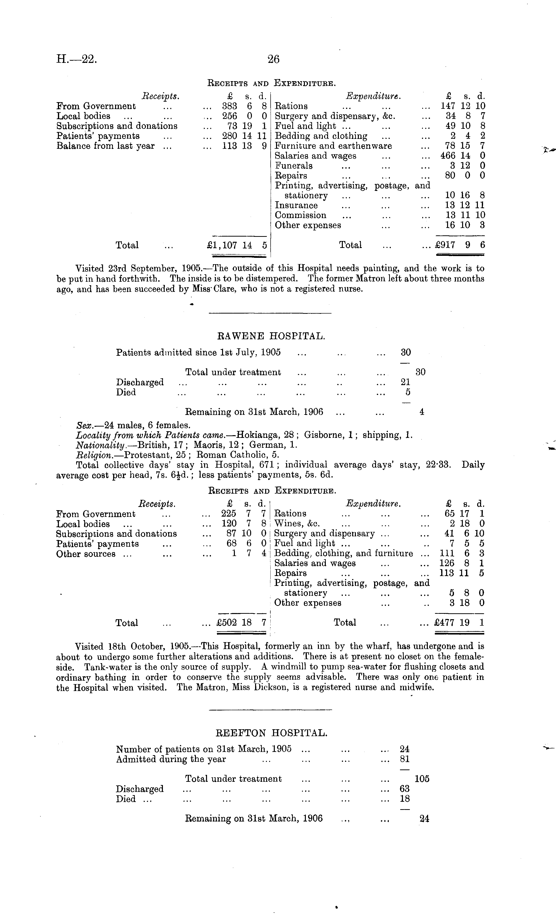 Receipts and Expenditure. Receipts. £ s. d. Expenditure. £ s. d. From Government ... ... 383 6 8 Rations ... ... ... 147 12 10 Local bodies ... ... ... 256 0 0 Surgery and dispensary, &c. ... 34 8 7 Subscriptions and donations ... 73 19 1 Fuel and light ... ... ... 49 10 8 Patients'payments ... ... 280 14 11 Bedding and clothing ... ... 2 4 2 Balance from last year ... ... 113 13 9 Furniture and earthenware ... 78 15 7 Salaries and wages ... ... 466 14 0 Funerals ... ... ... 3 12 0 Repairs ... ... ... 80 0 0 Printing, advertising, postage, and stationery ... ... ... 10 16 8 Insurance ... ... ... 13 12 11 Commission ... ... ... 13 11 10 Other expenses ... ... 16 10 3 Total ... £1,107 14 5 Total ... ...£917 9 6 Visited 23rd September, 1905. —The outside of this Hospital needs painting, and the work is to be put in hand forthwith. The inside is to be distempered. The former Matron left about three months ago, and has been succeeded by Miss Clare, who is not a registered nurse. RAWENE HOSPITAL. Patients admitted since Ist July, 1905 ... ... ... 30 Total under treatment ... ... ... 30 Discharged ... ... ... ... .. ... 21 Died ... ... ... ... ... ... 5 Remaining on 31st March, 1906 ... ... 4 Sex. —24 males, 6 females. Locality from which Patients came. —Hokianga, 28 ; Gisborne, 1; shipping, 1. Nationality. —British, 17; Maoris, 12; German, 1. Religion. —Protestant, 25 ; Roman Catholic, 5. Total collective days' stay in Hospital, 671; individual average days' stay, 22-33. Daily average cost per head, 7s. 6£d.; less patients' payments, ss. 6d. Receipts and Expenditure. Receipts. £ s. d. ] Expenditure. £ s. d. From Government ... ... 225 7 7 l Rations ... ' ... ... 65 17 1 Local bodies ... ... ... 120 7 8 Wines, &c. ... ... ... 218 0 Subscriptions and donations ... 87 10 0 Surgery and dispensary ... ... 41610 Patients' payments ... ... 68 6 0 Fuel and light ... ... .. 7 5 5 Other sources ... ... ... 1 7 4 : Bedding, clothing, and furniture ... 11l 6 3 Salaries and wages ... ... 126 8 1 Repairs ... ... ... 113 11 5 Printing, advertising, postage, and stationery ... ... ... 580 Other expenses ... .. 3 18 0 Total ... ... £502 18 7 Total ... ... £477 19 1 Visited 18th October, 1905. —This Hospital, formerly an inn by the wharf, has undergone and is about to undergo some further alterations and additions. There is at present no closet on the femaleside. Tank-water is the only source of supply. A windmill to pump sea-water for flushing closets and ordinary bathing in order to conserve the supply seems advisable. There was only one patient in the Hospital when visited. The Matron, Miss Dickson, is a registered nurse and midwife. REEFTON HOSPITAL. Number of patients on 31st March, 1905 ... ... ... 24 Admitted during the year ... ... ... ... 81 Total under treatment ... ... ... 105 Discharged ... ... ... ... ... ... 63 Died ... ... ... ... ... ... ... 18 Remaining on 31st March, 1906 ... ... 24