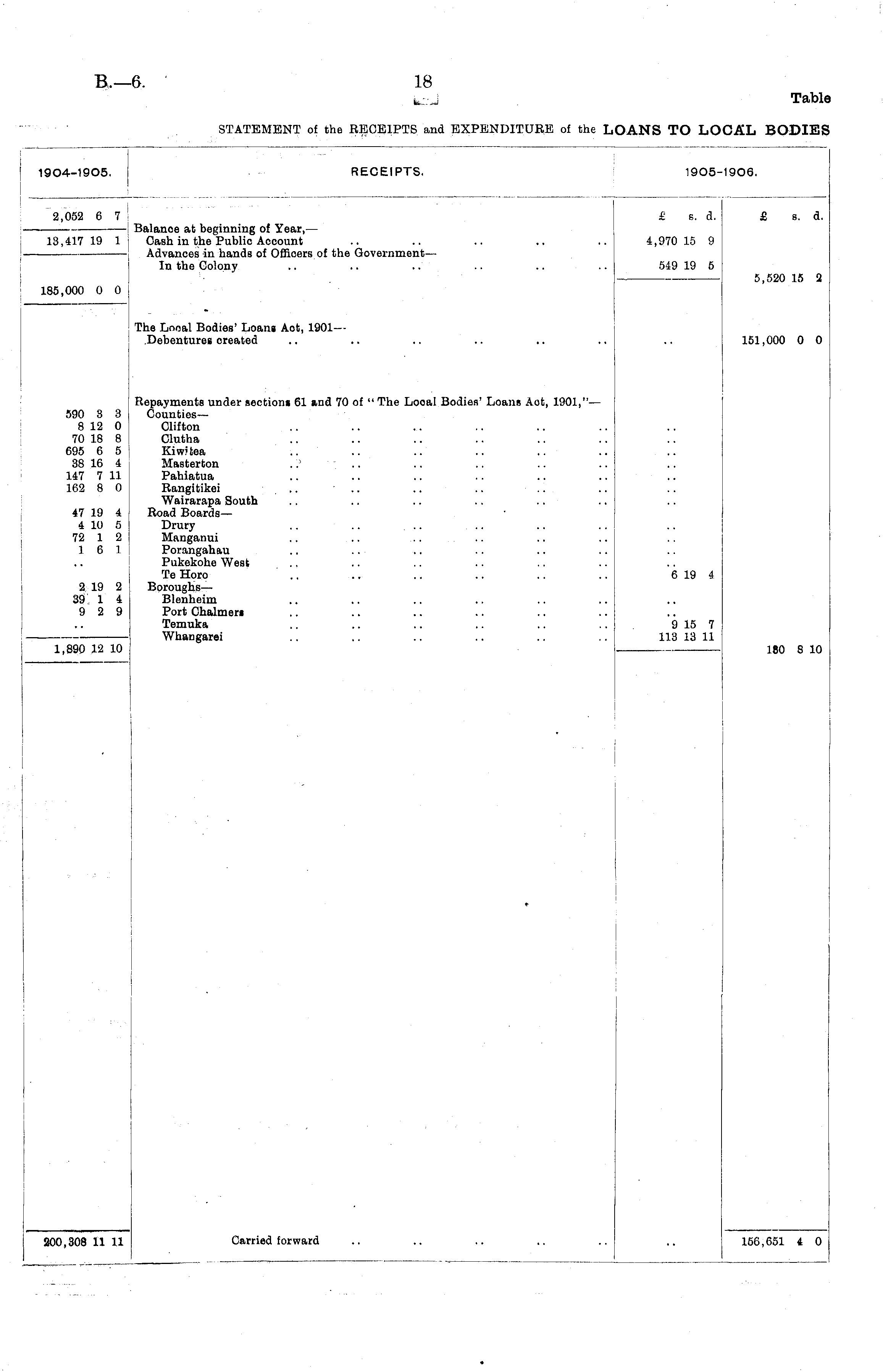 1904-1905. RECEIPTS. 1905 1906. 2,052 6 7 Balanoe at beginning of Year, — Cash in the Public Account Advances in hands of Officers of the Government— In the Colony .. .. £ s. d. £ s. d. 13,417 19 1 4,970 15 9 549 19 5 5,520 15 2 185,000 0 0 The Local Bodies' Loans Aot, 1901— Debentures oreated 151,000 0 0 590 3 3 8 12 0 70 18 8 695 6 5 38 16 4 147 7 11 162 8 0 47 19 4 4 10 5 72 1 2 1 6 1 Repayments under section* 61 and 70 of " The Looal Bodies' Loans Aot, 1901," — Counties— Clifton Clutha Kiwi tea Masterton ..' Pahiatua Rangitikei Wairarapa South .. .. .. .. Road Boards— Drury .. .. .. .. Manganui .. .. .. Porangahau Pukekohe West .. .. .. Te Horo Boroughs— Blenheim Port Chalmeri Temuka Whangarei 2 19 2 39. 1 4 9 2 9 6 19 4 9 15 7 113 13 11 1,890 12 10 180 8 10 * Carried forward 200,308 11 11 156,651 4 0