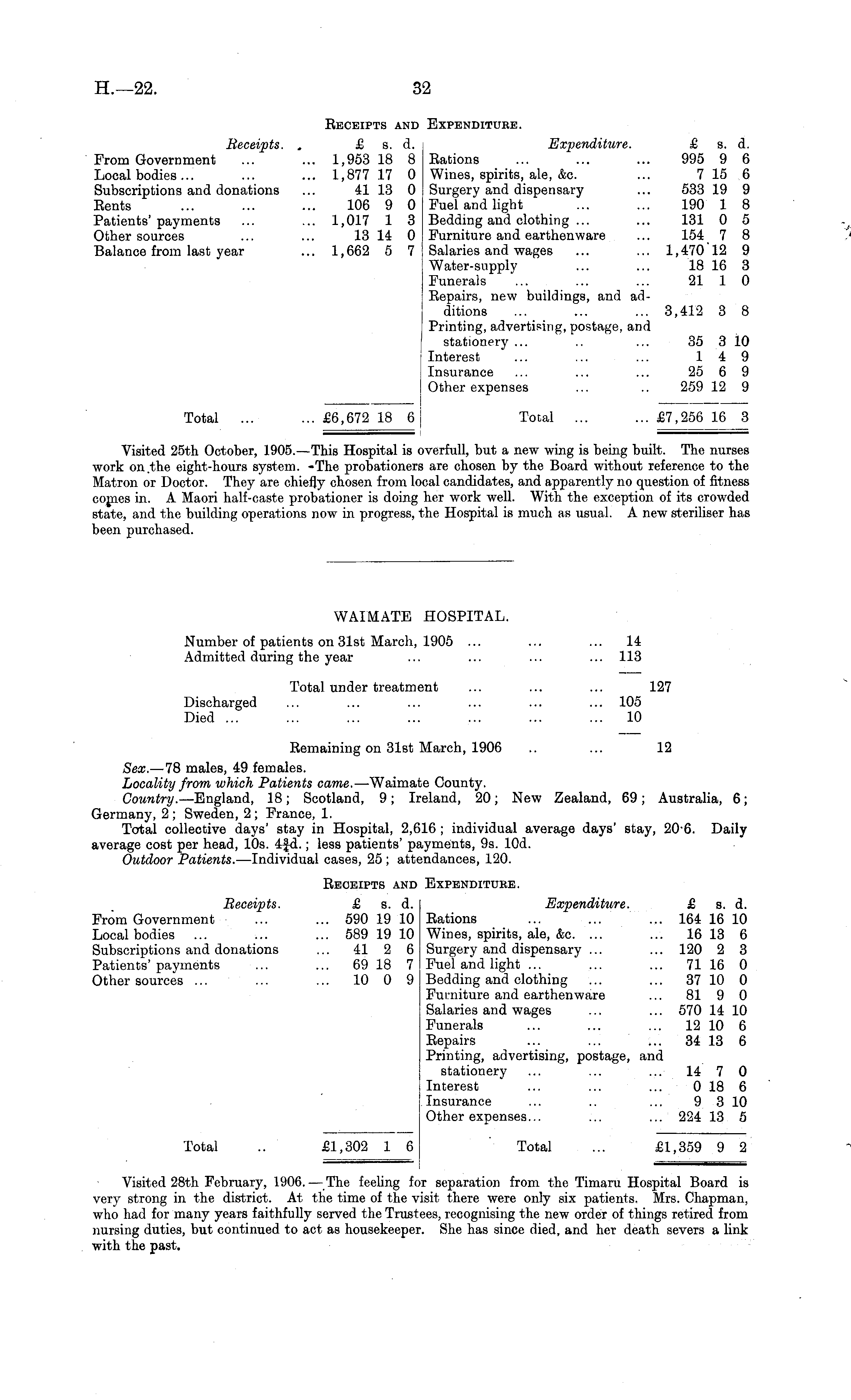 Receipts and Expenditure. Receipts. . £ s. d. Expenditure. £ s. d. From Government ... ... 1,953 18 8 Rations ... ... ... 995 9 6 Local bodies... ... ... 1,877 17 0 Wines, spirits, ale, &c. ... 7 15 6 Subscriptions and donations ... 41 13 0 Surgery and dispensary ... 533 19 9 Rents ... ... ... 106 9 0 Fuel and light ... ... 190 1 8 Patients' payments ... ... 1,017 1 3 Bedding and clothing ... ... 131 0 5 Other sources ... ... 13 14 0 Furniture and earthenware ... 154 7 8 Balance from last year ... 1,662 5 7 Salaries and wages ... ... 1,470 12 9 Water-supply ... ... 18 16 3 Funerals ... ... ... 21 1 0 Repairs, new buildings, and additions ... ... ... 3,412 3 8 Printing, advertising, postage, and stationery ... .. ... 35 3 10 Interest ... ... ... 149 Insurance ... ... ... 25 6 9 Other expenses ... .. 259 12 9 Total ... ... £6,672 18 6 Total ... ... £7,256 16 3 Visited 25th October, 1905. —This Hospital is overfull, but a new wing is being built. The nurses work on.the eight-hours system. -The probationers are chosen by the Board without reference to the Matron or Doctor. They are chiefly chosen from local candidates, and apparently no question of fitness conies in. A Maori half-caste probationer is doing her work well. With the exception of its crowded state, and the building operations now in progress, the Hospital is much as usual. A new steriliser has been purchased. WAIMATE HOSPITAL. Number of patients on 31st March, 1905 ... ... ... 14 Admitted during the year ... ... ... ... 113 Total under treatment ... ... ... 127 Discharged ... ... ... ... ... ... 105 Died ... ... ... ... ... ... ... 10 Remaining on 31st March, 1906 .. ... 12 Sex. —7B males, 49 females. Locality from which Patients came. —Waimate County. Country. —England, 18; Scotland, 9; Ireland, 20; New Zealand, 69; Australia, 6; Germany, 2; Sweden, 2; France, 1. Total collective days' stay in Hospital, 2,616 ; individual average days' stay, 206. Daily average cost per head, 10s. 4fd.; less patients' payments, 9s. lOd. Outdoor Patients. —Individual cases, 25 ; attendances, 120. Receipts and Expenditure. Receipts. £ s. d. Expenditure. £ s. d. From Government ... ... 590 19 10 Rations ... ... ... 164 16 10 Local bodies ... ... ... 589 19 10 Wines, spirits, ale, &c. ... ... 16 13 6 Subscriptions and donations ... 41 2 6 Surgery and dispensary ... ... 120 2 3 Patients'payments ... ... 69 18 7 Fuel and light ... ... ... 7116 0 Other sources ... ... ... 10 0 9 Bedding and clothing ... ... 37 10 0 Furniture and earthenware ... 81 9 0 Salaries and wages ... ... 570 14 10 Funerals ... ... ... 12 10 6 Repairs ... ... ... 34 13 6 Printing, advertising, postage, and stationery ... ... ... 14 7 0 Interest ... ... ... 0 18 6 Insurance ... .. ... 9 3 10 Other expenses... ... ... 224 13 5 Total .. £1,302 1 6 Total ... £1,359 9 2 Visited 28th February, 1906. — The feeling for separation from the Timaru Hospital Board is very strong in the district. At the time of the visit there were only six patients. Mrs. Chapman, who had for many years faithfully served the Trustees, recognising the new order of things retired from nursing duties, but continued to act as housekeeper. She has since died, and her death severs a link with the past.