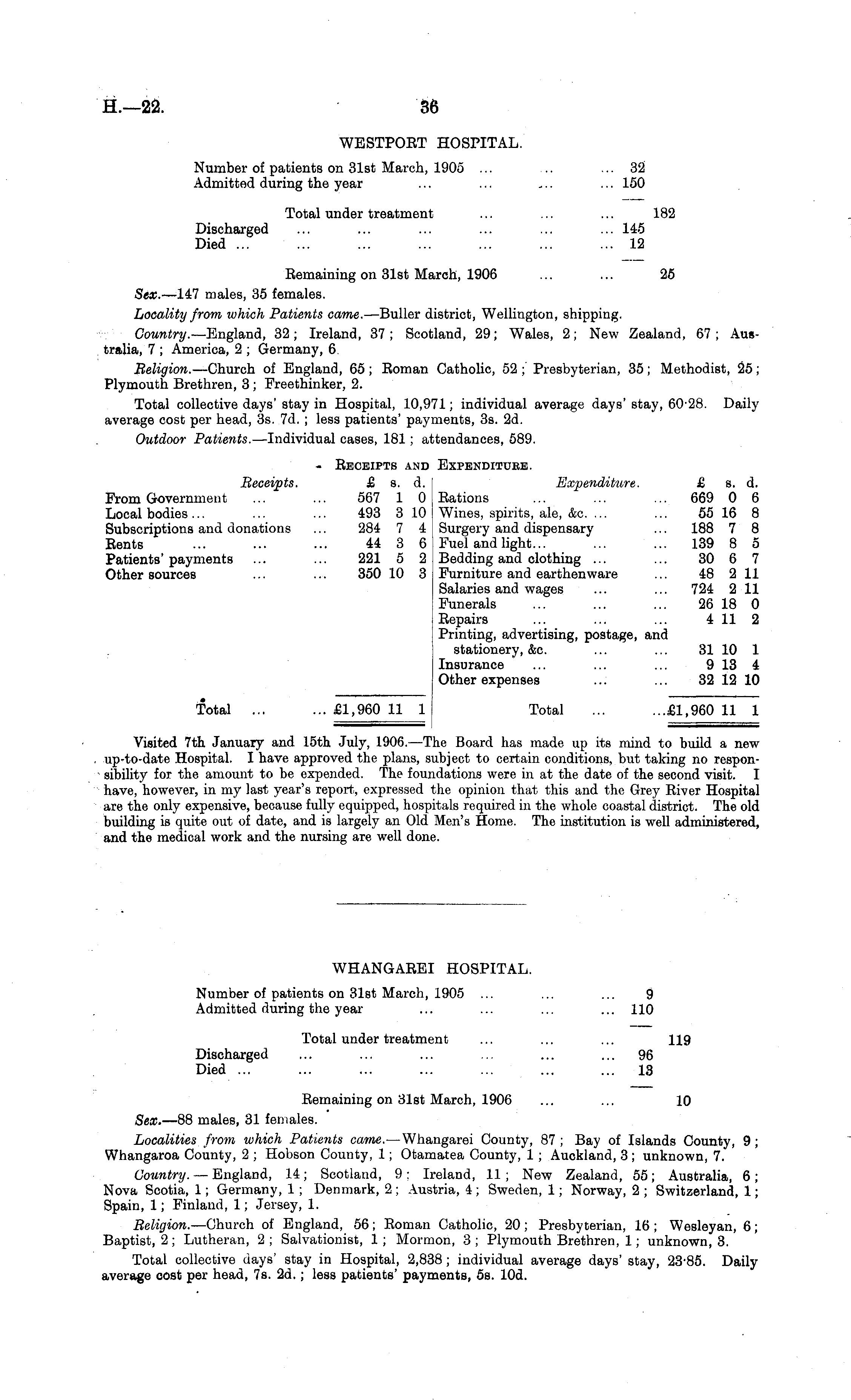 WESTPORT HOSPITAL. Number of patients on 31st March, 1905 ... ... ... 32 Admitted during the year ... ... ... ... 150 Total under treatment ... ... ... 182 Discharged ... ... ... ... ... ... 145 Died ... ... ... ... ... ... ... 12 Remaining on 31st March, 1906 ... ... 25 Sex. —l 47 males, 35 females. Locality from which Patients came. —Buller district, Wellington, shipping. Country. —England, 32; Ireland, 37; Scotland, 29; Wales, 2; New Zealand, 67; Australia, 7 ; America, 2 ; Germany, 6 Religion.— Church of England, 65 ; Roman Catholic, 52 ; Presbyterian, 35; Methodist, 25; Plymouth Brethren, 3 ; Freethinker, 2. Total collective days' stay in Hospital, 10,971; individual average days' stay, 6028. Daily average cost per head, 3s. 7d. ; less patients' payments, 3s. 2d. Outdoor Patients. —Individual cases, 181 ; attendances, 589. - Receipts and Expenditure. Receipts. £ s. d. Expenditure. £ s. d. From Government ... ... 567 1 0 Rations ... ... ... 669 0 6 Local bodies... ... ... 493 3 10 Wines, spirits, ale, &c. ... ... 55 16 8 Subscriptions and donations ... 284 7 4 Surgery and dispensary ... 188 7 8 Rents ... ... ... 44 3 6 Fuel and light... ... ... 139 8 5 Patients'payments ... ... 221 5 2 Bedding and clothing ... ... 30 6 7 Other sources ... ... 350 10 3 Furniture and earthenware ... 48 2 11 Salaries and wages ... ... 724 211 Funerals ... ... ... 26 18 0 Repairs ... ... ... 4 11 2 Printing, advertising, postage, and stationery, &c. ... ... 31 10 1 Insurance ... ... ... 9 13 4 Other expenses ... ... 32 12 10 Total ... ... £1,960 11 1 Total ... ...£1,960 11 1 Visited 7th January and 15th July, 1906. —The Board has made up its mind to build a new up-to-date Hospital. I have approved the plans, subject to certain conditions, but taking no responsibility for the amount to be expended. The foundations were in at the date of the second visit. I have, however, in my last year's report, expressed the opinion that this and the Grey River Hospital are the only expensive, because fully equipped, hospitals required in the whole coastal district. The old building is quite out of date, and is largely an Old Men's Home. The institution is well administered, and the medical work and the nursing are well done. WHANGAREI HOSPITAL. Number of patients on 31st March, 1905 ... ... ... 9 Admitted during the year ... ... ... ... 110 Total under treatment ... ... ... 119 Discharged ... ... ... ... ... ... 96 Died ... ... ... ... ... ... ... 13 Remaining on 31st March, 1906 ... ... 10 Sex. —88 males, 31 females. Localities from which Patients came. —Whangarei County, 87; Bay of Islands County, 9; Whangaroa County, 2 ; Hobson County, 1 ; Otamatea County, 1 ; Auckland, 3; unknown, 7. Country. — England, 14; Scotland, 9; Ireland, 11 ; New Zealand, 55; Australia, 6; Nova Scotia, 1; Germany, 1; Denmark, 2 ; Austria, 4; Sweden, 1; Norway, 2 ; Switzerland, 1; Spain, 1; Finland, 1; Jersey, 1. Religion. —Church of England, 56 ; Roman Catholic, 20 ; Presbyterian, 16 ; Wesleyan, 6; Baptist, 2 ; Lutheran, 2; Salvationist, 1; Mormon, 3; Plymouth Brethren, 1; unknown, 3. Total collective days' stay in Hospital, 2,838 ; individual average days' stay, 23-85. Daily average cost per head, 7s. 2d.; less patients' payments, ss. lOd.