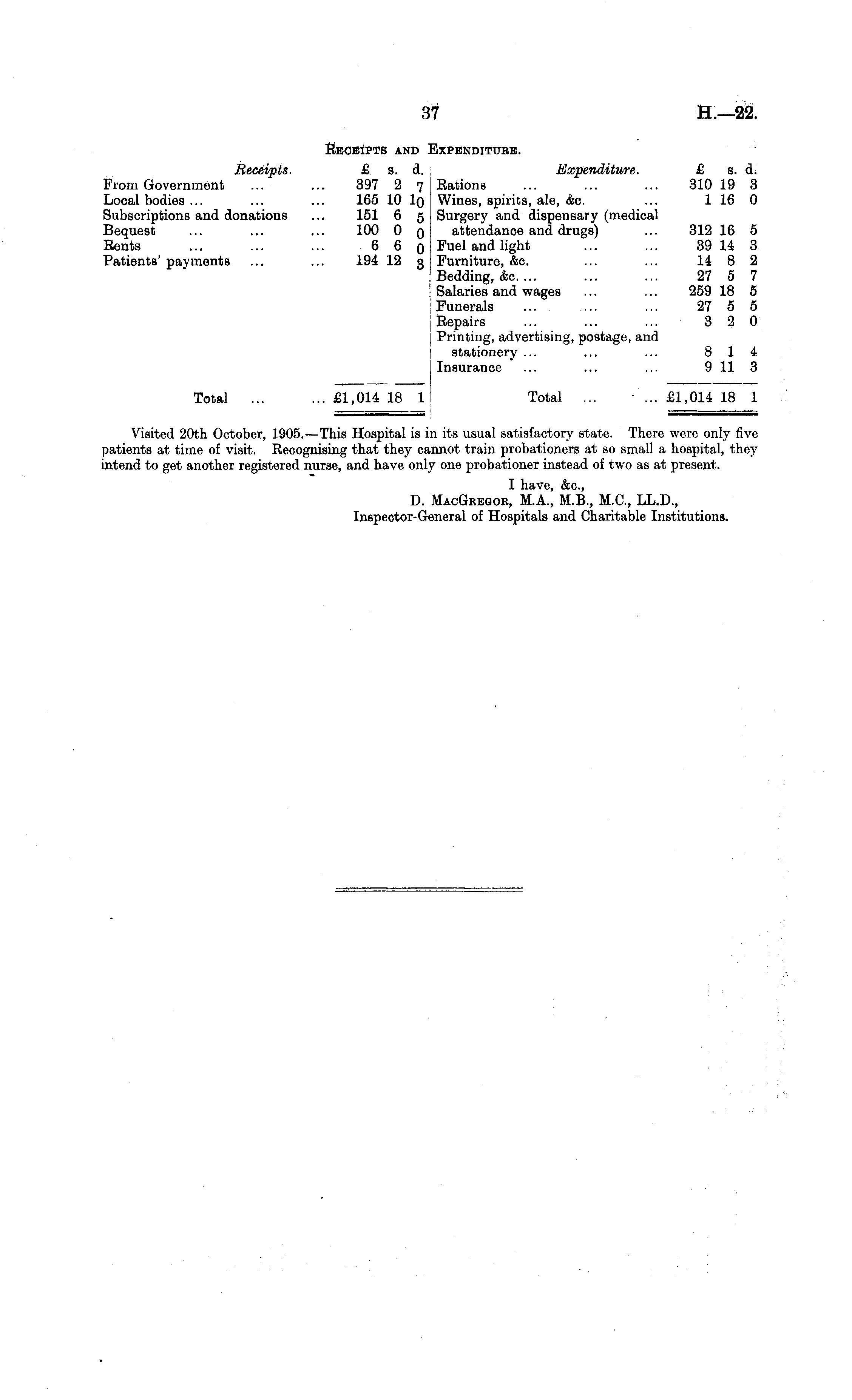 Receipts and Expenditure. Receipts. £ s. d. Expenditure. £ s. d. From Government ... ... 397 2 7 Rations ... ... ... 310 19 3 Local bodies ... ... ... 165 10 1() Wines, spirits, ale, &c. ... 1 16 0 Subscriptions and donations ... 151 6 5 Surgery and dispensary (medical Bequest ... ... ... 100 0 q attendance and drugs) ... 312 16 5 Rents ... ... ... 6 6q Fuel and light ... ... 3914 3 Patients' payments ... ... 194 12 3 Furniture, &c. ... ... 14 8 2 Bedding, &c.... ... ... 27 5 7 Salaries and wages ... ... 259 18 5 Funerals ... ... ... 27 5 5 Repairs ... ... ... 320 Printing, advertising, postage, and stationery ... ... ... 814 Insurance ... ... ... 9 11 3 Total ... ...£1,014 18 1 Total ... -...£1,014 18 1 Visited 20th October, 1905.—This Hospital is in its usual satisfactory state. There were only five patients at time of visit. Recognising that they cannot train probationers at so small a hospital, they intend to get another registered nurse, and have only one probationer instead of two as at present. I n Hi Vf * cvo D. MacGregor, M.A.', M.8., M.C., LL.D., Inspector-General of Hospitals and Charitable Institutions.
