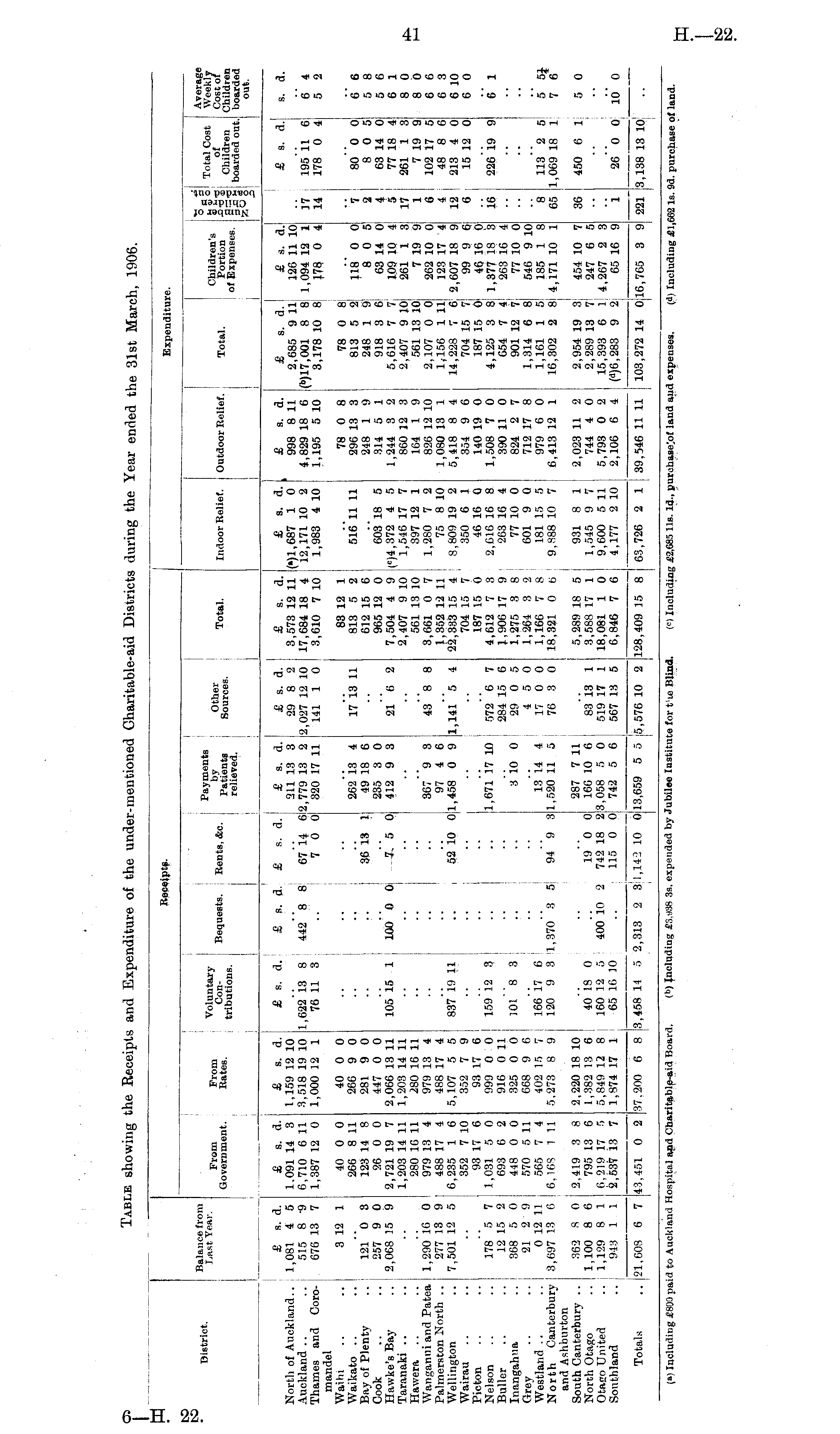 Heceipts. Expenditure. District. Balance from Last Year. From Government. From Kates. | Voluntary ' ! Payments Con- j Bequests. Rents, &c. p , (i L„ tributi ° ns - i Sieved 3 ; i . Other Sources. Total. Indoor Relief. Outdoor Relief. Total. o _, o I Average Children's g §o Total Cost Weekly »„.,;„„ E&V, 0t Cost Of ofExuenLs 'B%% Children Children or expenses, . s boarded out. boarded fcO§ out. £ s. d. North of Auckland.. 1,081 4 5 Auckland .. .. 515 8 '9 Thames and Coro- 676 13 7 mandel Waihi .. .. 3 12 1 Waikato Bay of Plentv .. 121 0 3 Cook .. .. 257 9 0 Hawke's Bay .. 2,068 IS 9 Taranaki Hawera Wanganui and Patea 1,290 16 0 Palmerston North .. 277 13 9 Wellington .. 7,501 12 5 Wairau Picton Nelson .. .. 178 5 7 Buller .. .. 12 15 2 | Inangahua .. 368 5 0 Grey .. .. 21 2 9 ! Westland .. .. 0 12 11 | North Canterbury 3,697 13 6 and Ashbuvton South Canterburv .. 362 8 0 North Otago .. 1,100 8 6 Otago United .. j 1,129 8 1 Southland .. 943 1 1 Totals .. 21.608 6 7 £ s. d. 1.091 14 3 6,710 6 11 1,387 12 0 £ s. d. 1,159 12 10 3,518 19 10 1,000 12 1 £ s. d. £ s. d. £ s. d. 1,622 13 8 442 8 8 6714 6!: 76 11 3 .. 7 0 Ol £ s. d. £ s. d. 211 13 3 29 8 2 2,779 13 2 2,027 12 10 320 17 11 141 1 0 £ s. d. 3,573 12 11 ( 17,684 18 4 3,610 7 10 £ s. d. (*)1,687 1 0 12,171 10 2 1,983 4 10 £ s. d. 998 8 11 4,829 18 6 1,195 5 10 £ s. d. £ s. d. 2,685 9 11 126 11 10 ( b )17,001 8 8 1,094 12 1 3,178 10 8 178 0 4 17 14 £ s. d.| s. d. 195 11 6 6 4 178 0 4 5 2 40 0 0 266 8 11 123 14 8 26 0 0 2,721 19 7 1,203 14 11 280 16 11 979 13 4 488 17 4 6,235 1 6 352 7 10 93 17 6 1,031 5 0 693 6 2 448 0 0 570 5 11 565 7 4 6.16S 1 11 40 0 0 266 9 0 281 9 0 447 0 0 2,066 13 11 1,203 14 11 280 16 11 979 13 4 488 17 4 5,107 5 5 352 7 9 93 17 6 999 0 0 916 0 11 325 0 0 668 9 6 402 15 7 5.273 8 9 36 13 1 105 15 1 100"0 0 7,5 0 837 19 11 .. i 52 10 0 15912 3 '.'. 101 8 3 '.'. '.'. 262 13 4 17 13 11 49 18 6 235 3 0 412 9 3 21 6 2 .. 367 9 3 43 8 8 97 4 6 1,458 0 9 1,141 5 4 83 12 1 813 5 2 612 15 6 965 12 0 7,504 4 9 | 2,407 9 10 561 13 10 3,661 0 7 1,352 12 11 22,333 15 4 704 15 7 187 15 0 4,612 7 3 1,906 17 9 1,275 3 8 1,264 3 2 1,166 7 8 18,321 0 6 51611 11 603 18 5 (0)4,372 4 5 1,546 17 7 397 12 1 1,280 7 2 75 8 10 8,809 19 2 350 6 1 46 16 0 2,616 16 8 263 16 4 77 10 0 601 9 0 181 15 5 9,888 10 7 i 78 0 8 296 13 3 248 1 9 314 5 1 1,244 3 2 860 12 3 164 1 9 826 12 10 1,080 13 1 5,418 8 4 354 9 6 140 19 0 1,508 7 0 390 11 0 824 2 7 712 17 8 979 6 0 6,413 12 1 78 0 8 813 5 2 118 0 0 248 1 9 8 0 5 918 3 6 63 14 0 5,616 7 7 109 10 4 2,407 9 10 261 1 3 561 13 10 7 19 9 2,107 0 0 262 10 0 1,156 1 11 123 17 4 14,228 7 6 2,607 18 9 704 15 7 99 9 6 187 15 0 46 16 0 4,125 3 8 1,377 18 3 654 7 4 ! 263 16 4 901 12 7' 77 10 0 1,314 6 8| 546 9 10 1,161 1 5l 185 1 8 16,302 2 8 4,171 10 1 2,954 19 3 454 10 7 2,289 13 7 247 6 5 15,393 6 1 4,267 2 3 ( d )6,283 9 2. 65 16 9 7 2 4 5 17 1 6 4 12 80 0 0 6 6 8 0 5 5 8 63 14 0 5 6 77 18 4 6 1 261 1 3 8 0 7 19 9 8 0 102 17 5 6 6 48 8 6 6 3 213 4 0 6 10 15 12 0 6 0 I 1,671 17 10 572 6 7 284 15 6 3 10 0 29 0 5 4 5 0 13 14 4 17 0 0 1,520 11 5 76 3 0 16 226 19 9 6 1 .. I 166 17 6 i 120 9 3 1,370 3 5 94 9 8 8 65 113 2 5! 5 5J 1,069 18 1 7 6 2.419 8 S 795 13 6 6.219 17 S 2,537 13 7 2,220 18 10 1,382 13 6 5,849 12 8 1,874 17 1 40 18 0 .. 19 0 0 ; 160 12 5 400 10 2 742 18 2 65 16 10 .. 115 0 0 287 7 11 166 10 6 83 13 1 3,058 5 0 , 519 17 1 742 5 6 567 18 5 5,289 18 5 3,588 17 1 18,081 1 0 6,846 7 6 931 8 1 1,545 9 7 9,600 5 11 4,177 2 10 2,023 11 2 744 4 0 5,793 0 2 2,106 6 4 36 450 6 1 5 0 .. i .. 221 26 0 0 10 0 3,138 13 10 43,451 0 2 37.200 6 8 3,458 14 5 2,313 2 81,142 10 0 13,659 5 5 5,576 10 2 128,409 15 8 63,726 2 1 39,546 11 11 103,272 14 0! 16,765 3 9| I i i (») Including £800 paid to Auckland Hospital and Charitable-aid Board. (t>) Including £3.vJ38 3s. expended by Jubilee Institute for t'te Blind. (<=) Including £2,685 lis. Id., land and expenses. (<i) Including £1,662 Is. 9d. purchase of land.