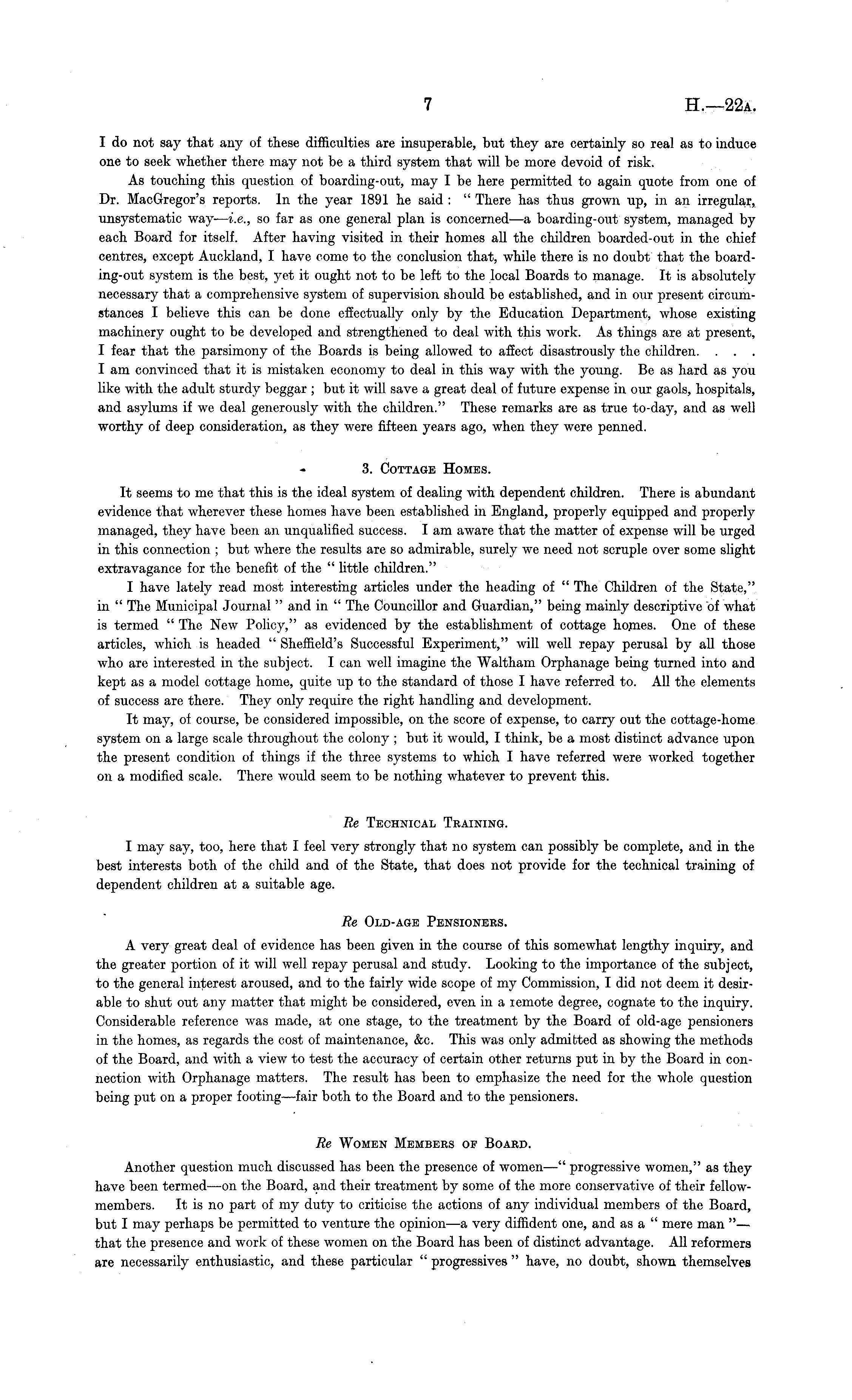 I do not say that any of these difficulties are insuperable, but they are certainly so real as to induce one to seek whether there may not be a third system that will be more devoid of risk. As touching this question of boarding-out, may I be here permitted to again quote from one of Dr. MacGregor's reports. In the year 1891 he said : " There has thus grown up, in an irregular, unsystematic way- — i.e., so far as one general plan is concerned —a boarding-out system, managed by each Board for itself. After having visited in their homes all the children boarded-out in the chief centres, except Auckland, I have come to the conclusion that, while there is no doubt that the board-ing-out system is the best, yet it ought not to be left to the local Boards to manage. It is absolutely necessary that a comprehensive system of supervision should be established, and in our present circumstances I believe this can be done effectually only by the Education Department, whose existing machinery ought to be developed and strengthened to deal with this work. As things are at present, I fear that the parsimony of the Boards is being allowed to affect disastrously the children. . . . lam convinced that it is mistaken economy to deal in this way with the young. Be as hard as you like with the adult sturdy beggar ; but it will save a great deal of future expense in our gaols, hospitals, and asylums if we deal generously with the children." These remarks are as true to-day, and as well worthy of deep consideration, as they were fifteen years ago, when they were penned. 3. Cottage Homes. It seems to me that this is the ideal system of dealing with dependent children. There is abundant evidence that wherever these homes have been established in England, properly equipped and properly managed, they have been an unqualified success. lam aware that the matter of expense will be urged in this connection ; but where the results are so admirable, surely we need not scruple over some slight extravagance for the benefit of the " little children." I have lately read most interesting articles under the heading of " The Children of the State," in " The Municipal Journal " and in " The Councillor and Guardian," being mainly descriptive of what is termed " The New Policy," as evidenced by the establishment of cottage homes. One of these articles, which is headed " Sheffield's Successful Experiment," will well repay perusal by all those who are interested in the subject. I can well imagine the W'altham Orphanage being turned into and kept as a model cottage home, quite up to the standard of those I have referred to. All the elements of success are there. They only require the right handling and development. It may, of course, be considered impossible, on the score of expense, to carry out the cottage-home system on a large scale throughout the colony ; but it would, I think, be a most distinct advance upon the present condition of things if the three systems to which I have referred were worked together on a modified scale. There would seem to be nothing whatever to prevent this. Re Technical Training. I may say, too, here that I feel very strongly that no system can possibly be complete, and in the best interests both of the child and of the State, that does not provide for the technical training of dependent children at a suitable age. Re Old-age Pensioners. A very great deal of evidence has been given in the course of this somewhat lengthy inquiry, and the greater portion of it will well repay perusal and study. Looking to the importance of the subject, to the general interest aroused, and to the fairly wide scope of my Commission, I did not deem it desirable to shut out any matter that might be considered, even in a remote degree, cognate to the inquiry. Considerable reference was made, at one stage, to the treatment by the Board of old-age pensioners in the homes, as regards the cost of maintenance, &c. This was only admitted as showing the methods of the Board, and with a view to test the accuracy of certain other returns put in by the Board in connection with Orphanage matters. The result has been to emphasize the need for the whole question being put on a proper footing—fair both to the Board and to the pensioners. Re Women Members of Board. Another question much discussed has been the presence of women —" progressive women," as they have been termed —on the Board, and their treatment by some of the more conservative of their fellowmembers. It is no part of my duty to criticise the actions of any individual members of the Board, but I may perhaps be permitted to venture the opinion—a very diffident one, and as a " mere man " — that the presence and work of these women on the Board has been of distinct advantage. All reformers are necessarily enthusiastic, and these particular " progressives " have, no doubt, shown themselves