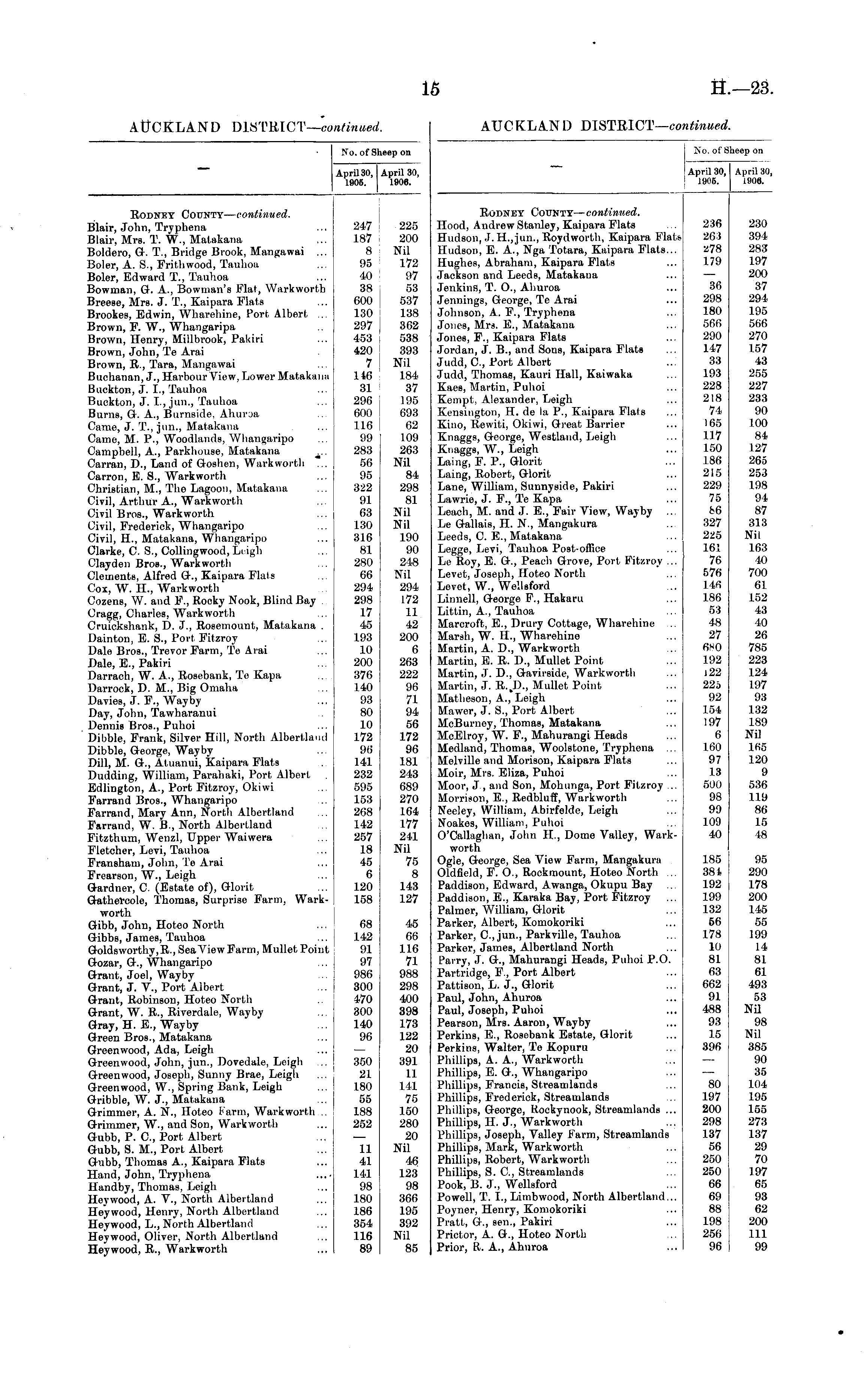 No. of Sheep on April 30, April 30, 1906. 1906. Rodney County— continued. Blair, John, Tryphena Blair, Mrs. T. W., Matakana Boldero, G. T., Bridge Brook, Mangawai ... Boler, A. S., Frithwood, Tauhoa Boler, Edward T., Tauhoa Bowman, G. A., Bowman's Flat, Warkworth Breese, Mrs. J. T., Kaipara Flats Brookes, Edwin, Wharehine, Port Albert ... Brown, F. W., Whangaripa Brown, Henry, Millbrook, Pakiri Brown, John, Te Arai Brown, R, Tara, Mangawai Buchanan, J., Harbour View, Lower Matakana Buckton, J. I., Tauhoa Buckton, J. I., jun., Tauhoa Burns, G. A., Burnside, Ahuraa Came, J. T., jun., Matakana Came, M. P., Woodlands, Whangaripo Campbell, A., Parkhouse, Matakana _... Carran, D., Land of Goshen, Warkworth ... Carron, E. S., Warkworth Christian, M., The Lagoon, Matakana Civil, Arthur A., Warkworth Civil Bros., Warkworth Civil, Frederick, Whangaripo Civil, H., Matakana, Whangaripo Clarke, C. S., Collingwood, Leigh Clayden Bros., Warkworth Clements, Alfred G., Kaipara Flats Cox, W. H., Warkworth Cozens, W. and F., Rocky Nook, Blind Bay . Cragg, Charles, Warkworth Cruiekshank, D. J., Rosemount, Matakana . Dainton, E. S., Port, Filzroy Dale Bros., Trevor Farm, Te Arai Dale, E., Pakiri Darrach, W. A., Rosebank, Te Kapa Darrock, D. M., Big Omaha Davies, J. F., Way by Day, John, Tawharanui Dennis Bros., Puhoi Dibble, Frank, Silver Hill, North Albertland Dibble, George, Way by Dill, M. G., Atuanui, Kaipara Flats Dudding, William, Parahaki, Port Albert Edlington, A., Port Fitzroy, Okiwi Farrand Bros., Whangaripo Farrand, Mary Ann, North Albertland Farrand, W. B., North Albertland Fitzthum, Wenzl, Upper Waiwera Fletcher, Levi, Tauhoa Fransham, John, Te Arai Frearson, W., Leigh Gardner, C. (Estate of), Glorit Gathercole, Thomas, Surprise Farm, Warkworth Gibb, John, Hoteo North Gibbs, James, Tauhoa Goldsworthy.R., SeaViewFarm, Mullet Point Gozar, G., Whangaripo Grant, Joel, Way by Grant, J. V., Port Albert Grant, Robinson, Hoteo North Grant, W. R., Riverdale, Wayby Gray, H. E., Way by Green Bros., Matakana Greenwood, Ada, Leigh Greenwood, John, jun., Dovedale, Leigh Greenwood, Joseph, Sunny Brae, Leigh Greenwood, W., Spring Bank, Leigh Gribble, W. J., Matakana Grimmer, A. N., Hoteo Farm, Warkworth .. Grimmer, W., and Son, Warkworth Gubb, P. C, Port Albert Gubb, S. M., Port Albert Gubb, Thomas A., Kaipara Flats Hand, John, Tryphena Handby, Thomas, Leigh Hey wood, A. V., North Albertland Hey wood, Henry, North Albertland Hey wood, L., North Albertland Hey wood, Oliver, North Albertland Hey wood, R., Warkworth 247 187 8 95 40 38 600 130 297 453 420 7 116 31 296 600 116 99 283 56 95 322 91 63 130 316 81 280 66 294 298 17 45 193 10 200 376 140 93 80 10 172 96 141 232 595 153 268 142 257 18 45 6 120 158 225 200 Nil 172 97 53 537 138 362 538 393 Nil 184 37 195 693 62 109 263 Nil 84 298 81 Nil Nil 190 90 248 Nil 294 172 11 42 200 6 263 222 96 71 94 56 172 96 181 243 689 270 164 177 211 Nil 75 8 143 127 68 142 91 97 986 300 470 300 140 96 350 21 180 55 188 252 45 66 116 71 988 298 400 398 173 122 20 391 11 141 75 150 280 20 Nil 46 123 98 366 195 392 Nil 85 11 41 141 98 180 186 354 116 89