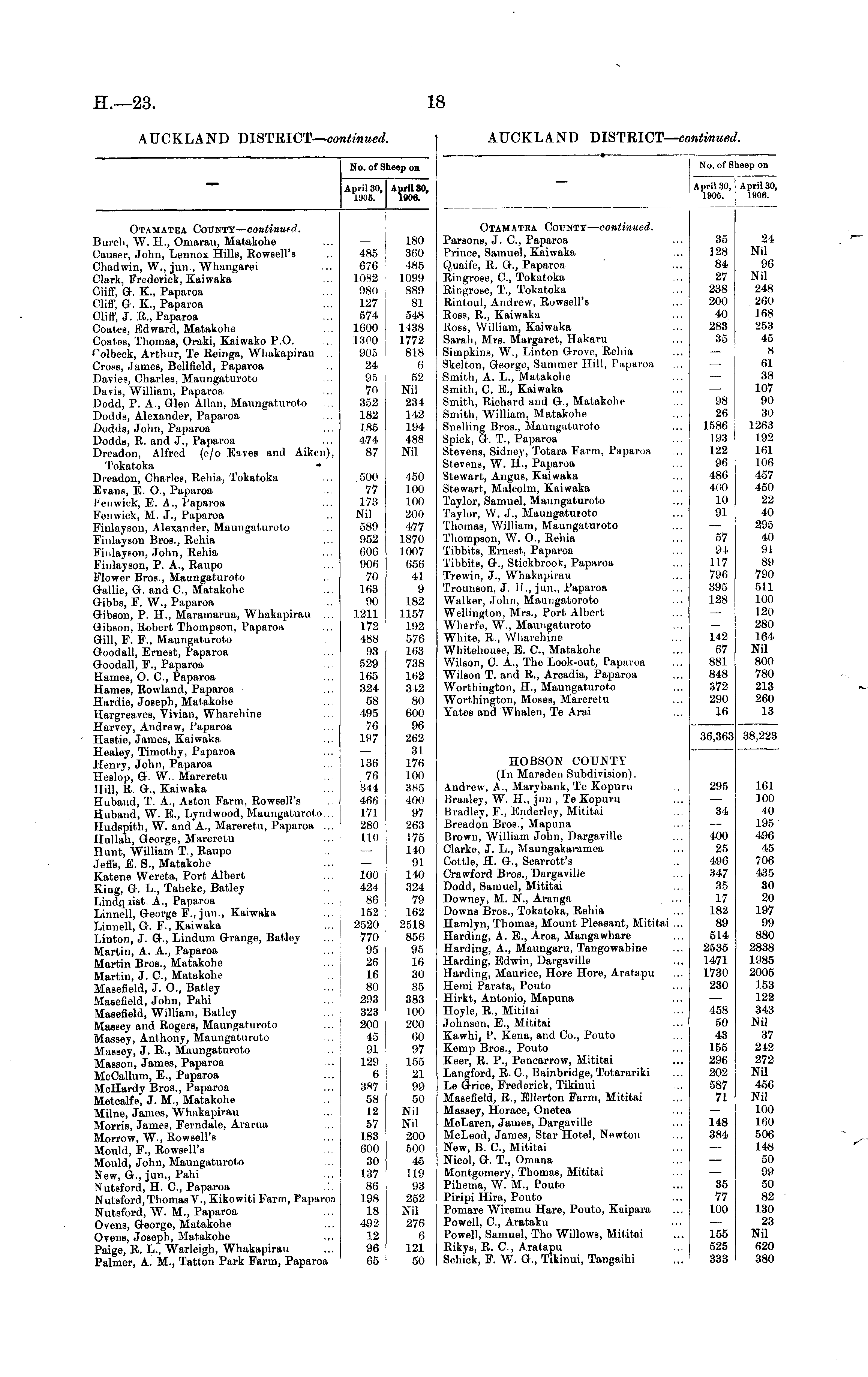 No. of Sheep on April 30, 1906. April 30, 1906. Otamatea County— continued. Parsons, J. C, Paparoa Prince, Samuel, Kaiwaka Q.uaife, R. G., Paparoa Ringrose, C, Tokatoka Ringrose, T., Tokatoka Rintoul, Andrew, Rowsell's Ross, R., Kaiwaka Ross, William, Kaiwaka Sarah, Mrs. Margaret, Hakaru Simpkins, W., Linton Grove, Rehia Skelton, George, Summer Hill, Paparoa Smith, A. L., Matakohe Smith, C. E., Kaiwaka Smith, Richard and G., Matakohe Smith, William, Matakohe Snelling Bros., Maungaturoto Spick, G. T., Paparoa Stevens, Sidney, Totara Farm, Paparoa Stevens, W. H, Paparoa Stewart, Angus, Kaiwaka Stewart, Malcolm, Kaiwaka Taylor, Samuel, Maungaturoto Taylor, W. J., Maungaturoto Thomas, William, Maungaturoto Thompson, W. O., Rehia Tibbits, Ernest, Paparoa Tibbits, G., Stickbrook, Paparoa Trewin, J., Whakapirau Trounson, J. II., jun., Paparoa Walker, John, Maungatoroto Wellington, Mrs., Port Albert Wlisrfe, W., Maungaturoto White, R , Wharehine Whitehouse, E. C, Matakohe Wilson, C. A., The Look-out, Paparoa Wilson T. and R., Arcadia, Paparoa Worthington, H., Maungaturoto Worthington, Moses, Mareretu Yates and Whalen, Te Arai 35 128 84 27 238 200 40 283 35 98 26 1586 193 122 96 486 410 10 91 24 Nil 96 Nil 248 260 168 253 45 8 61 38 107 90 30 1263 192 161 106 457 450 22 40 295 40 91 89 790 511 100 120 280 164 Nil 800 780 213 260 13 57 91 117 796 395 128 142 67 881 848 372 290 16 36,363 38,223 HOBSON COUNTY (In Marsden Subdivision). Andrew, A., Marybank, Te Kopuru Braaley, W. H., jun , Te Kopuru Bradley, F., Enderley, Mititai Breadon Bros., Mapuna Brown, William John, Dargaville Clarke, J. L., Maungakaramea Cottle, H. &., Scarrott's Crawford Bros., Dargaville Dodd, Samuel, Mititai Downey, M. N., Aranga Downs Bros., Tokatoka, Rehia Hamlyn, Thomas, Mount Pleasant, Mititai ... Harding, A. E., Aroa, Mangawhare Harding, A., Maungaru, Tangowahine Harding, FMwin, Dargaville Harding, Maurice, Hore Hore, Aratapu Hemi Parata, Pouto Hirkt, Antonio, Mapuna Hoyle, R., Mititai Johnsen, E., Mititai Kawhi, P. Kena, and Co., Pouto Kemp Bros., Pouto Keer, R. P., Pencarrow, Mititai ... Langford, R. C, Bainbridge, Totarariki Le Grice, Frederick, Tikinui Masefield, R., Ellerton Farm, Mititai Massey, Horace, Onetea McLaren, James, Dargaville McLeod, James, Star Hotel, Newton New, B. O, Mititai Nicol, G. T., Omana Montgomery, Thomas, Mititai Pihetna, W. M., Pouto Piripi Hira, Pouto Pomare Wiremu Hare, Pouto, Kaipara Powell, C, Arataku Powell, Samuel, The Willows, Mititai Rikys, R. C, Aratapu Schick, F. W. G., Tikinui, Tangaihi 295 34 400 25 496 347 35 17 182 89 514 2535 1471 1730 230 161 100 40 195 496 45 706 435 30 20 197 99 880 2838 1985 2005 153 122 343 Nil 37 212 272 Nil 456 Nil 100 160 506 148 50 99 50 82 130 23 Nil 620 380 458 50 43 155 296 202 587 71 148 384 35 77 100 155 525 333