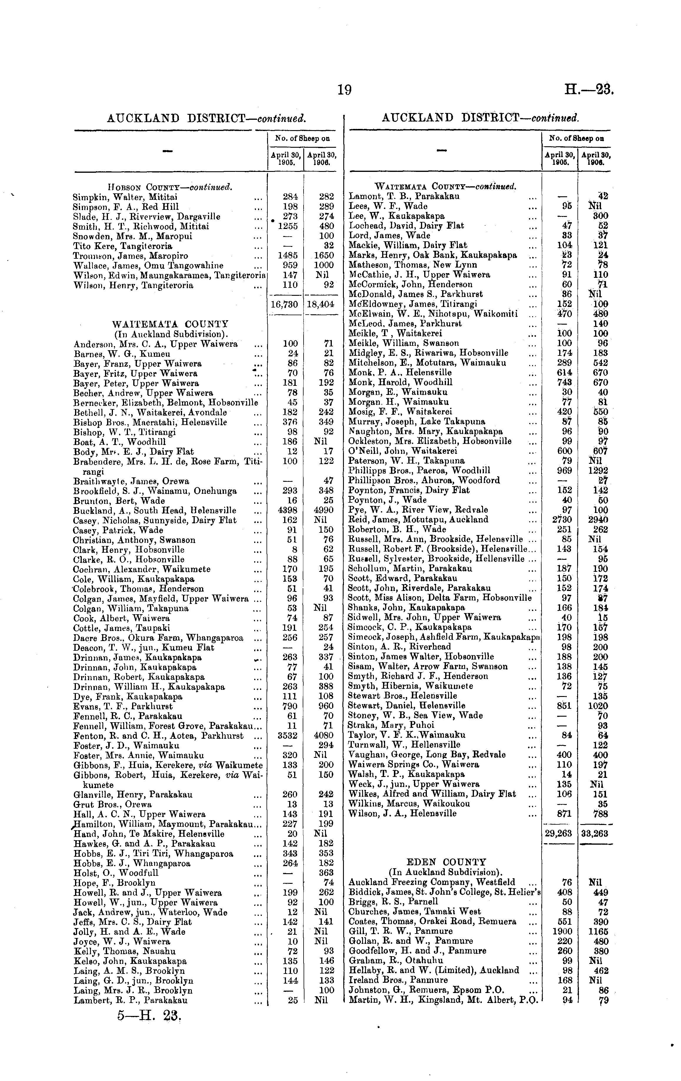 No. of Sheep on April 30, 1905. April 30, 1906. Hobson County— continued. Simpkin, Walter, Mititai Simpson, F. A., Red Hill Slade, H. J., Riverview, Dargaville Smith, H. T., Richwood, Mititai Snowden, Mrs. M., Maropui Tito Kere, Tangiteroria Trounson, James, Maropiro Wallace, James, Omu Tangowahine Wilson, Edwin, Maungakaramea, Tangiteroria Wilson, Henry, Tangitex-oria 284 198 . 273 1255 1485 959 147 110 282 289 274 480 100 32 1650 1000 Nil 92 16,730 18,404 WAITEMATA COUNTY (In Auckland Subdivision). Anderson, Mrs. C. A., Upper Waiwera Barnes, W. G., Kumeu Bayer, Franz, Upper Waiwera Bayer, Fritz, Upper Waiwera ".. Bayer, Peter, Upper Waiwera Becher, Andrew, Upper Waiwera Bernecker, Elizabeth, Belmont, Hobsonville Bethell, J. N., Waitakerei, Avondale Bishop Bros., Maeratahi, Helensville Bishop, W. T., Titirangi Boat, A. T., Woodhill Body, Mr,. E. J., Dairy Flat Brabendere, Mrs. L. H. de, Eose Farm, Titirangi Braithwayte, James, Orewa Brookfield, S. J., Wainamu, Onehunga Brunton, Bert, Wade Buckland, A., South Head, Helensville Casey. Nicholas, Sunnyside, Dairy Flat Casey, Patrick, Wade Christian, Anthony, Swanson Clark, Henry, Hobsonville Clarke, R. O., Hobsonville Cochran, Alexander, Waikumete Cole, William, Kaukapakapa Colebrook, Thomas, Henderson Colgan, James, Mayfield, Upper Waiwera ... Colgan, William, Takapuna Cook, Albert, Waiwera Cottle, James, Taupaki Dacre Bros., Okura Farm, Whangaparoa Deacon, T. W., jun., Kumeu Flat Drinnan, James, Kaukapakapa ... Drinnan, John, Kaukapakapa Drinnan, Robert, Kaukapakapa Drinnan, William H., Kaukapakapa Dye, Frank, Kaukapakapa Evans, T. ¥., Parkhurst Fennel 1, R. C, Parakakau Fennell, William, Forest Grove, Parakakau... Fenton, R. and C. II., Aotea, Parkhurst Foster, J. D., Waimauku Foster, Mrs. Annie, Waimauku Gibbons, F., Huia, Kerekere, via Waikumete Gibbons, Robert, Huia, Kerekere, via Waikumete Glanville, Henry, Parakakau Grut Bros., Orewa Hall, A. C. N., Upper Waiwera William, Maymount, Parakakau... Hand, John, Te Makire, Helensville Hawkes, G. and A. P., Parakakau Hobbs, E. J., Tiri Tiri, Whangaparoa Hobbs, E. J., Whangaparoa Hoist, O., Woodfull Hope, F., Brooklyn Howell, R. and J., Upper Waiwera Howell, W., jun., Upper Waiwera Jack, Andrew, jun., Waterloo, Wade Jeffs, Mrs. C. S., Dairy Flat Jolly, H. and A. E., Wade Joyce, W. J., Waiwera Kelly, Thomas, Nauahu Kelso, John, Kaukapakapa Laing, A. M. 8., Brooklyn Laing, G. D., jun., Brooklyn Laing, Mrs. J. R., Brooklyn Lambert, R. P., Parakakau 100 24 86 70 181 78 45 182 376 98 186 12 100 293 16 4398 162 91 51 8 88 170 153 51 96 53 74 191 256 263 77 67 263 111 790 61 11 3532 71 21 82 76 192 35 37 242 349 92 Nil 17 122 47 348 25 4990 Nil 150 76 62 65 195 70 41 93 Nil 87 254 257 24 337 41 100 388 108 960 70 71 4080 294 Nil 200 150 320 133 51 260 13 143 227 20 142 343 264 199 92 12 142 . 21 10 72 135 110 144 242 13 191 199 Nil 182 353 182 363 74 262 100 Nil 141 Nil Nil 93 146 122 133 100 Nil 25