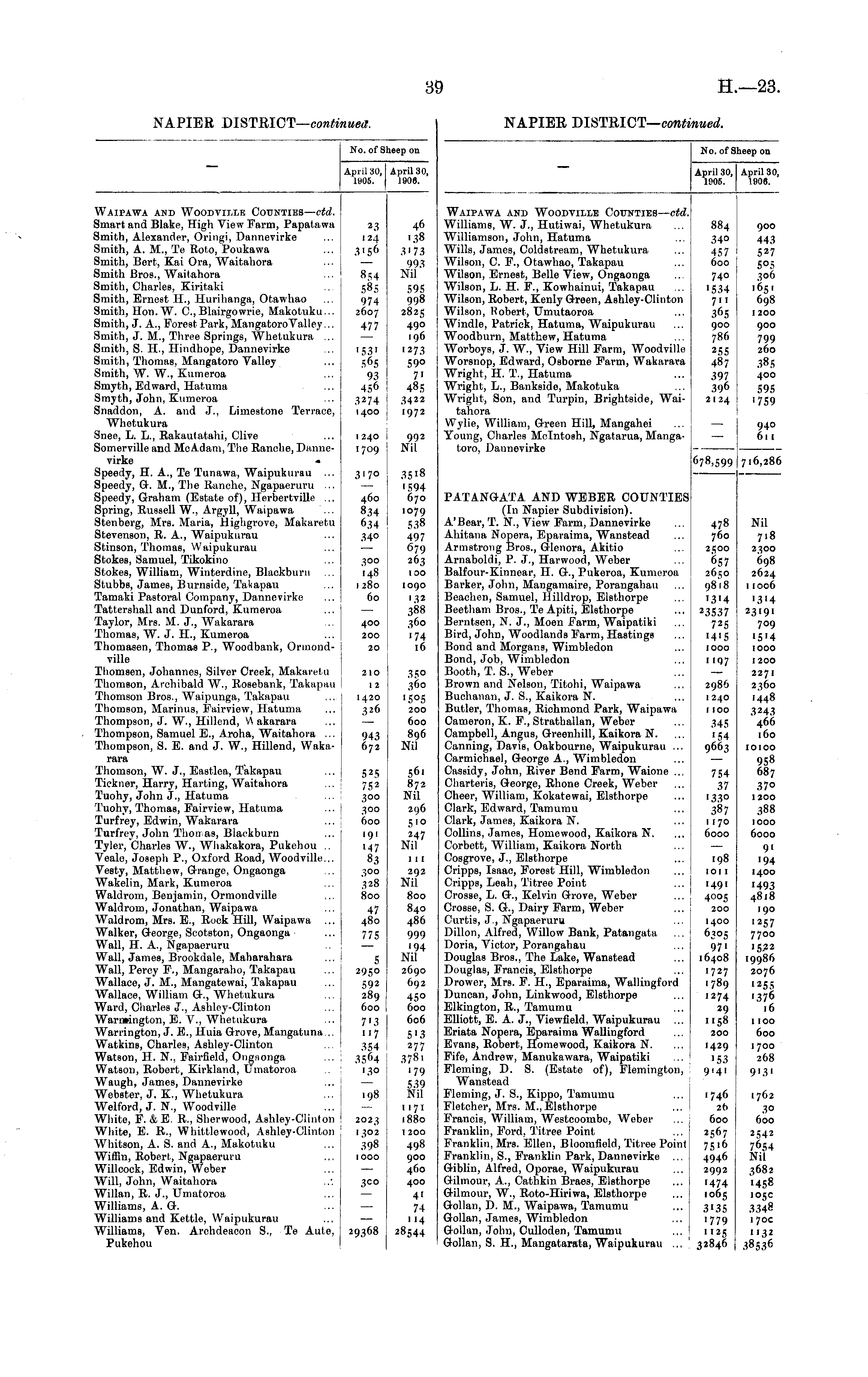 No. of Sheep on April 30, April 30, 1905. 1906. Waipawa and Woodville Counties — ctd. Williams, W. J., Hutiwai, Whetukura Williamson, John, Hatuma Wills, James, Coldstream, Whetukura Wilson, C. F., Otawhao, Takapau Wilson, Ernest, Belle View, Ongaonga Wilson, L. H. F., Kowhainui, Takapau Wilson, Eobert, Kenly Green, Ashley-Clinton Wilson, Robert, Umutaoroa Windle, Patrick, Hatuma, Waipukurau Woodburn, Matthew, Hatuma Worboys, J. W., View Hill Farm, Woodville Worsnop, Edward, Osborne Farm, Wakarara Wright, H. T., Hatuma Wright, L., Bankaide, Makotuka Wright, Son, and Turpin, Brightside, Waitahora Wylie, William, Green Hill, Mangahei Young, diaries Mcintosh, Ngatarua, Mangatoro, Dannevirke 884 340 457 ■ 600 740 '534 7" 365 900 786 255 487 397 396 2124 90O 443 527 505 306 165, 698 1200 900 799 260 38.5 400 595 '759 940 611 678,599 1 716,281 1 PATANGATA AND WEBER COUNTIES (In Napier Subdivision). A'Bear, T. N., View Farm, Dannevirke Ahitana Nopera, Eparaima, Wanstead Armstrong Bros., Glenora, Akitio Arnaboldi, P. J,, Harwood, Weber Balfour-Kinnear, H. G., Pukeroa, Kumeroa Barker, John, Mangamaire, Porangahau Beachen, Samuel, Hilldrop, Elsthorpe Beetham Bros., TeApiti, Elsthorpe Berntsen, N. J., Moen Farm, Waipatiki Bird, John, Woodlands Farm, Hastings Bond and Morgans, Wimbledon Bond, Job, Wimbledon Booth, T. S., Weber Brown and Nelson, Titohi, Waipawa Buchanan, J. S., Kaikora N. Butler, Thomas, Eichmond Park, Waipawa Cameron, K. F., Strathallan, Weber Campbell, Angus, Greenhill, Kaikora N. Canning, Davis, Oak bourne, Waipukurau ... Carmichael, George A., Wimbledon Cassidy, John, Eiver Bend Farm, Waione ... Charteris, George, Ehone Creek, Weber Cheer, William, Kokatewai, Elsthorpe Clark, Edward, Tamumu Clark, James, Kaikora N. Collins, James, Homewood, Kaikora N. Corbett, William, Kaikora North Cosgrove, J., Elsthorpe Cripps, Isaac, Forest Hill, Wimbledon Cripps, Leah, Titree Point Crosse, L. G., Kelvin Grove, Weber Crosse, S. G., Dairy Farm, Weber Curtis, J, Ngapaeruru Dillon, Alfred, Willow Bank, Patangata Doria, Victor, Porangahau ... Douglas Bros., The Lake, Wanstead ... I Douglas, Francis, Elsthorpe ... Drower, Mrs. F. H., Eparaima, Wallingford Duncan, John, Linkwood, Elsthorpe Elkington, E., Tamumu Elliott, E. A. J., Viewfield, Waipukurau ... Eriata Nopera, Eparaima Wallingford Evans, Eobert, Homewood, Kaikora N. Fife, Andrew, Manukawara, Waipatiki Fleming, D. S. (Estate of), Flemington, Wanstead Fleming, J. S., Kippo, Tamumu ... Fletcher, Mrs. M.,Elsthorpe ... I Francis, William, Westcoombe, Weber ... Franklin, Ford, Titree Point ... ! Franklin, Mrs. Ellen, Bloomfield, Titree Point Franklin, S., Franklin Park, Dannevirke ... Giblin, Alfred, Oporae, Waipukurau Gilmour, A., Cathkin Braes, Elsthorpe Gilmour, W., Eoto-Hiriwa, Elsthorpe Gollan, D. M., Waipawa, Tamumu Gollan, James, Wimbledon Gollan, John, Culloden, Tamumu Gollan, S. H., Mangatarata, Waipukurau ... ' 478 760 2500 657 2650 9818 1314 23537 725 '4'5 1000 1197 2986 1240 1100 345 '54 9663 754 37 387 1170 6000 198 1011 1491 4005 200 Nil 7.8 2300 698 2624 11006 '3'4 23191 709 '5'4 1000 1200 2271 2360 1448 3243 466 160 10100 958 687 370 1200 388 1000 6000 9' '94 1400 '493 4818 190 '257 7700 1522 19986 2076 •255 '376 16 1400 6305 97' 16408 1727 1789 1274 29 1158 200 •429 '53 9141 1100 600 1700 268 9'3' 1746 26 600 25 6 7 75i6 4946 2992 '474 1065 3'35 '779 1125 32846 1762 30 600 2542 7654 Nil 3682 '458 105c 3348 170c 1132 38536