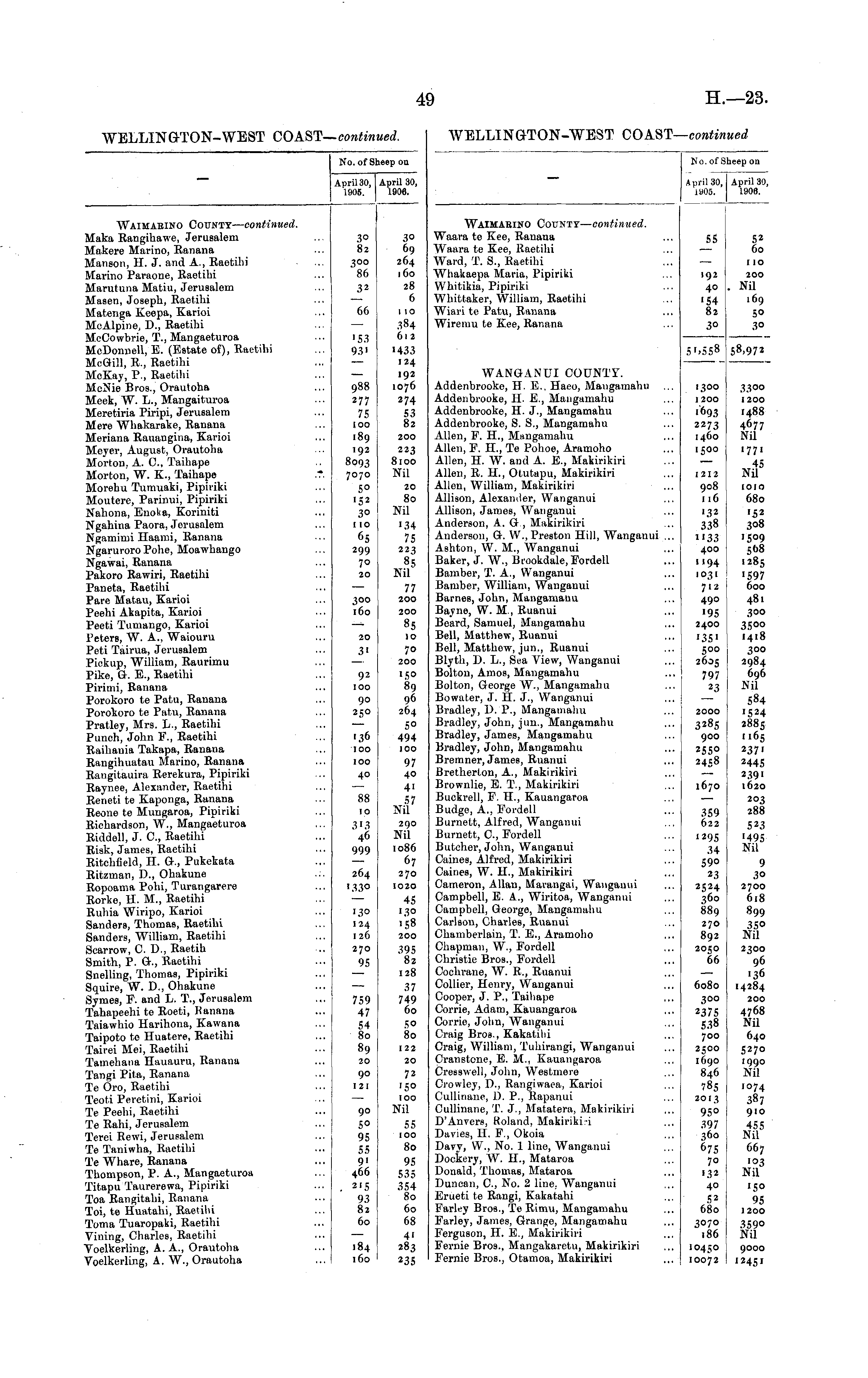 No. of Sheep on April 30, April 30, 1905. 1908. Waimabino County— continued. Maka Eangihawe, Jerusalem Makere Marino, Banana Manson, H. J. and A., Eaetihi Marino Paraone, Eaetihi Marutuna Matiu, Jerusalem Masen, Joseph, Eaetihi Matenga Keepa, Karioi McAlpine, D., Eaetihi McCowbrie, T., Mangaeturoa McDonnell, E. (Estate of), Eaetihi McGill, E., Eaetihi McKay, P., Eaetihi McNie Bros., Orautoha Meek, W. L., Mangaituroa Meretiria Piripi, Jerusalem Mere Whakarake, Banana Meriana Eauangina, Karioi Meyer, August, Orautoha Morton, A. C, Taihape Morton, W. K., Taihape Morehu Tumuaki, Pipiriki Moutere, Parinui, Pipiriki Nahona, Enoka, Koriniti Ngahina Paora, Jerusalem Ngamimi Haami, Banana Ngaruroro Pohe, Moawhango Ngawai, Banana Pakoro Eawiri, Eaetihi Paneta, Eaetihi Pare Matau, Karioi Peehi Akapita, Karioi Peeti Tumango, Karioi Peters, W. A., Waiouru Peti Tairua, Jerusalem Pickup, William, Eaurimu Pike, G. E., Eaetihi Pirimi, Banana Porokoro te Patu, Ranana Porokoro te Patu, Banana Pratley, Mrs. L., Eaetihi Punch, John F., Eaetihi Eaihania Takapa, Banana Eangihuatau Marino, Banana Eangitauira Eerekura, Pipiriki Eaynee, Alexander, Eaetihi Eeneti te Kaponga, Banana Eeone te Mungaroa, Pipiriki Eichardson, W., Mangaeturoa Biddell, J. C, Raetihi Risk, James, Raetihi Eitchfield, II. G., Pukekata Bitzman, D., Ohakune Bopoama Pohi, Turangarere Eorke, H. M., Raetihi Ruhia Wiripo, Karioi Sanders, Thomas, Eaetihi Sanders, William, Eaetihi Scarrow, C. D., Baetih Smith, P. G., Eaetihi Snelling, Thomas, Pipiriki Squire, W. D., Ohakune Symes, F. and L. T., Jerusalem Tahapeehi te Eoeti, Banana Taiawhio Harihona, Kawana Taipoto to Huatere, Eaetihi Tairei Mei, Eaetihi Tamehana Hauauru, Banana Tangi Pita, Banana Te Oro, Eaetihi Teoti Peretini, Karioi Te Peehi, Eaetihi Te Rahi, Jerusalem Terei Bewi, Jerusalem Te Taniwha, Eaetihi Te Whare, Eanana Thompson, P. A., Mangaeturoa Titapu Taurerewa, Pipiriki Toa Eangitahi, Banana Toi, te Huatahi, Eaetihi Toma Tuaropaki, Eaetihi Vining, Charles, Eaetihi Voelkerling, A. A., Orautoha Voelkerling, A. W., Orautoha 30 82 300 86 32 66 153 93' 988 277 75 100 189 192 8093 7070 50 152 30 110 65 299 70 20 300 160 20 3' 92 100 90 250 136 100 30 69 264 160 28 6 1 10 384 61 2 '433 124 192 1076 274 53 82 200 223 8100 Nil 20 80 Nil '34 75 223 85 Nil 77 200 200 85 10 70 200 150 89 96 264 5° 494 100 97 40 4' 57 Nil 100 40 88 10 3'3 46 999 264 1330 290 Nil 1086 67 270 1020 130 124 126 45 130 158 200 270 95 395 82 128 759 47 54 80 89 20 90 121 37 749 60 50 80 122 20 72 '5° 100 Nil 9° 5° 95 55 9' 466 . 215 93 82 60 55 100 80 95 535 354 80 60 68 184 160 4' 283 235