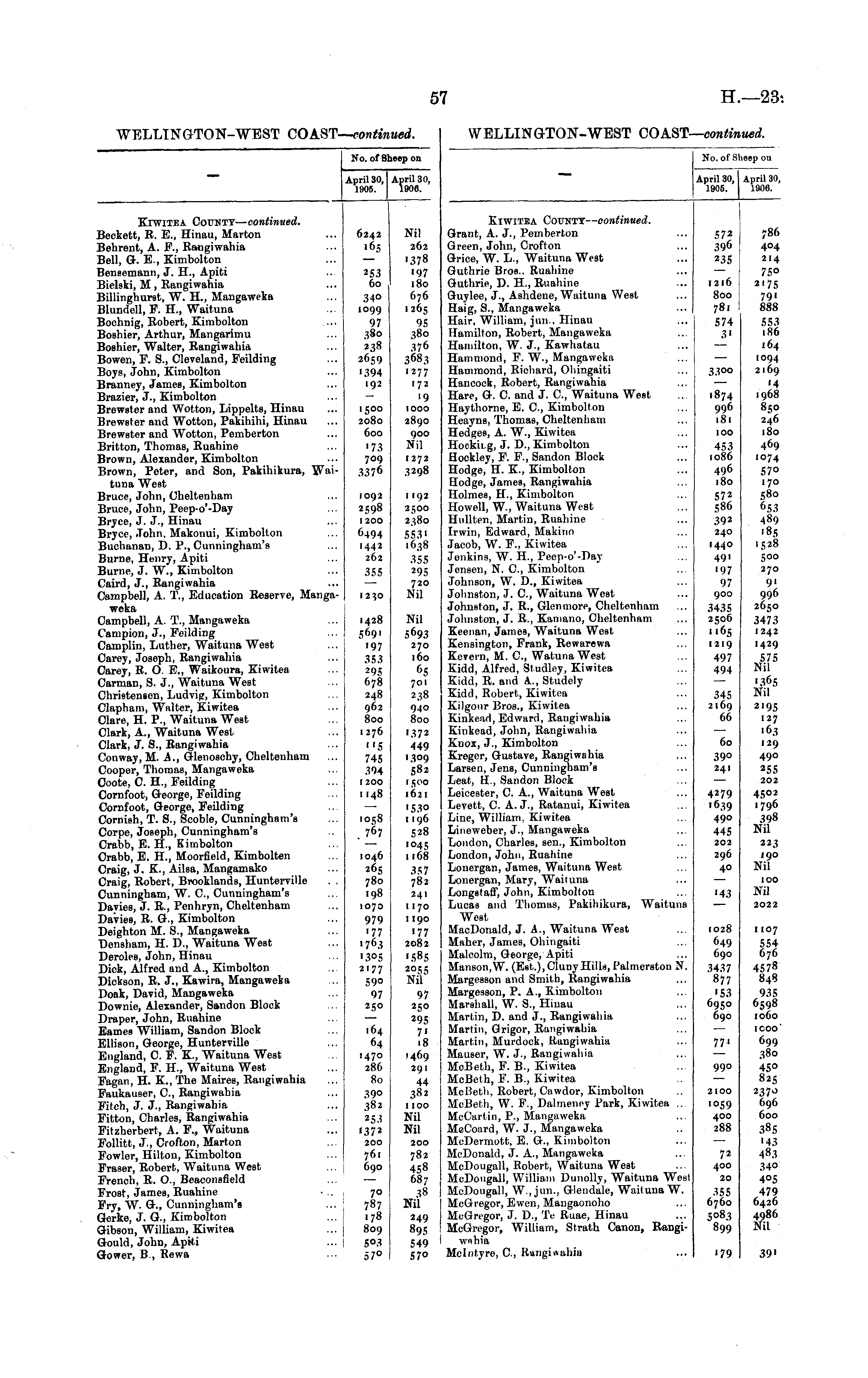 No. of Sheep on April 30, 1905. April 30, 1906. Kiwitea County— continued. Grant, A. J., Pemberton Green, John, Crofton Grice, W. L., Waituna West Guthrie Bros.. Ruahine Guthrie, D. H., Euahine Guylee, J., Ashdene, Waituna West Haig, S., Mangaweka Hair, William, jun., Hinau Hamilton, Eobert, Mangaweka Hamilton, W. J., Kawhatau Hammond, F. W., Mangaweka Hammond, Eichard, Ohingaiti Hancock, Eobert, Bangiwahia Hare, G. C. and J. C, Waituna West Haythorne, E. C, Kimbolton Heayns, Thomas, Cheltenham Hedges, A. W., Kiwitea Hockii.g, J. D., Kimbolton Hockley, F. F., Sandon Block Hodge, H. K, Kimbolton Hodge, James, Bangiwahia Holmes, H, Kimbolton Howell, W., Waituna West Hullten, Martin, Euahine Irwin, Edward, Makino Jacob, W. F., Kiwitea Jenkins, W. II., Peep-o'-Day Jensen, N. C, Kimbolton Johnson, W. D., Kiwitea Johnston, J. C, Waituna West Johnston, J. E., Glenmore, Cheltenham Johnston, J. E., Kamano, Cheltenham Keenan, James, Waituna West Kensington, Frank, Bewarewa Kevern, M. C, Watuna West Kidd, Alfred, Studley, Kiwitea Kidd, B. and A., Studely Kidd, Bobert, Kiwitea Kilgour Bros., Kiwitea Kinkead, Edward, Bangiwahia Kinkead, John, Bangiwahia Knox, J., Kimbolton Kreger, Gustave, Bangiwahia Larsen, Jens, Cunningham's Leaf, H., Sandon Block Leicester, C. A., Waituna West Levett, C. A. J., Eatanui, Kiwitea Line, William, Kiwitea Lineweber, J., Mangaweka London, Charles, sen., Kimbolton London, John, Euahine Lonergan, James, Waituna West Lonergan, Mary, Waituna Longstaff, John, Kimbolton Lucas and Thomas, Pakihikura, Waituna West MacDonald, J. A., Waituna West Maher, James, Ohingaiti Malcolm, George, Apiti Manson.W. (Est.),Cluny Hills, Palmerston N. MargeaBOn and Smith, Bangiwahia Margesson, P. A., Kimbolton Marshall, W. S., Hinau Martin, D. and J., Bangiwahia Martin, Grigor, Bangiwahia Martin, Murdock, Bangiwahia Mauser, W. J., Bangiwahia McBeth, F. B., Kiwitea McBeth, F. B., Kiwitea McBeth, Eobert, Cawdor, Kimbolton McBeth, W. F., Dalmeney Park, Kiwitea ... McCartin, P., Mangaweka MeCoard, W. J., Mangaweka McDermott, E. G., Kimbolton McDonald, J. A., Mangaweka McDougall, Robert, Waituna WeBt McDougall, William Dunolly, Waituna West McDougall, W.,jun., Glendale, Waituna W. McG regor, E wen, Mangaonoho McGregor, J. D., Te Ruae, Hinau McGregor, William, Strath Canon, Rangiwahia Mclntyre, C, Rangiivahia 572 396 235 I2l6 8oo 78. 574 31 330o .874 996 181 100 453 1086 496 180 572 586 392 240 1440 49' '97 97 900 343S 2506 "65 1219 497 494 345 2169 66 60 786 404 214 750 2'75 79' 888 553 186 164 1094 2169 '4 1968 850 246 180 469 1074 570 170 580 6.53 489 .85 1528 500 270 9' 996 2650 3473 1242 1429 575 Nil '365 Nil 2195 127 163 129 490 255 202 4502 1796 398 Nil 39° 241 4279 '639 490 445 202 296 40 223 190 Nil '43 100 Nil 2022 1028 649 690 3437 877 'S3 6950 690 1107 554 676 4578 848 935 6598 1060 77' 990 2100 '059 400 288 I coo 699 380 450 825 2370 696 600 38s '43 483 340 405 479 6426 4986 Nil 72 400 20 355 6760 5083 899 179 39'
