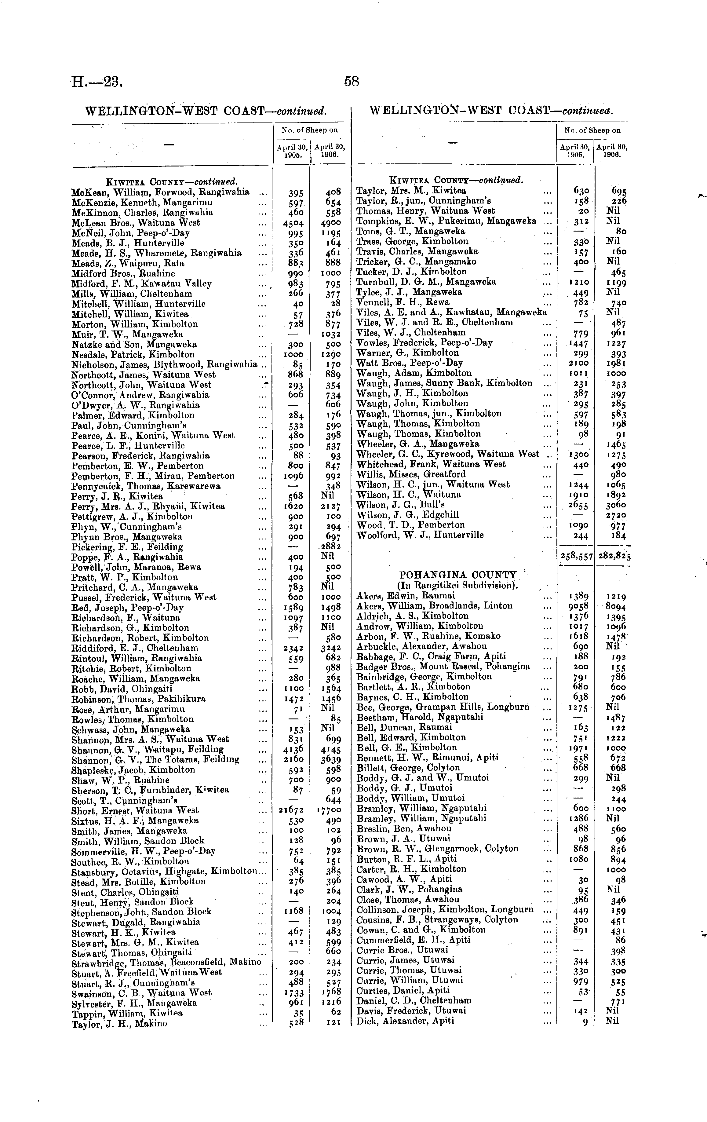 No. of Sheep on April :10, April 30, 1905. 1906. Kiwitea County— continued. Taylor, Mrs. M., Kiwitea Taylor, E., jun., Cunningham's Thomas, Henry, Waituna West Tompkins, E. W., Pukerimu, Mangaweka ... Toms, G. T., Mangaweka Trass, George, Kimbolton Travis, Charles, Mangaweka Tricker, G. C, Mangamako Tucker, D. J., Kimbolton Turnbull, D. G. M., Mangaweka Tylee, J. J., Mangaweka Vennell, F. H., Eewa Viles, A. E. and A., Kawhatau, Mangaweka Viles, W. J. and B. E., Cheltenham Viles, W. J., Cheltenham Vowles, Frederick, Peep-o'-Day Warner, G., Kimbolton Watt Bros., Peep-o'-Day Waugh, Adam, Kimbolton Waugh, James, Sunny Bank, Kimbolton ... Waugh, J. H, Kimbolton Waugh, John, Kimbolton Waugh, Thomas, jun., Kimbolton Waugh, Thomas, Kimbolton Waugh, Thomas, Kimbolton Wheeler, G. A., Mangaweka Wheeler, G. G, Kyrewood, Waituna West .. Whitehead, Frank, Waituna West Willis, Misses, Greatford Wilson, H. C, jun., Waituna West Wilson, H. C, Waituna Wilson, J. G., Bull's Wilson, J. G., Edgehill Wood, T. D., Pemberton Woolford, W. J., Hunterville 630 158 20 312 33o •57 400 1210 449 782 75 779 •447 299 2100 695 226 Nil Nil 80 Nil 160 Nil 465 ••99 Nil 740 Nil 487 961 1227 393 1981 1000 253 397 285 583 198 9i '465 •275 490 980 1065 1892 3060 2720 977 184 282,825 1011 231 387 295 597 189 1 S 1300 440 1244 1910 . 2655 1090 244 258,557 POHANGINA COUNTY (In Eangitikei Subdivision). > Akers, Edwin, Eaumai ... Akers, William, Broadlands, Linton ... Aldrich, A. S., Kimbolton Andrew, William, Kimbolton Arbon, F. W , Euahine, Komako Arbuckle, Alexander, Awahou Babbage, F. C, Craig Farm, Apiti Badger Bros., Mount Bascal, Pohangina Bainbridge, George, Kimbolton Bartlett, A. E., Kimboton Baynes, C. H, Kimbolton Bee, George, Grampan Hills, Longburn Beetham, Harold, Ngaputahi Bell, Duncan, Baumai Bell, Edward, Kimbolton Bell, G. E., Kimbolton Bennett, H. W., Bimunui, Apiti Billet!, George, Colyton Boddy, G. J. and W., Umutoi Boddy, G. J., Umutoi Boddy, William, Umutoi Bramley, William, Ngaputahi Bramley, William, Ngaputahi Breslin, Ben, Awahou Brown, J. A , Utuwai Brown, B. W., Glengarnock, Colyton Burton, R. F. L., Apiti Carter, E. H., Kimbolton Cawood, A. W., Apiti Clark, J. W., Pohangina Close, Thomas, Awahou Collinson, Joseph, Kimbolton, Longburn ... Cousins, F. B., Strangeways, Colyton Cowan, C. and G., Kimbolton Cummerfield, E. H, Apiti Currie Bros., Utuwai Currie, James, Utuwai Currie, Thomas, Utuwai Currie, William, Utuwai Curtles, Daniel, Apiti Daniel, C. D., Cheltenham Davis, Frederick, Utuwai Dick, Alexander, Apiti 1389 9058 1376 1017 1618 690 188 200 79i 680 638 •275 .63 75i 1971 558 668 299 - 600 1286 488 98 868 1080 1219 8094 '395 1096 1478 Nil 192 '55 786 600 706 Nil .487 122 1222 1000 672 668 Nil 298 244 1100 Nil 560 96 856 894 1000 98 Nil 346 •59 45' 43' 86 398 33S 300 525 55 77' Nil Nil 30 95 386 449 3°o 891 344 330 979 53 142 9